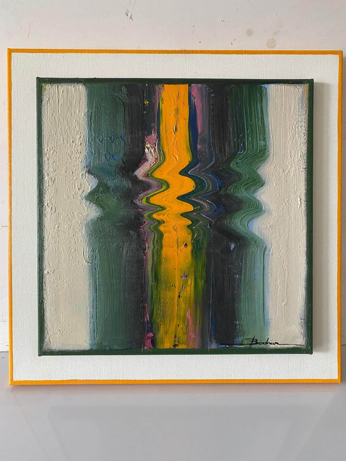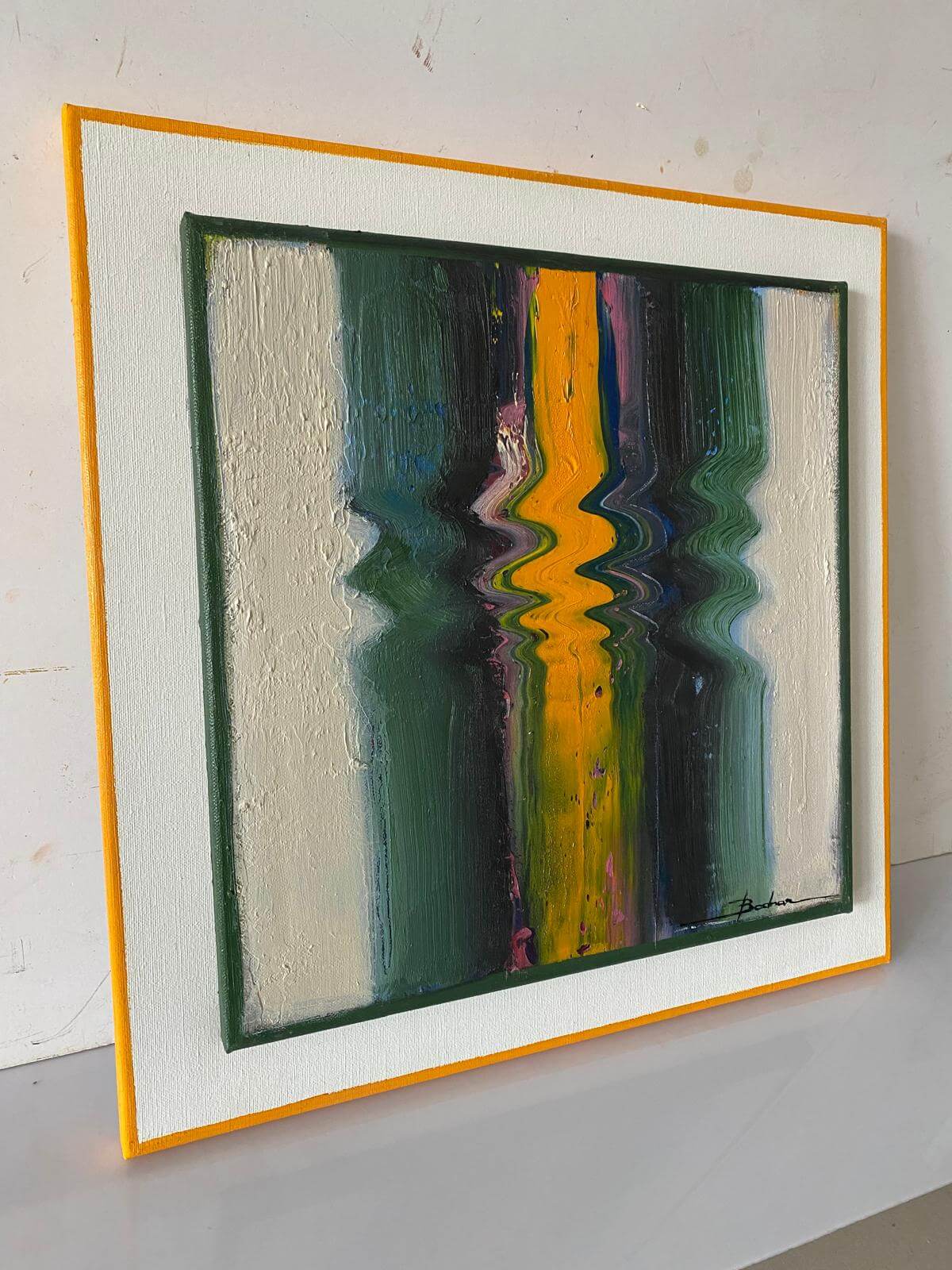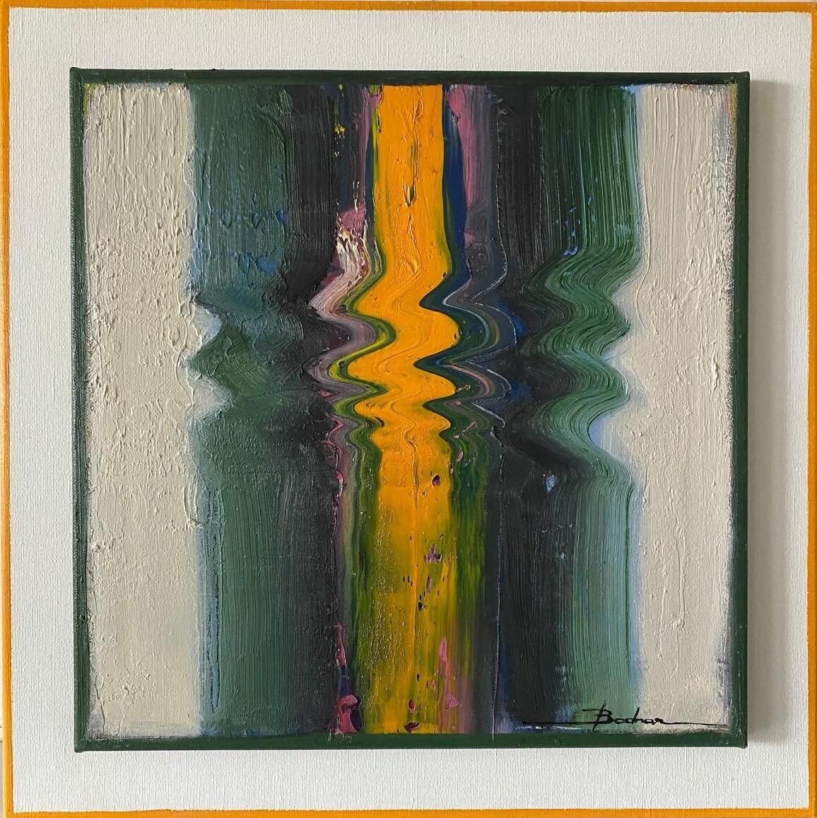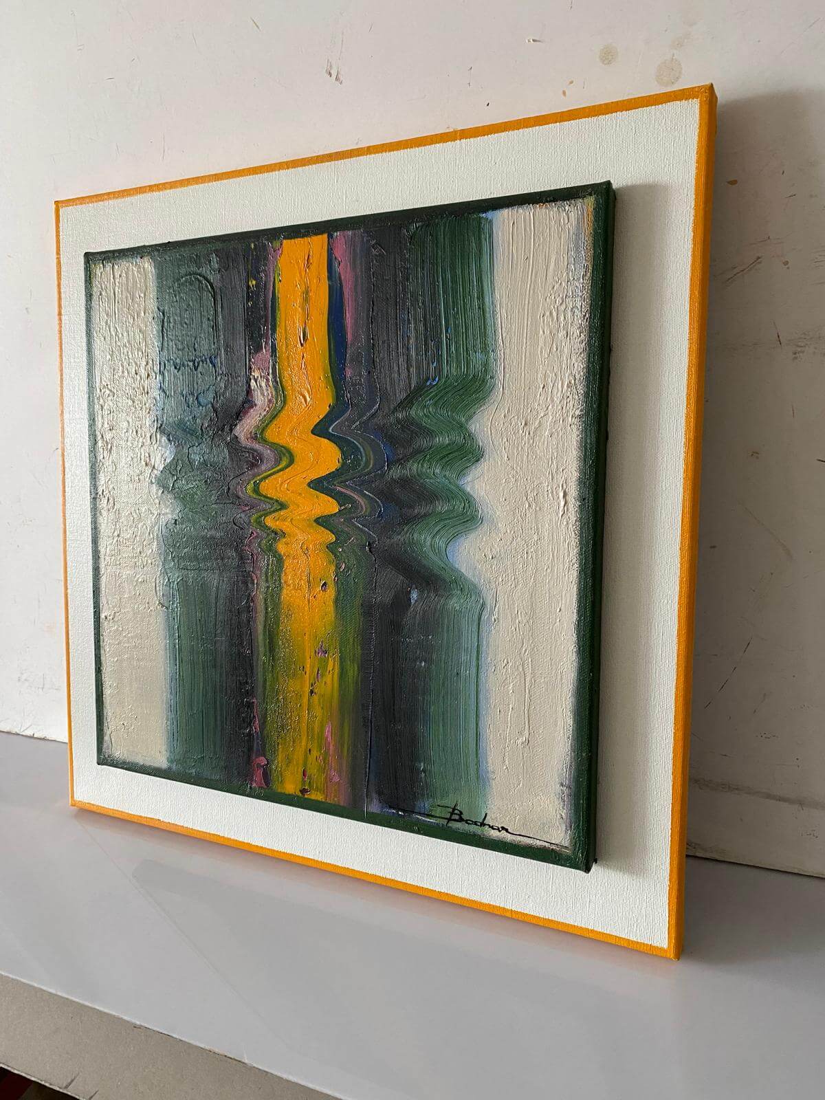 Obraz pracuje s jednoduchou, ale velmi silnou kompozicí. Dominantním prvkem je vertikální pruh táhnoucí se středem plátna, který vyzařuje energii a určuje vizuální osu díla. Tento centrální pruh nese syté tóny žluté, oranžové a zelené barvy, místy se prolíná s akcenty fialové a modré. Barvy ve střední části zvlňují a deformují, čímž vytvářejí dojem pohybu, vibrací a pulzující energie.