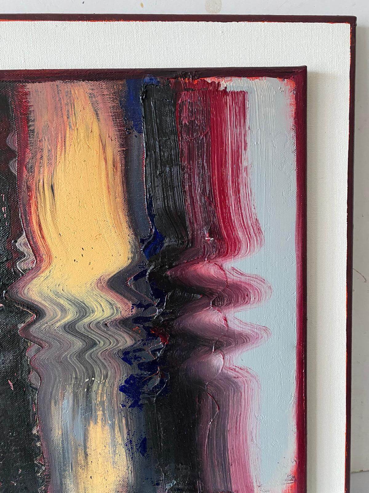 Dominantním prvkem je vertikální pruh táhnoucí se středem plátna, který vyzařuje energii a určuje vizuální osu díla. Tento centrální pruh nese syté tóny žluté, fialové a černé barvy, místy se prolíná s akcenty růžové a tmavě zelené. Barvy ve střední části zvlňují a deformují, čímž vytvářejí dojem pohybu, vibrací a pulzující energie.