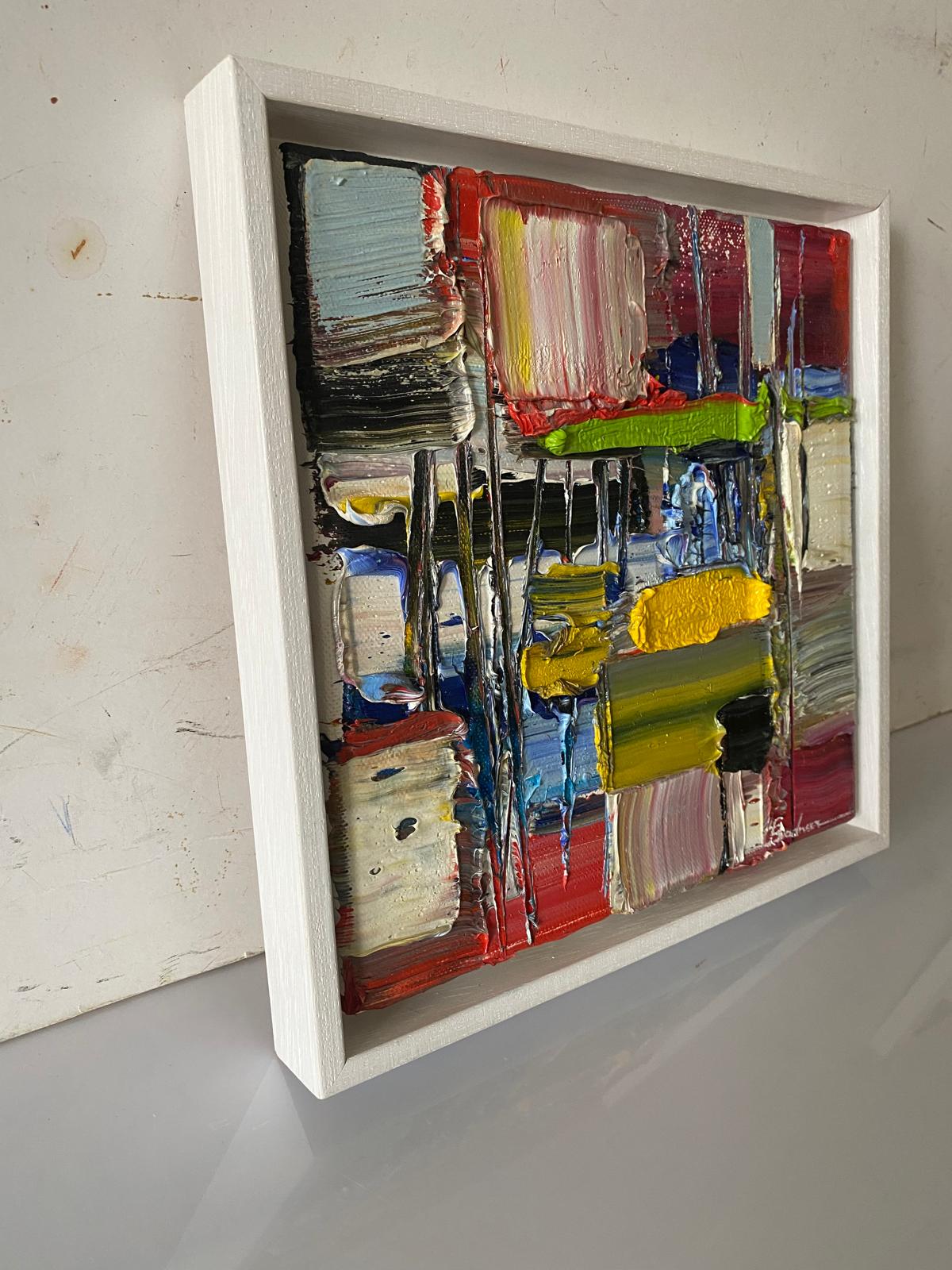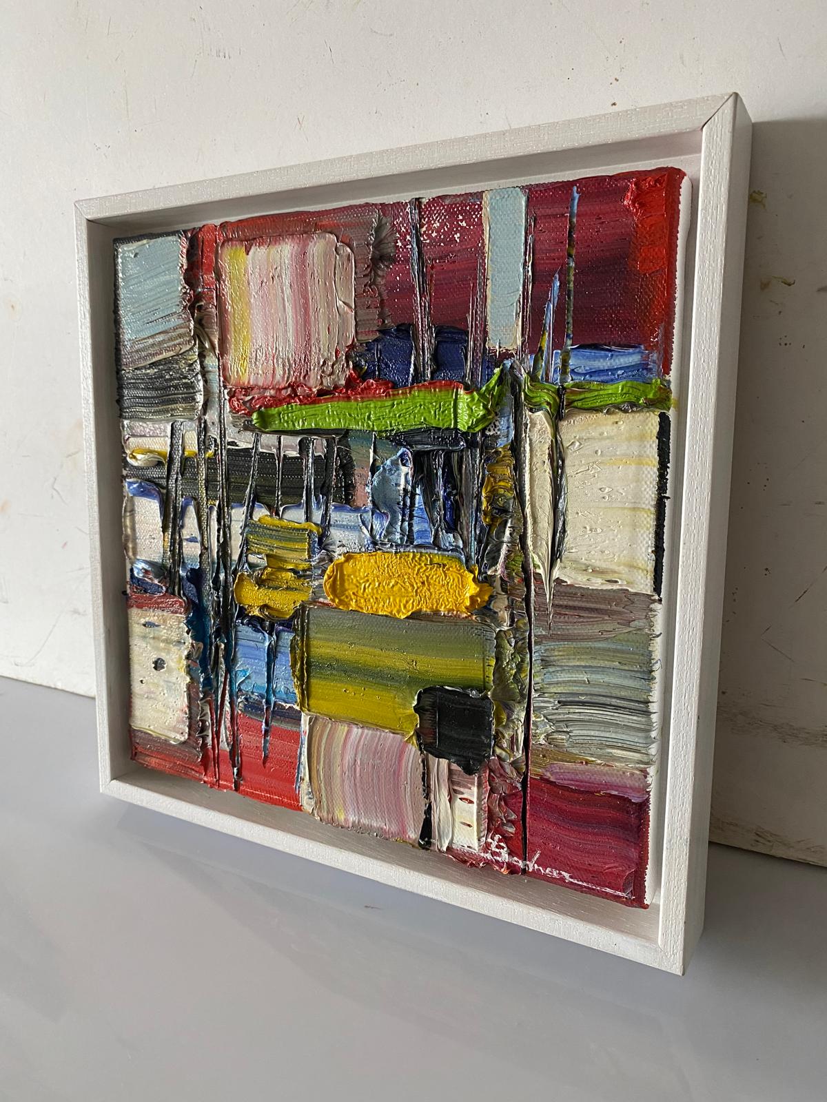 Barevná škála opět přináší silný kontrast. Dominantní tóny žluté, červené a zelené se střídají s klidnějšími bílými, šedými a modrými plochami. Žlutá barva funguje jako výrazný akcent a téměř světelný zdroj, který okamžitě přitahuje pozornost. Zelený pruh v horní části obrazu vnáší do kompozice svěžest a zároveň odděluje dvě barevné vrstvy: sytě červené pozadí nahoře a strukturovanější kombinace dole.