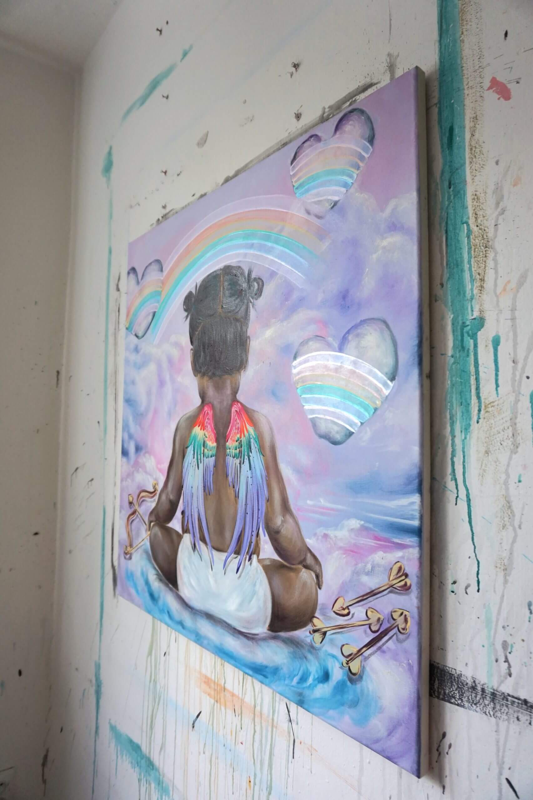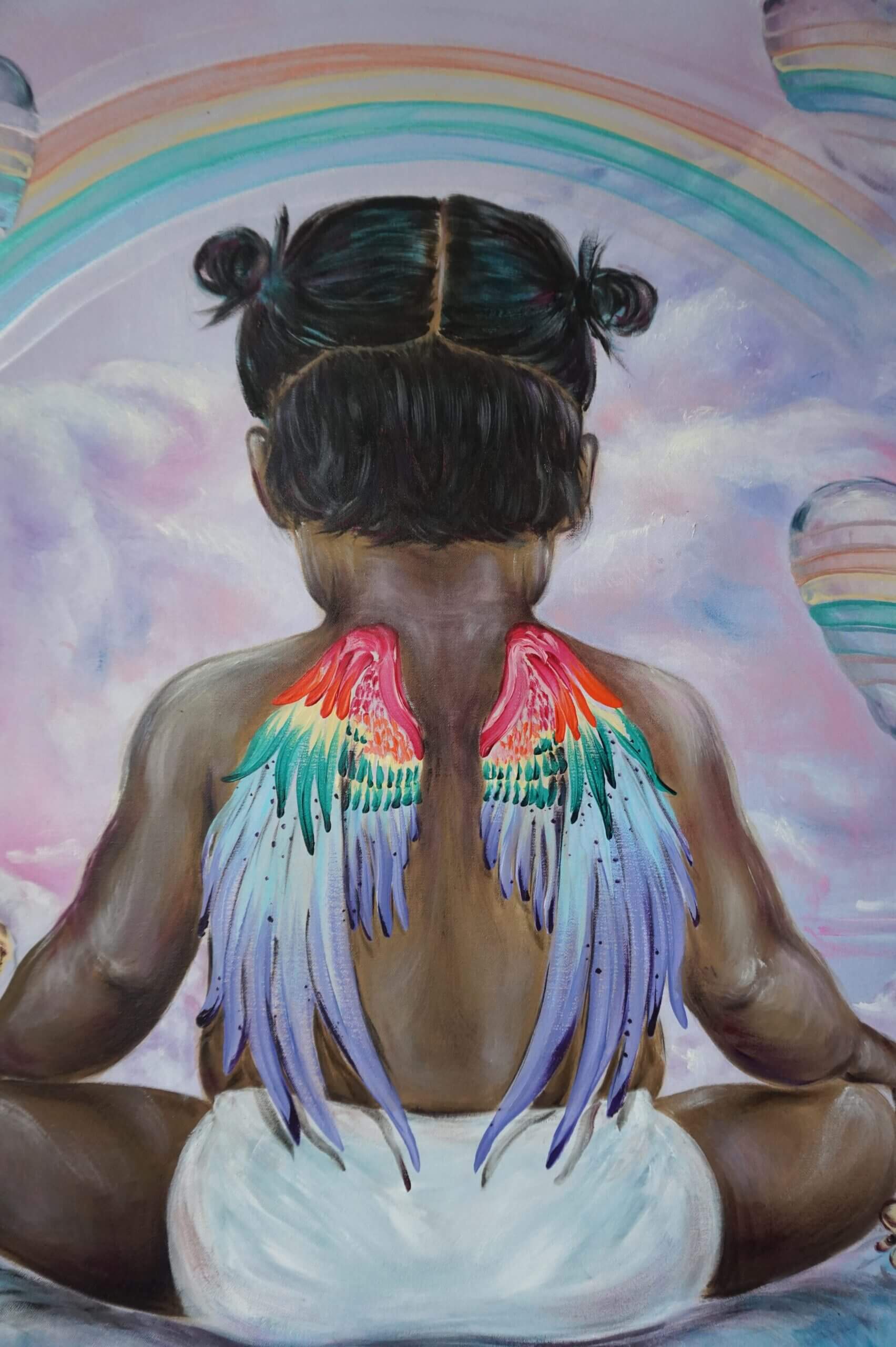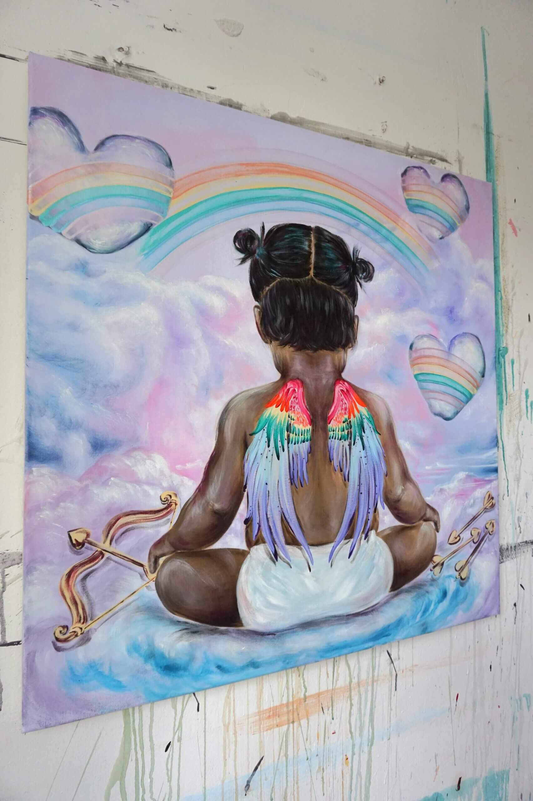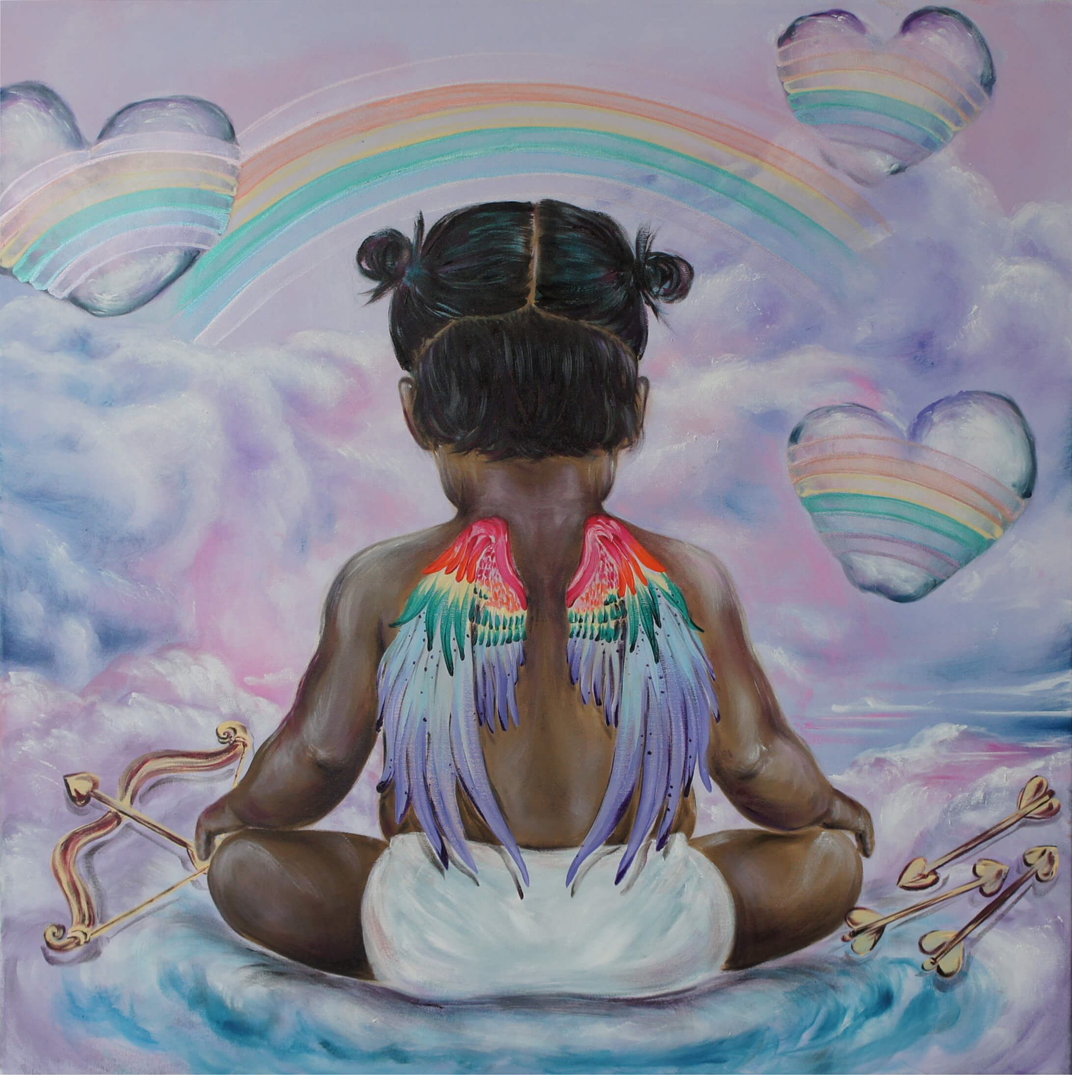 Obraz zobrazuje dítě s křídly, sedící v klidném prostředí a obklopené jemnými pastelovými barvami a symboly lásky. Divák může vnímat detaily od jemných křídel po srdce, které dítě drží v rukou. Motiv vyvolává pocity klidu, něžnosti a lásky.