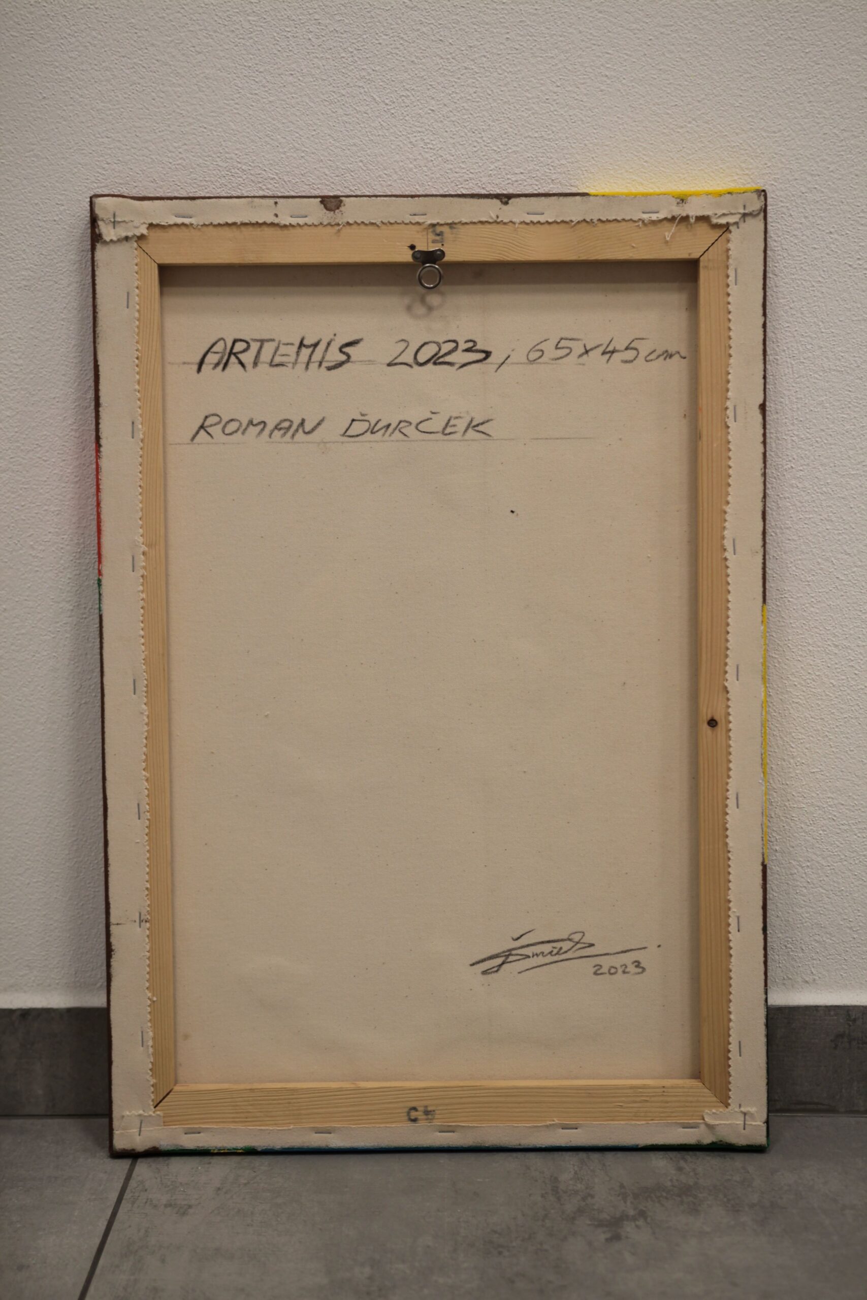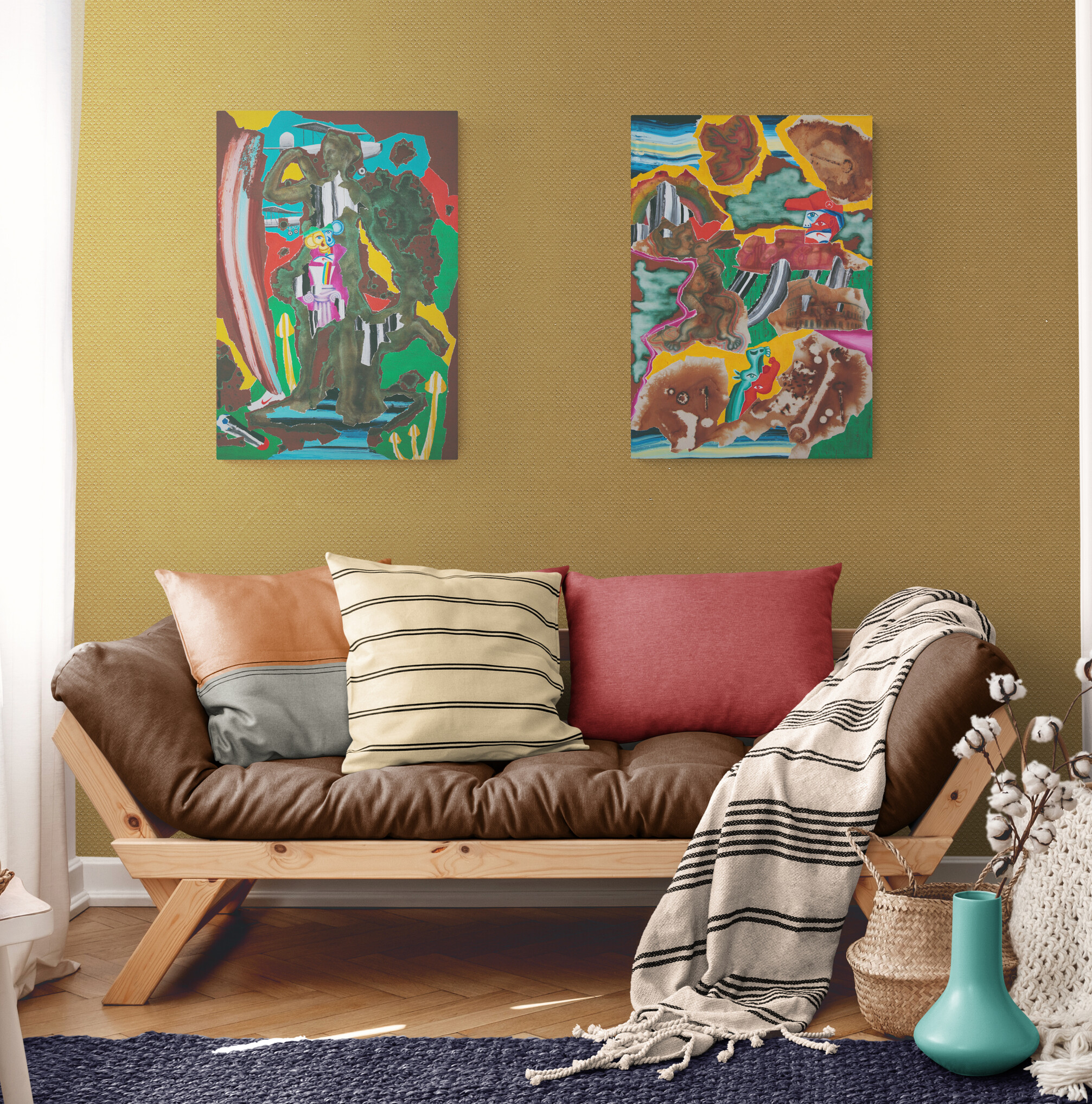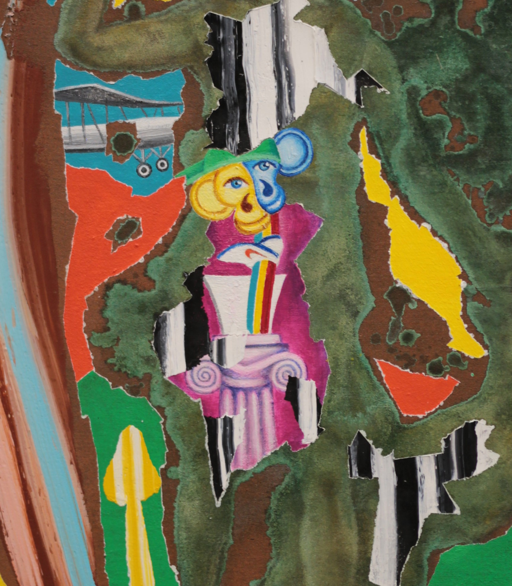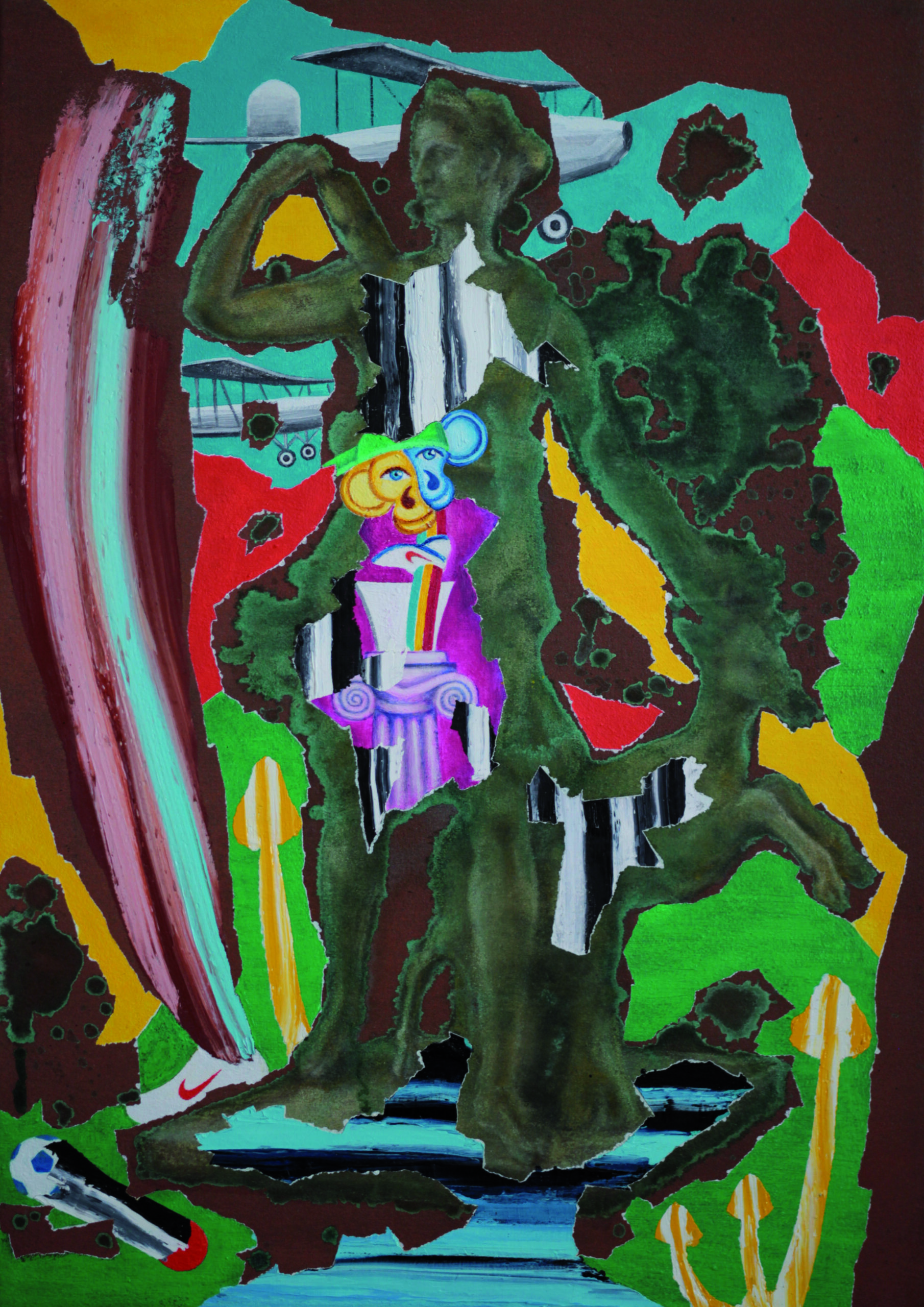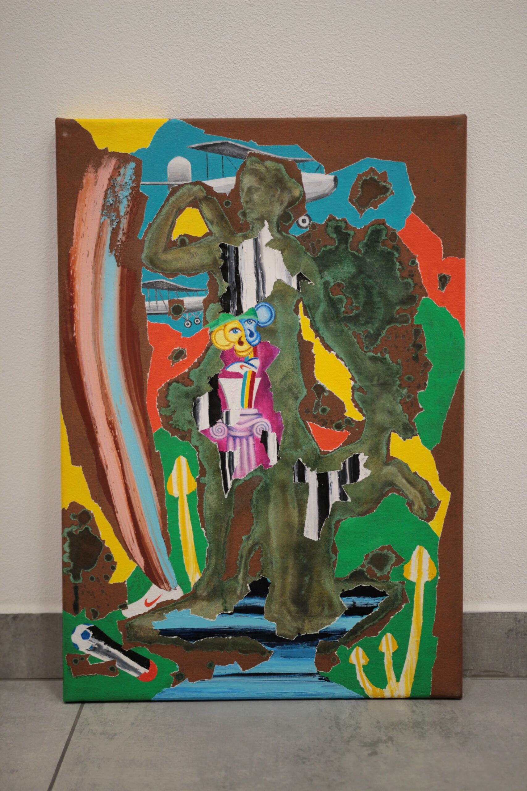 Toto dynamické dílo zobrazuje zajímavý kontrast mezi abstraktními prvky a paletou živých barev. V jeho jádru stojí dynamická silueta připomínající klasickou sochu, která je dekonstruována prostřednictvím kontrastních pruhů a odstínů. Postava je obklopena bujným zeleným pozadím, zvýrazněným odvážnými skvrnami červené, modré a oranžové. Tento vrstvený efekt vytváří vizuálně stimulující hloubku.