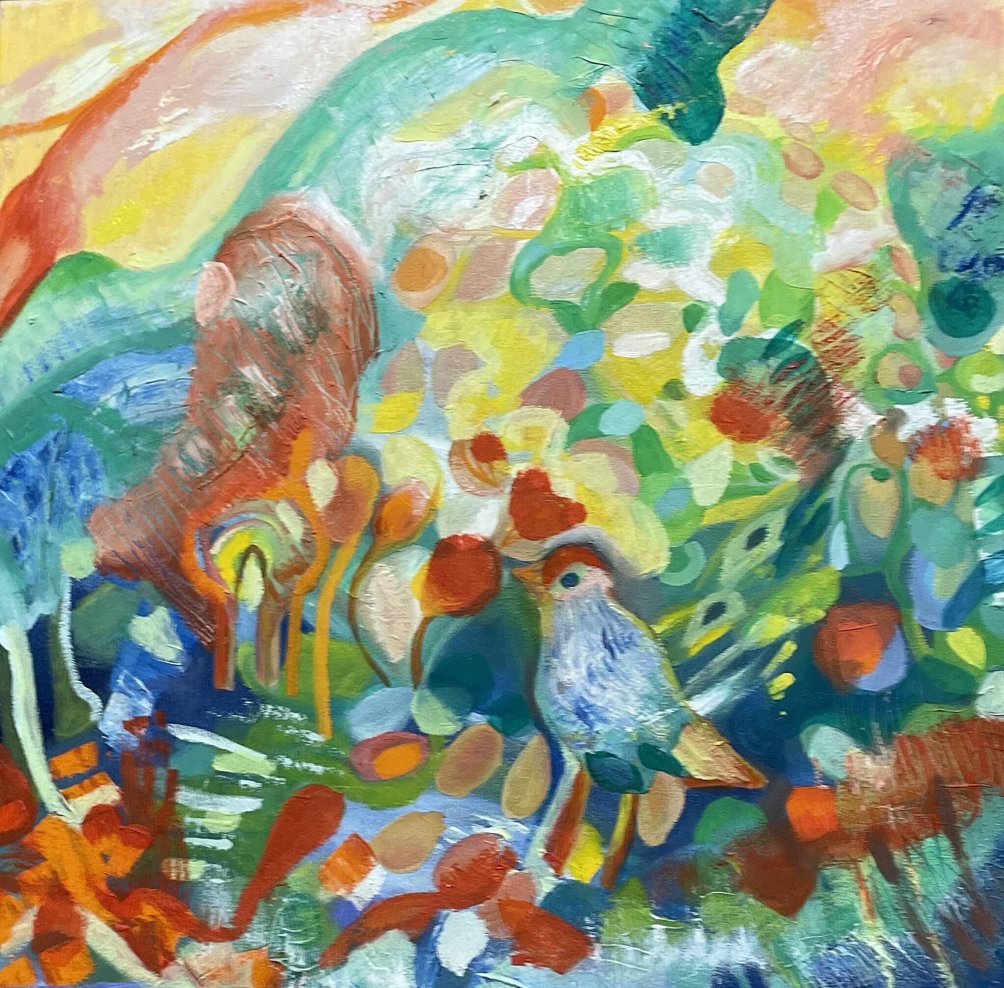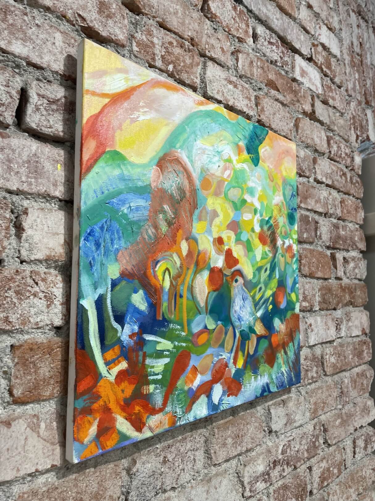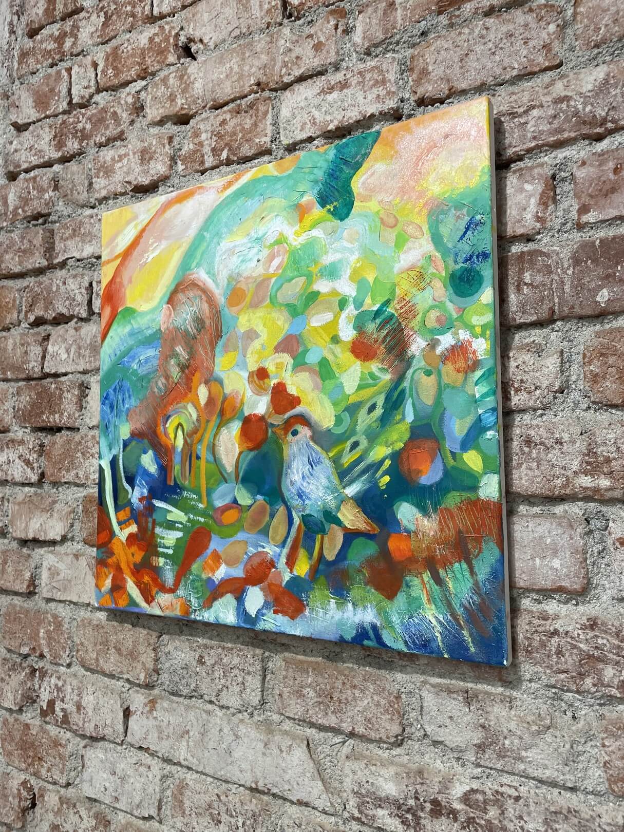 Obraz je oslavou zářivých barev a plynulých forem, mistrně propojující abstrakci s občasnými náznaky rozpoznatelných motivů. Dílu dominuje symfonie zelené, modré, červené a žluté, dokonale propletené do bujné, téměř nadpozemské krajiny. V samém středu plátna stojí jediný pták, který se stává ústředním bodem uprostřed výbuchu barev. Pták, ztvárněný v jemných tónech modré a šedé, přináší tichý kontrast k pulzujícím odstínům, které ho obklopují. Jeho přítomnost vyzařuje klid a vnáší do malby pocit harmonie a rovnováhy.
