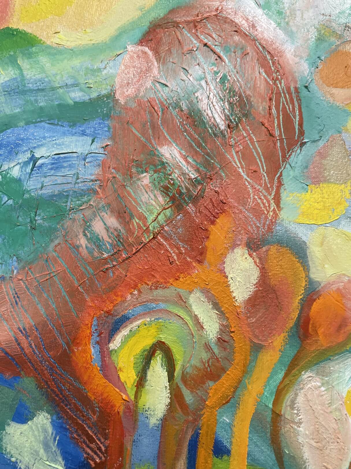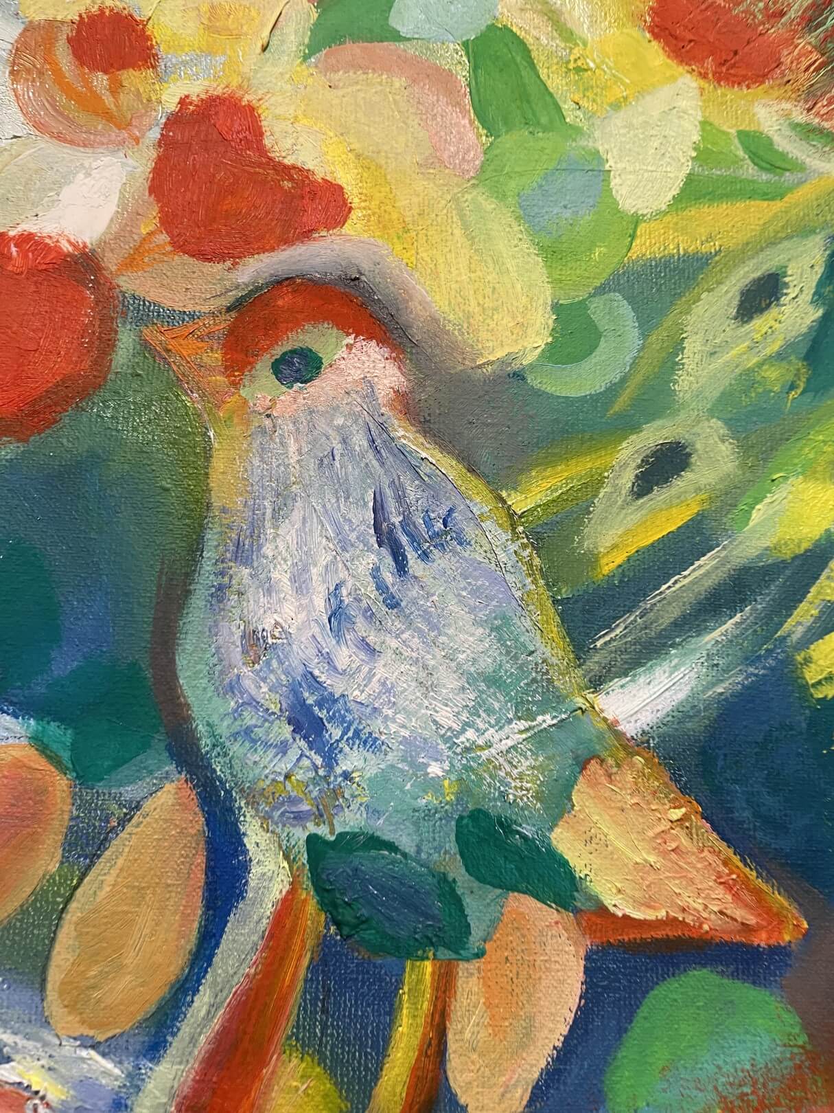 Umělcovo použití volných tahů štětcem a vrstvení dodává plátnu bohatou, strukturovanou povrchovou úpravu, která diváka vybízí k hlubšímu ponoru do jednotlivých vrstev. Malovaná scéna překypuje životem a energií, přesto je to právě vyrovnaný pták, který ukotvuje tento chaos a poskytuje pevný bod, jenž diváka provází touto bujarou vizuální cestou.