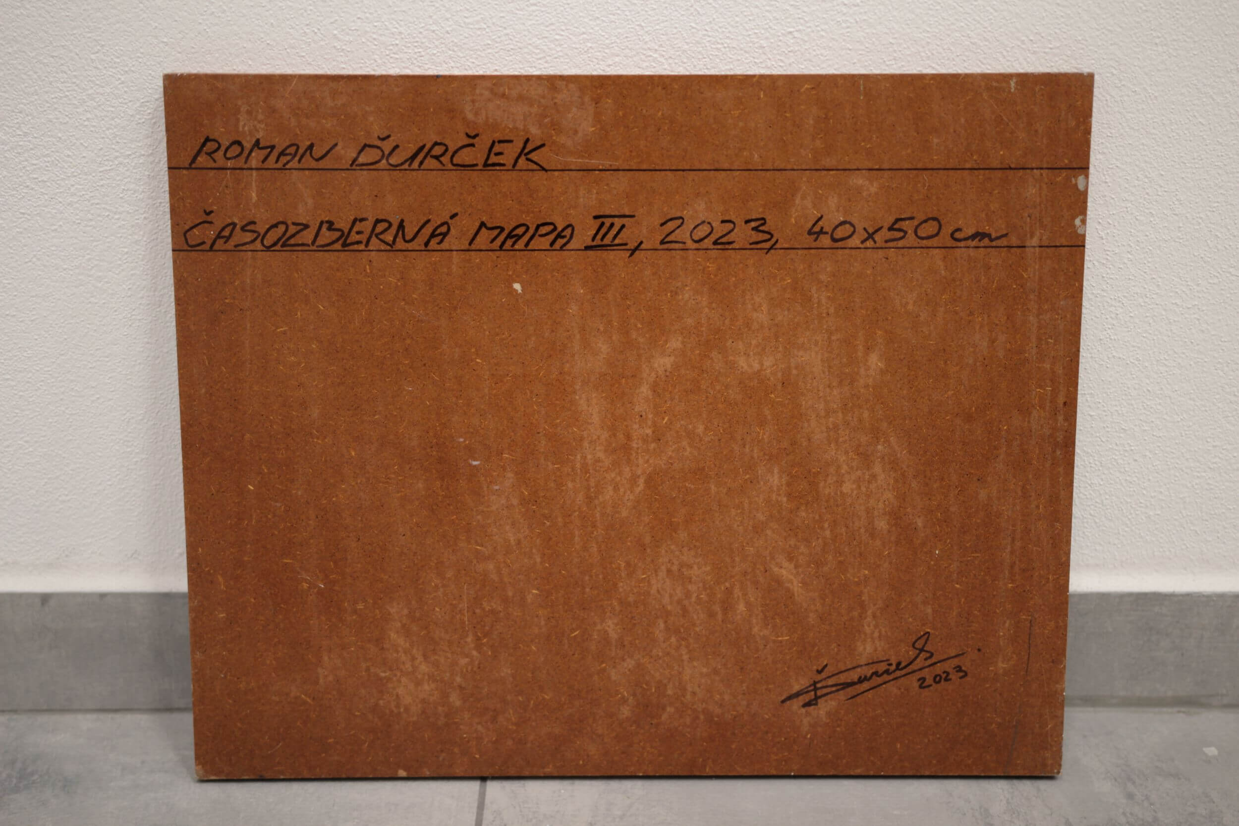 Dílo „Časosběrná mapa III“ (2023) představuje pokračování autorovy tematické linie zkoumání času jako pohyblivého, mnohovrstevnatého a zároveň neuchopitelného fenoménu. Roman Ďurček se v této sérii zaměřuje na vizuální záznam časových vrstev – nikoli prostřednictvím narativu, ale skrze fyzický proces proměny materiálu.