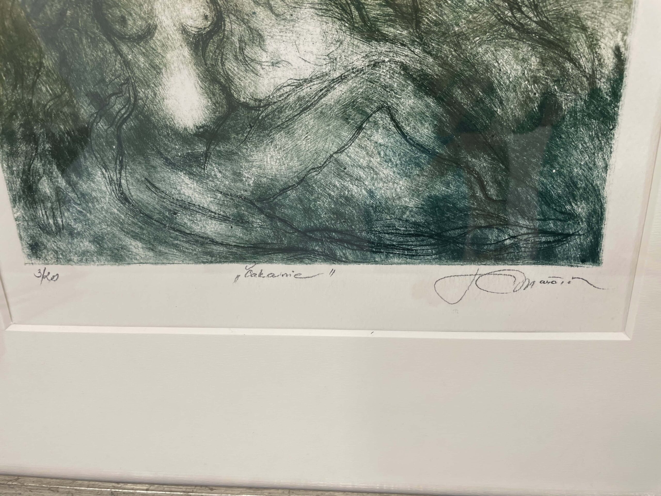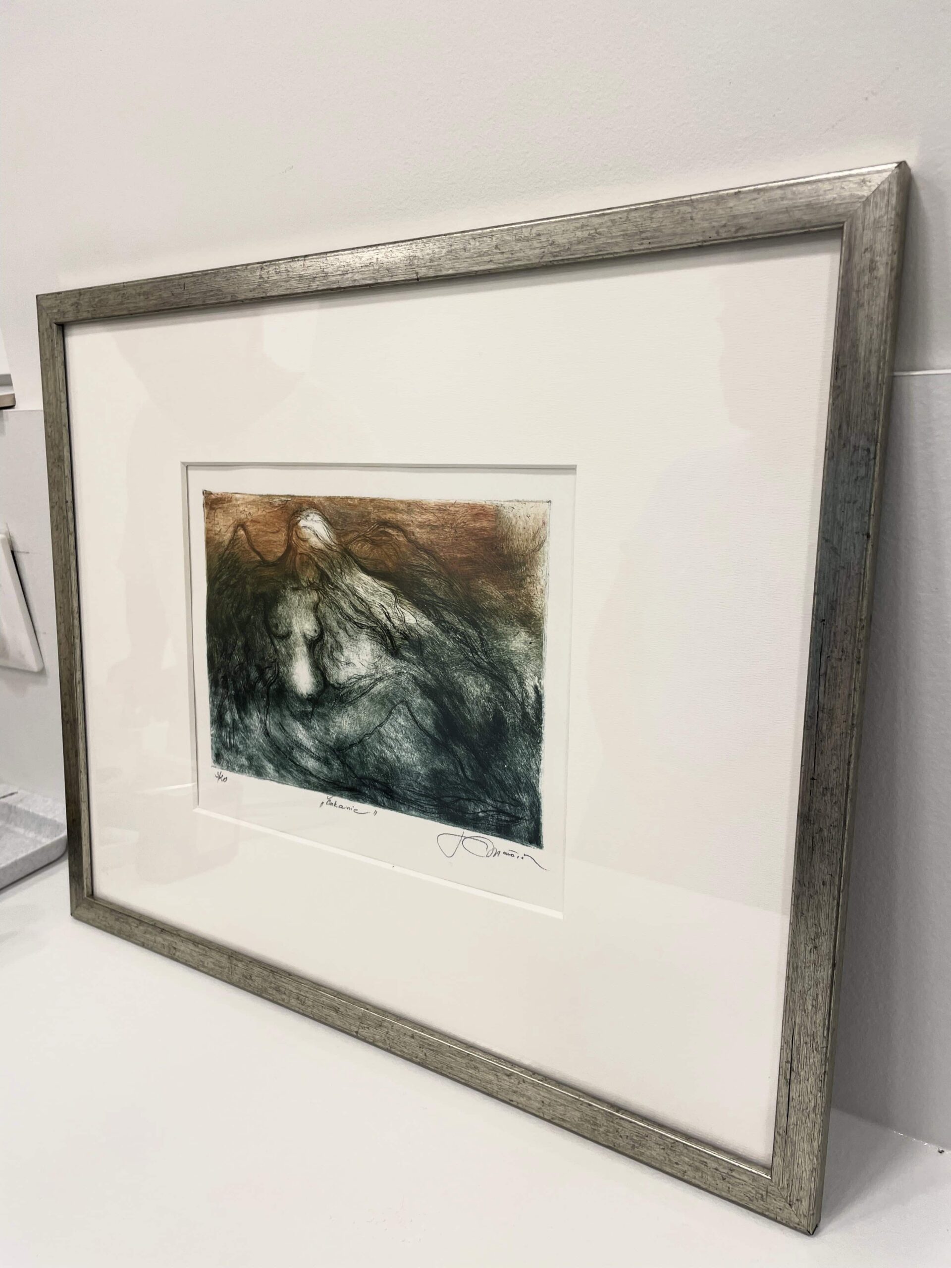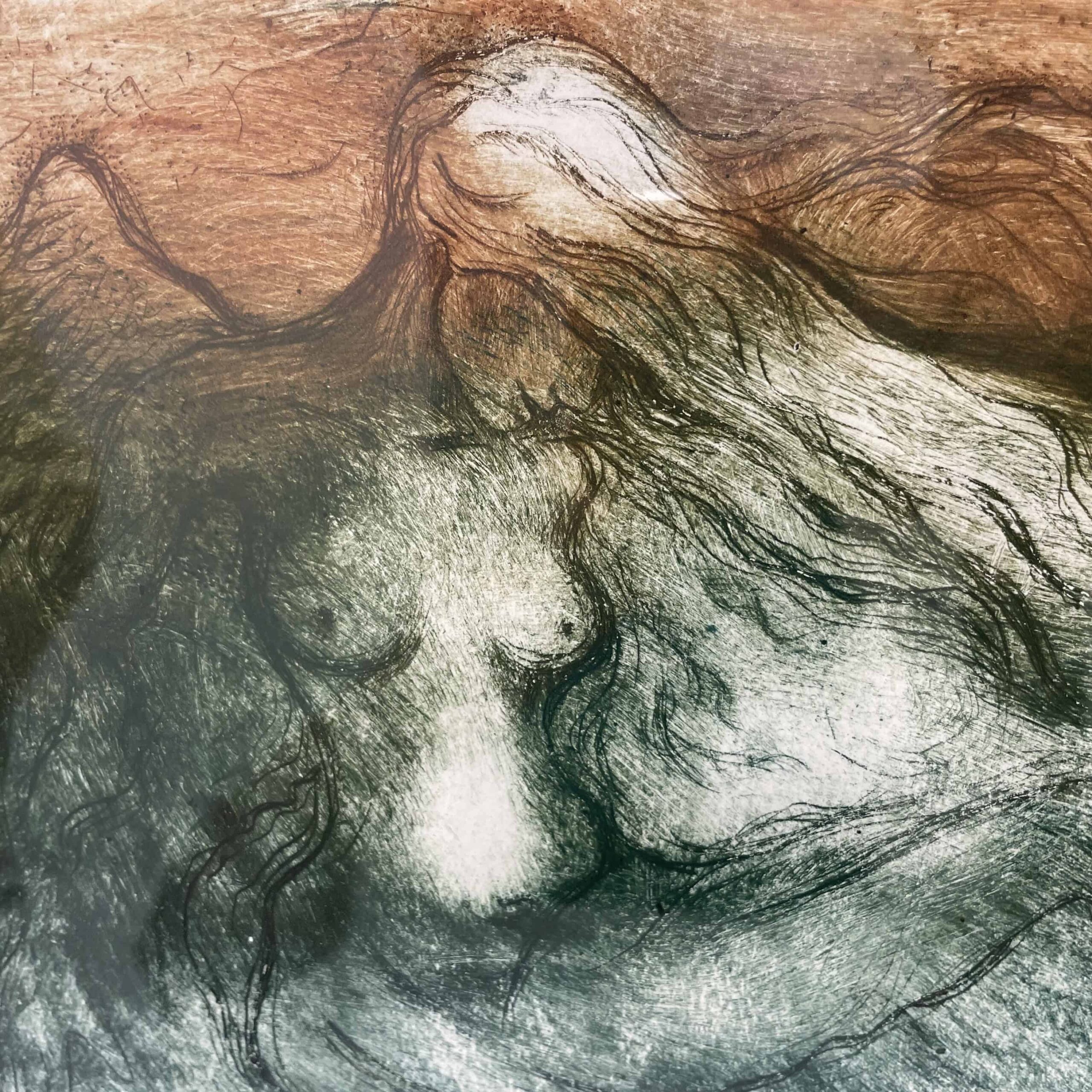 Grafické dílo zobrazuje odhalenou ženu s andělskými křídly, která tiše sedí v introspektivní poloze. Jako by čekala na spásu nebo odpověď z vyšších sfér, její pohled proniká divákovi do nitra. Její tělo působí zranitelně a zároveň silně. Symbolizuje lidskou duši v liminální situaci, stojící na hranici mezi vírou a pochybnostmi, mezi světlem a temnotou.