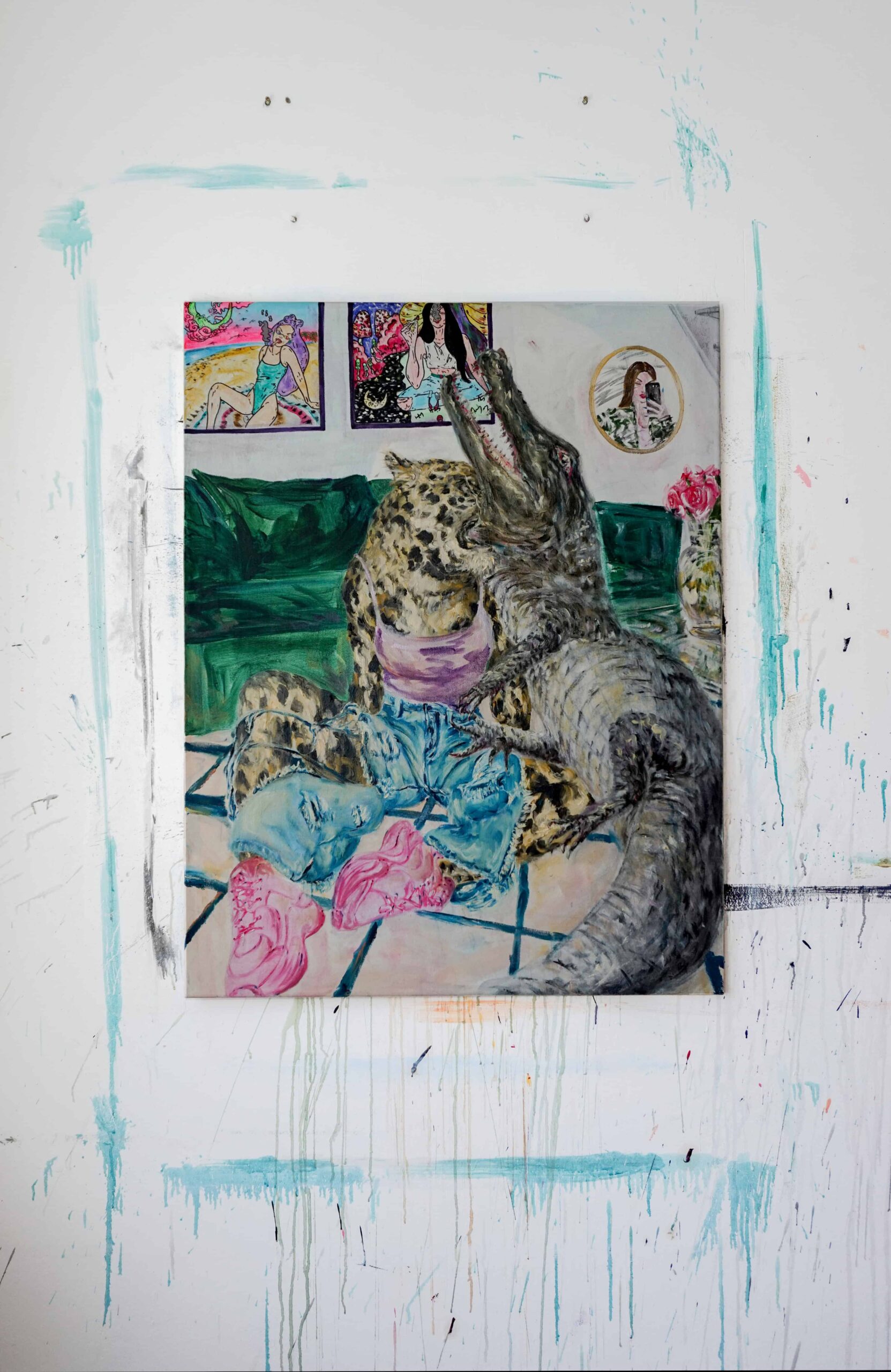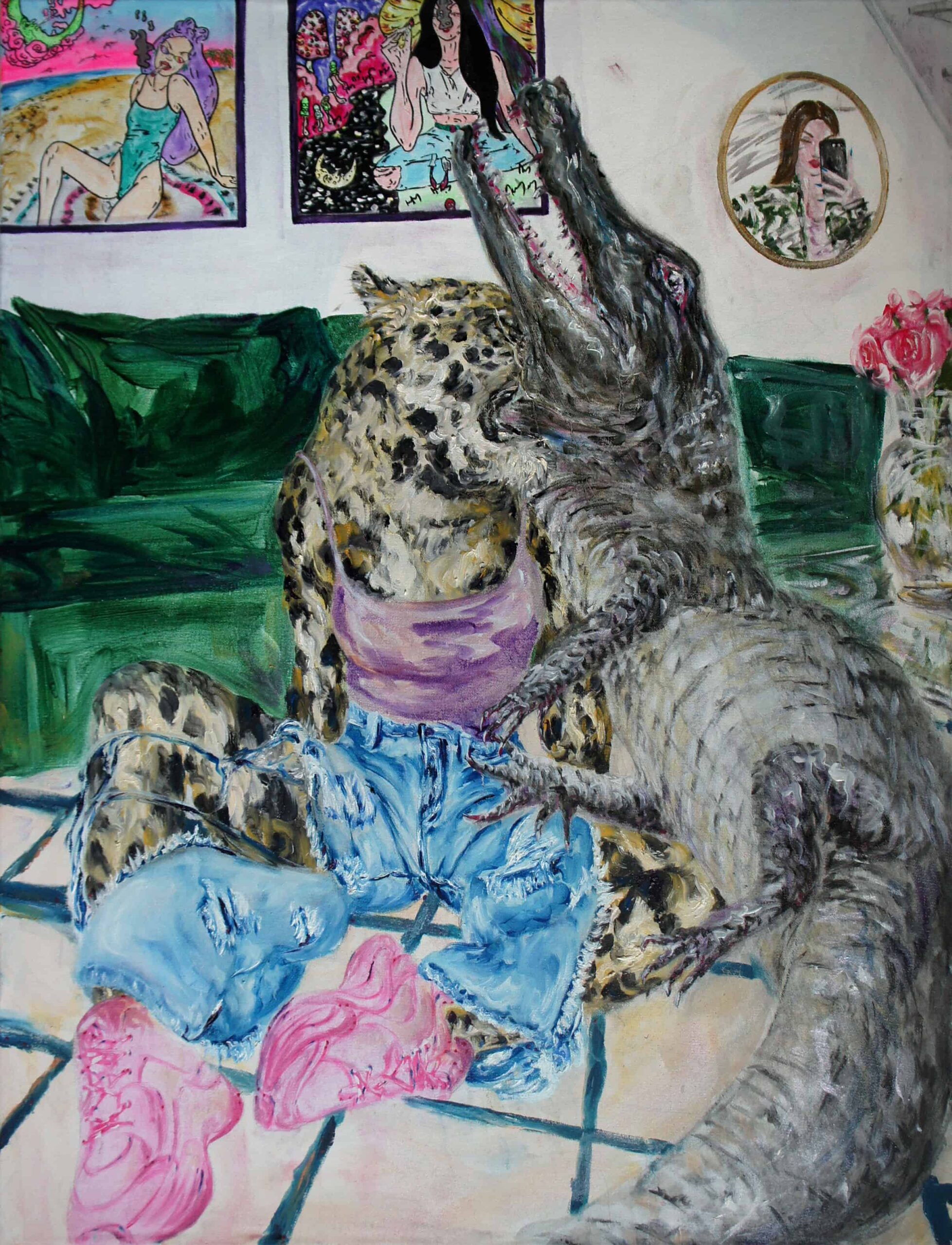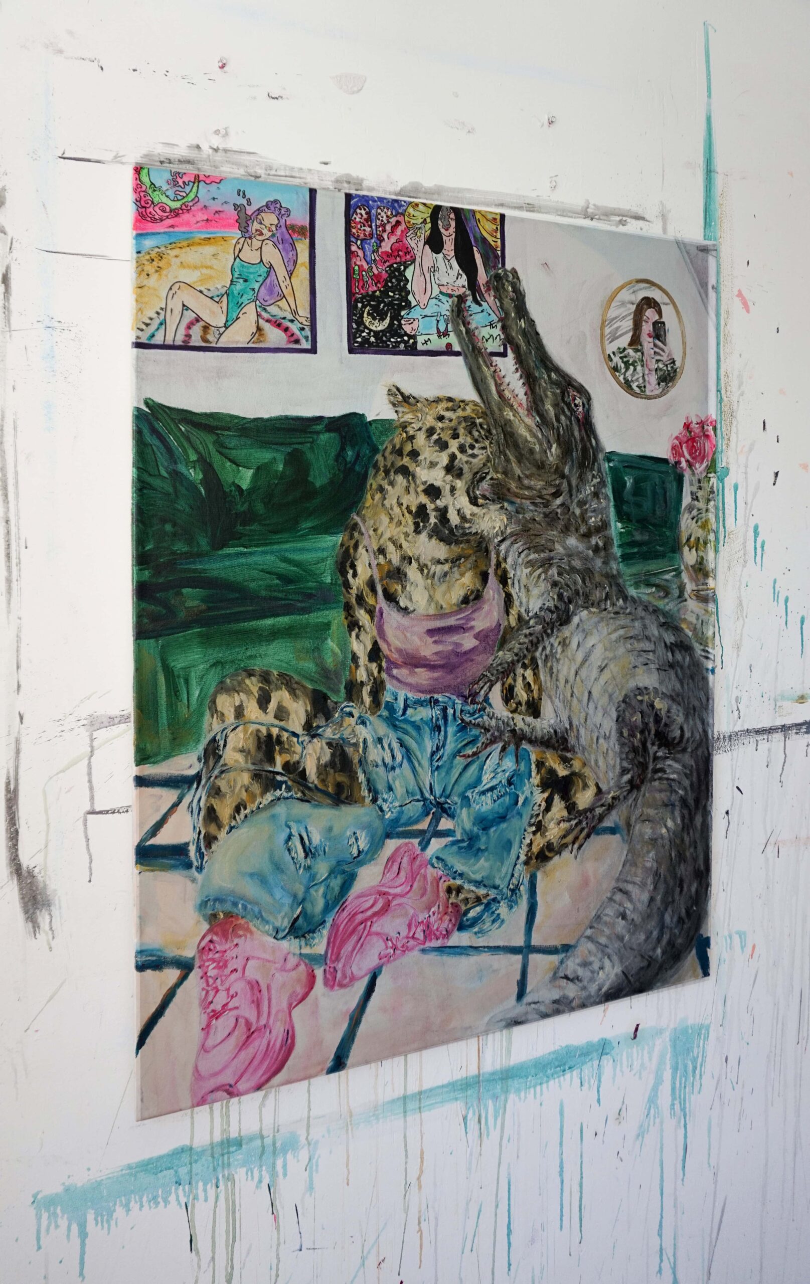 Obraz zachycuje symbolický motiv lva, který se sám pokouší zabít, čímž vyvolává reflexi o vnitřním konfliktu a sebezničujících tendencích. Tento dramatický moment kombinuje figurativní a surrealistické prvky, což divákovi umožňuje vnímat dílo na více úrovních. Lev působí jako metafora lidské odolnosti, křehkosti a schopnosti čelit životním výzvám, přičemž každá jeho linie a detail přispívá k intenzitě emocionálního zážitku.