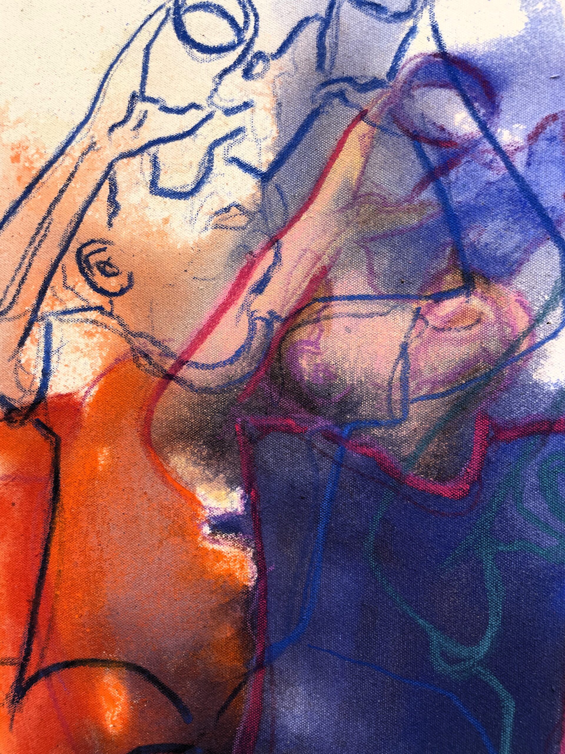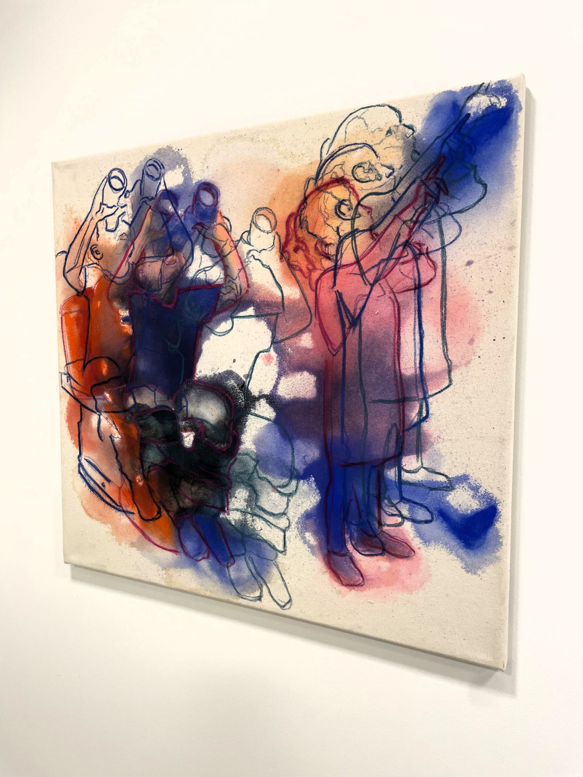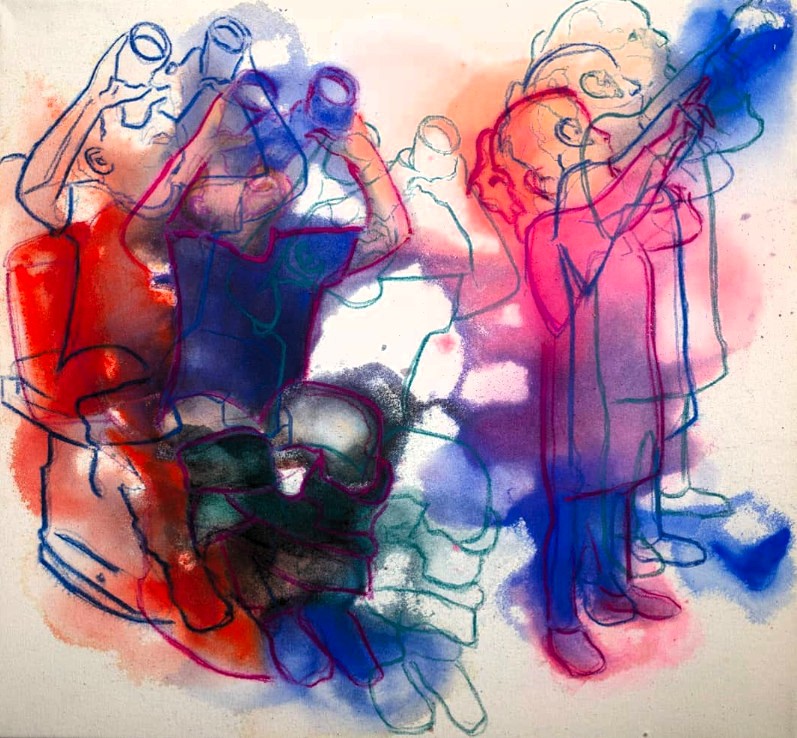 Postavy jsou naznačeny jemnými, průsvitnými liniemi v odstínech červené, modré, fialové a zelené. Barvy se místy prolínají a doplňují, čímž vytvářejí dojem vzájemného pohybu a propojení. Každá barva nese jinou emoci. Společně vytvářejí dynamický rytmus, který naznačuje, že děti neustále mění své polohy a gesta. Obraz zachycuje okamžik těsně před pohybem, a přesto jako by se už pomalu rozpouštěl v čase.