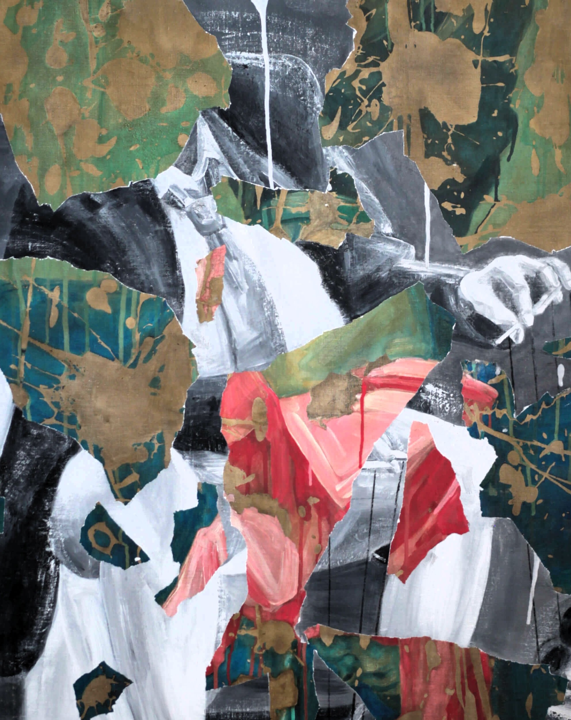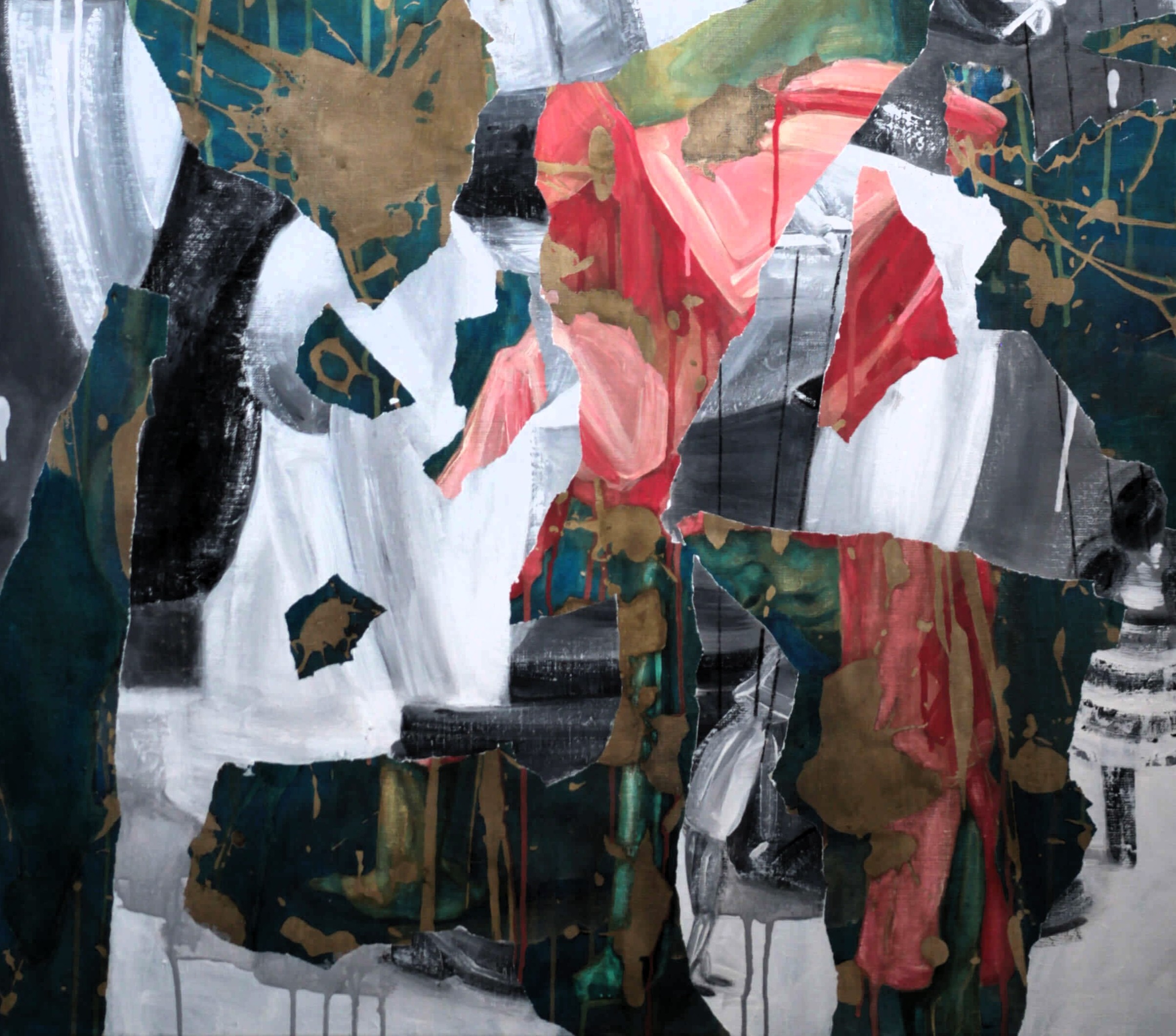 Použití zlaté a zelené barvy vnáší do kompozice prvek luxusu, ale zároveň i cosi syrového a organického. Tyto plochy připomínají masky, závěsy či kulisy, které zakrývají a současně odhalují to, co se odehrává pod nimi. Do kontrastu vstupuje bílá a černá, které dodávají obrazu rytmus a dramatickou hloubku. Zvláště výrazné jsou červené akcenty, připomínající látku nebo pohybující se těla, jež přinášejí energii a napětí.