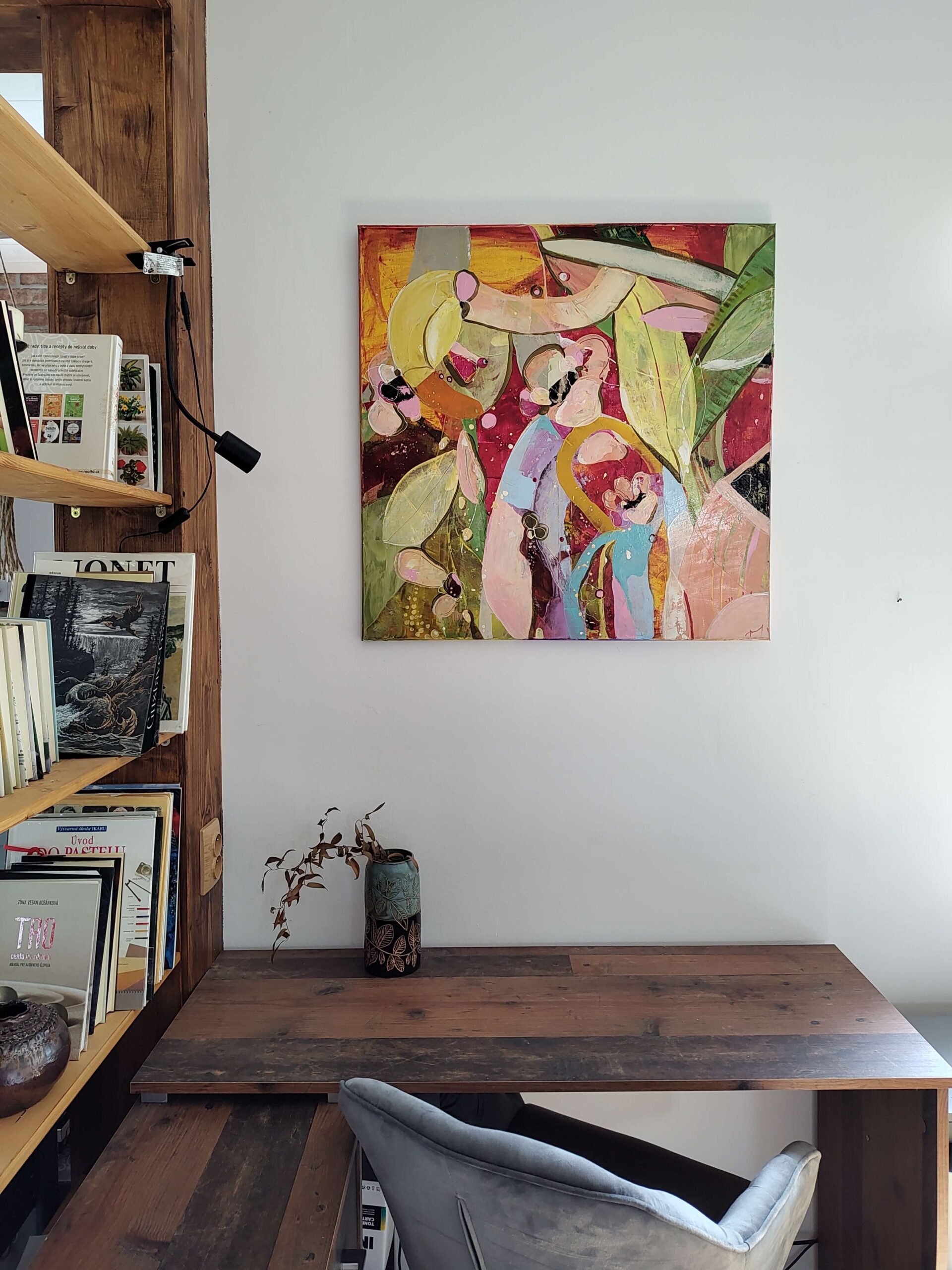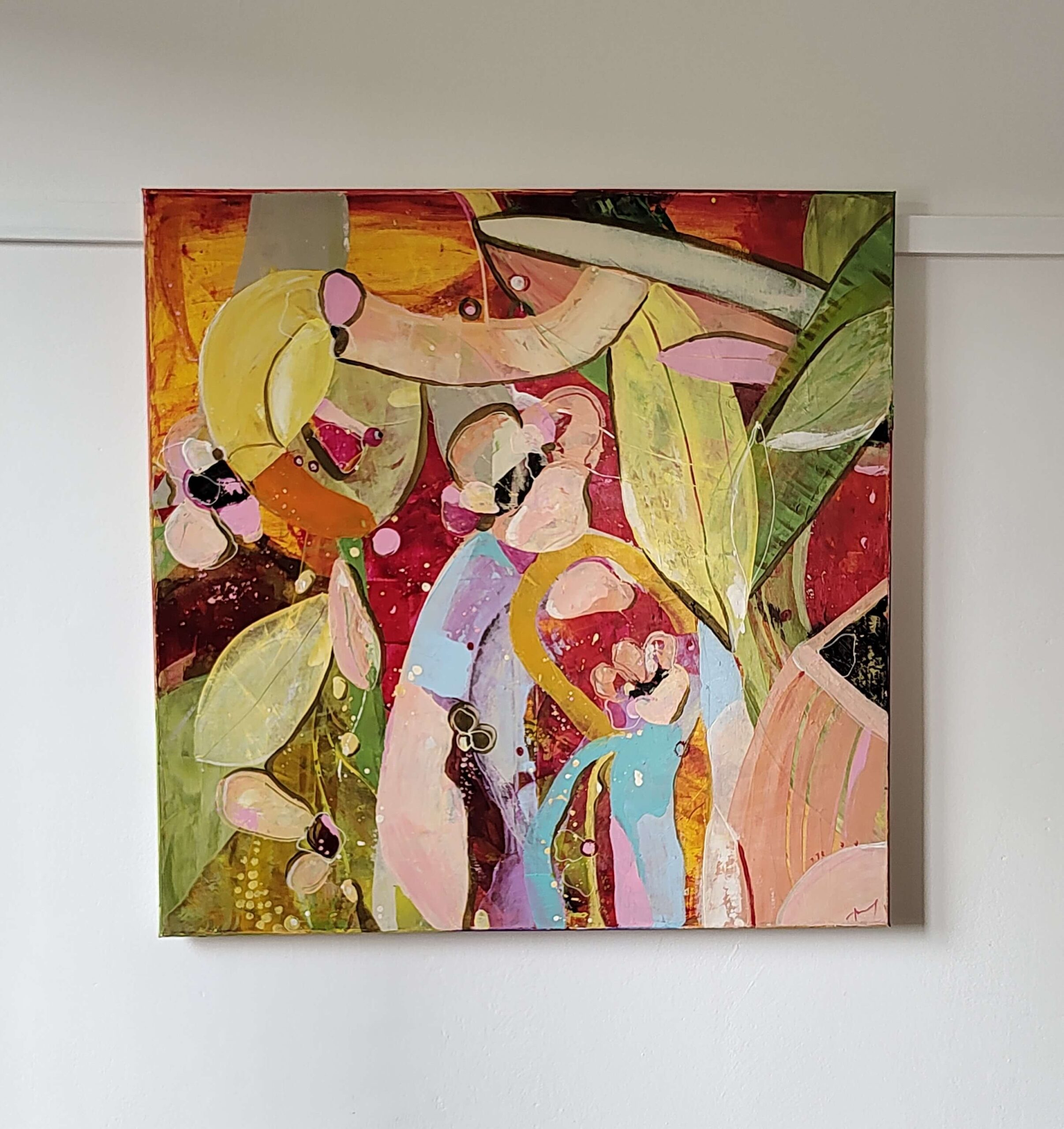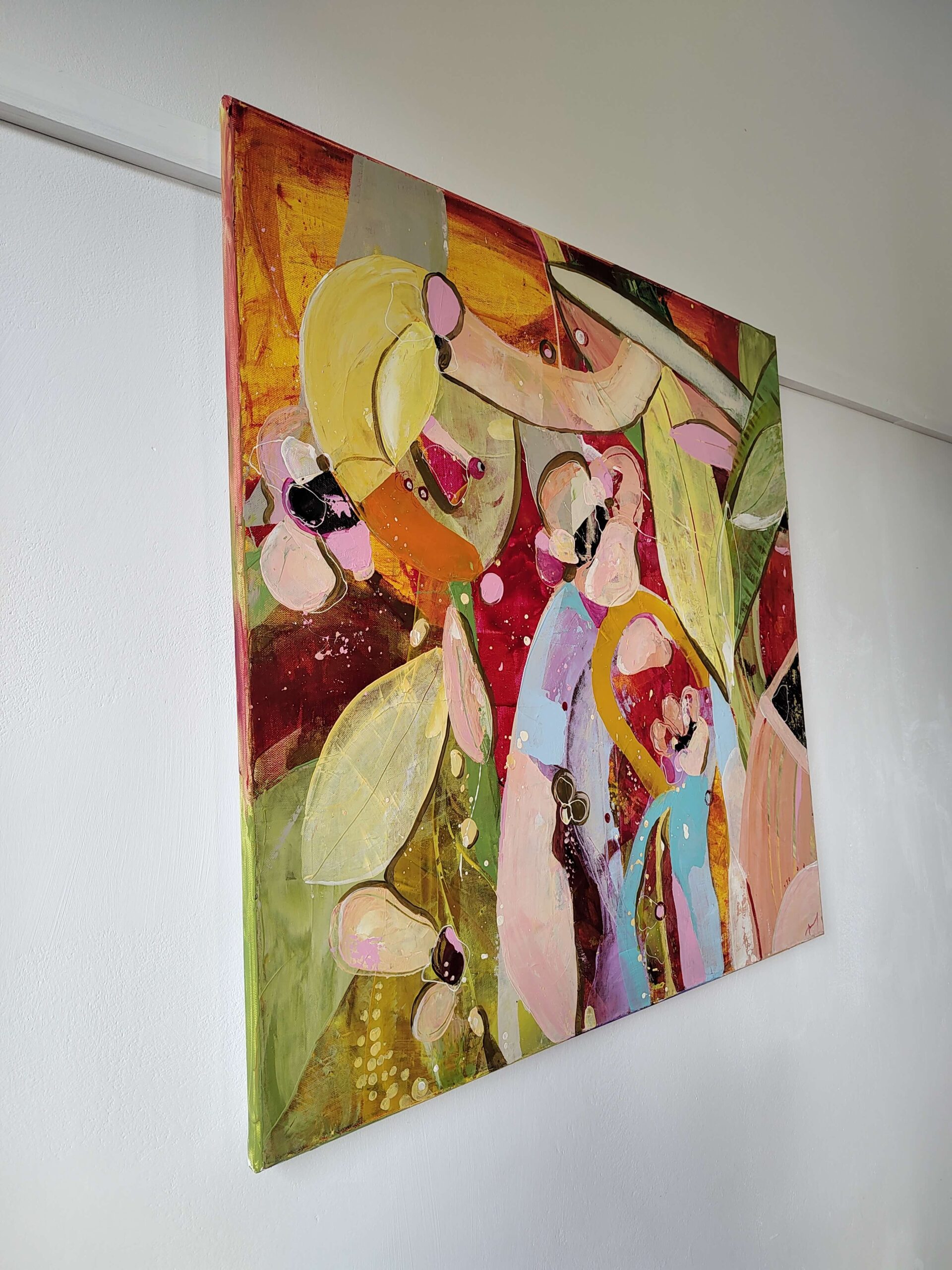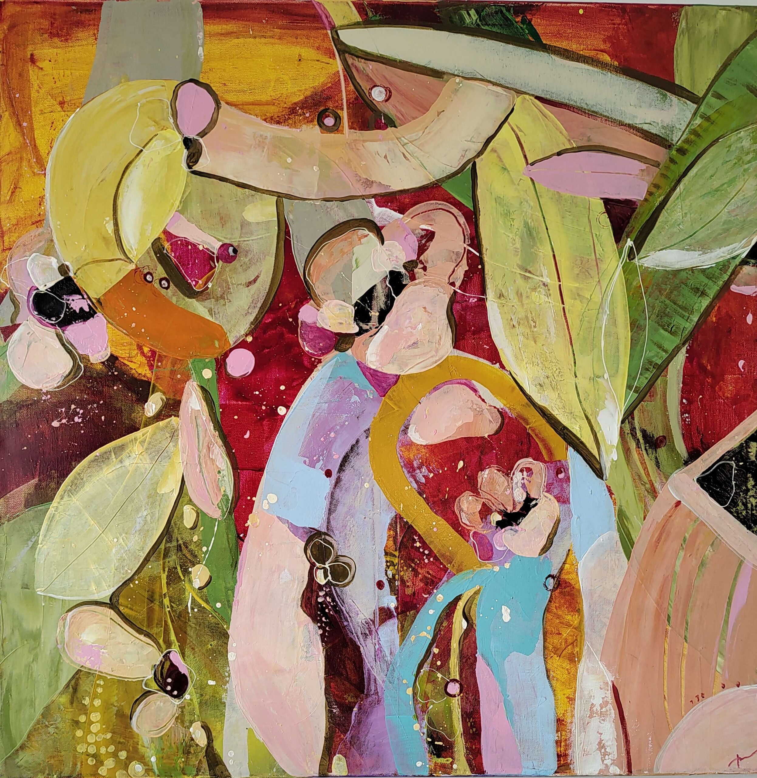 … květy uvězněné do tvarů, propletené jemně zelenými tóny listů s drobnými drahokamy, barvy se prolínají a vytvářejí nové začátky i konce. Uvězněná krása? Ne… živá, pulzující příroda.