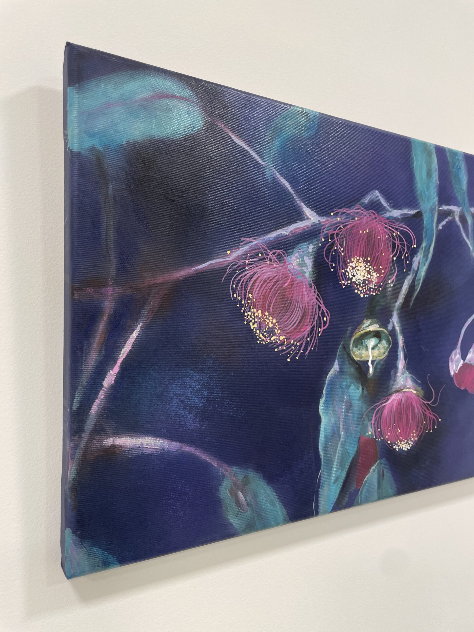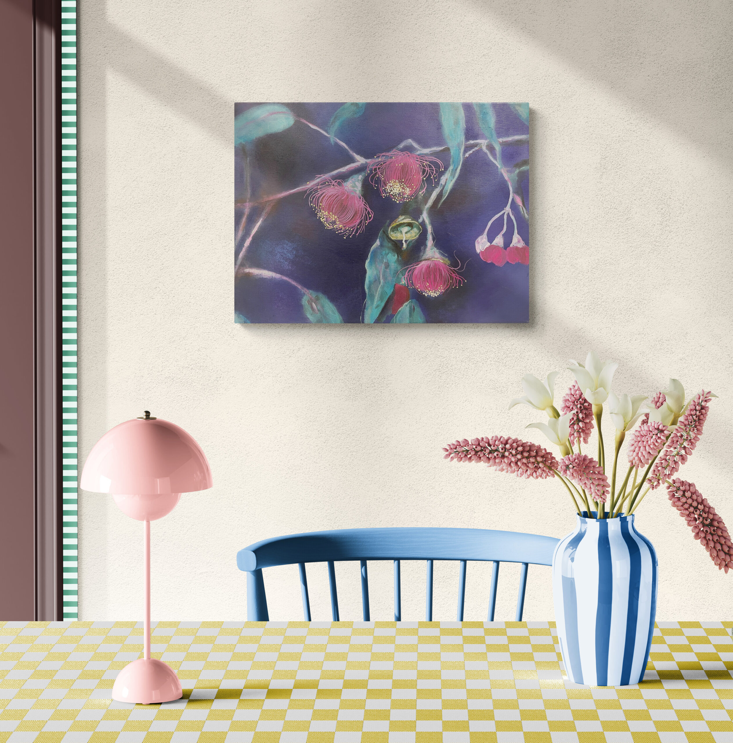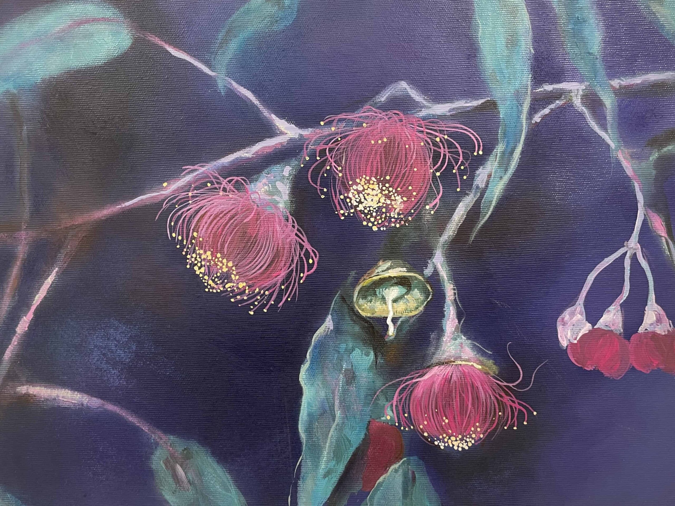 Obraz zachycuje jemnost a exotickou krásu květů eukalyptu v plném rozkvětu. Živé odstíny červené, růžové a bílé majestátně vystupují na tmavě modrém pozadí, které umocňuje jejich svěžest a vizuální sílu. Typická vláknitá struktura eukalyptových květů je pečlivě zpracována s důrazem na detail a strukturu, čímž vzniká fascinující kontrast mezi jemností přírodního motivu a hlubokou hloubkou barev pozadí.