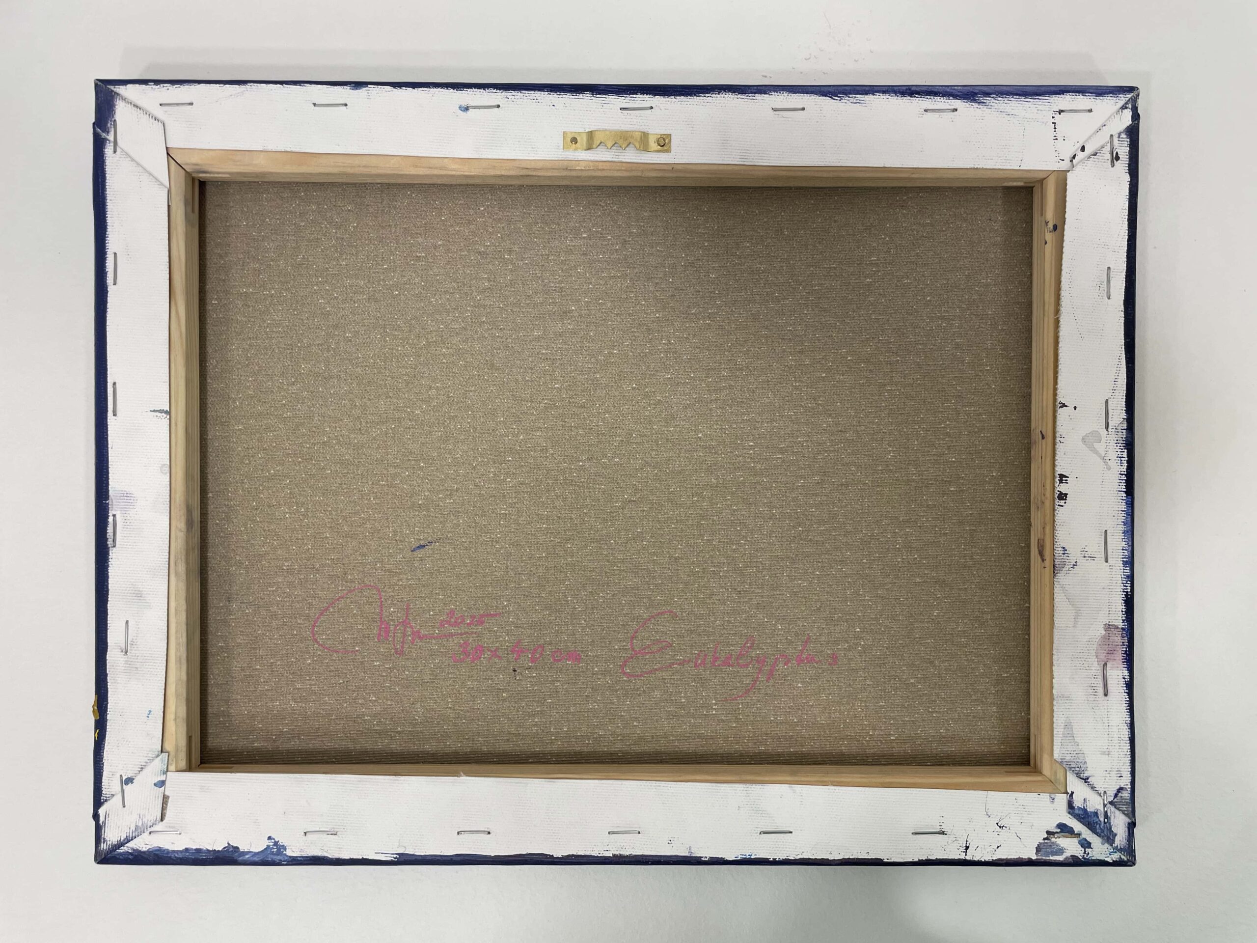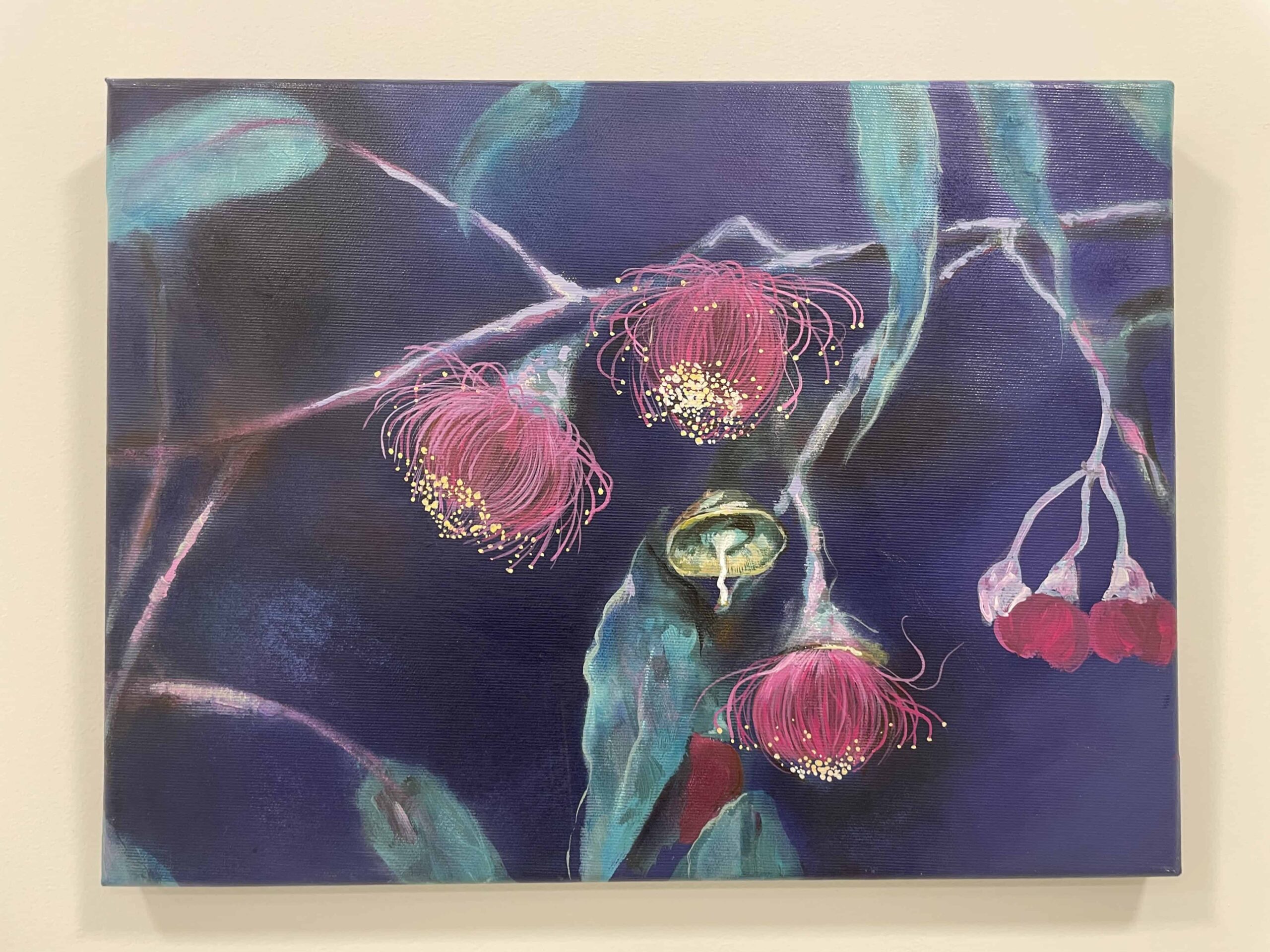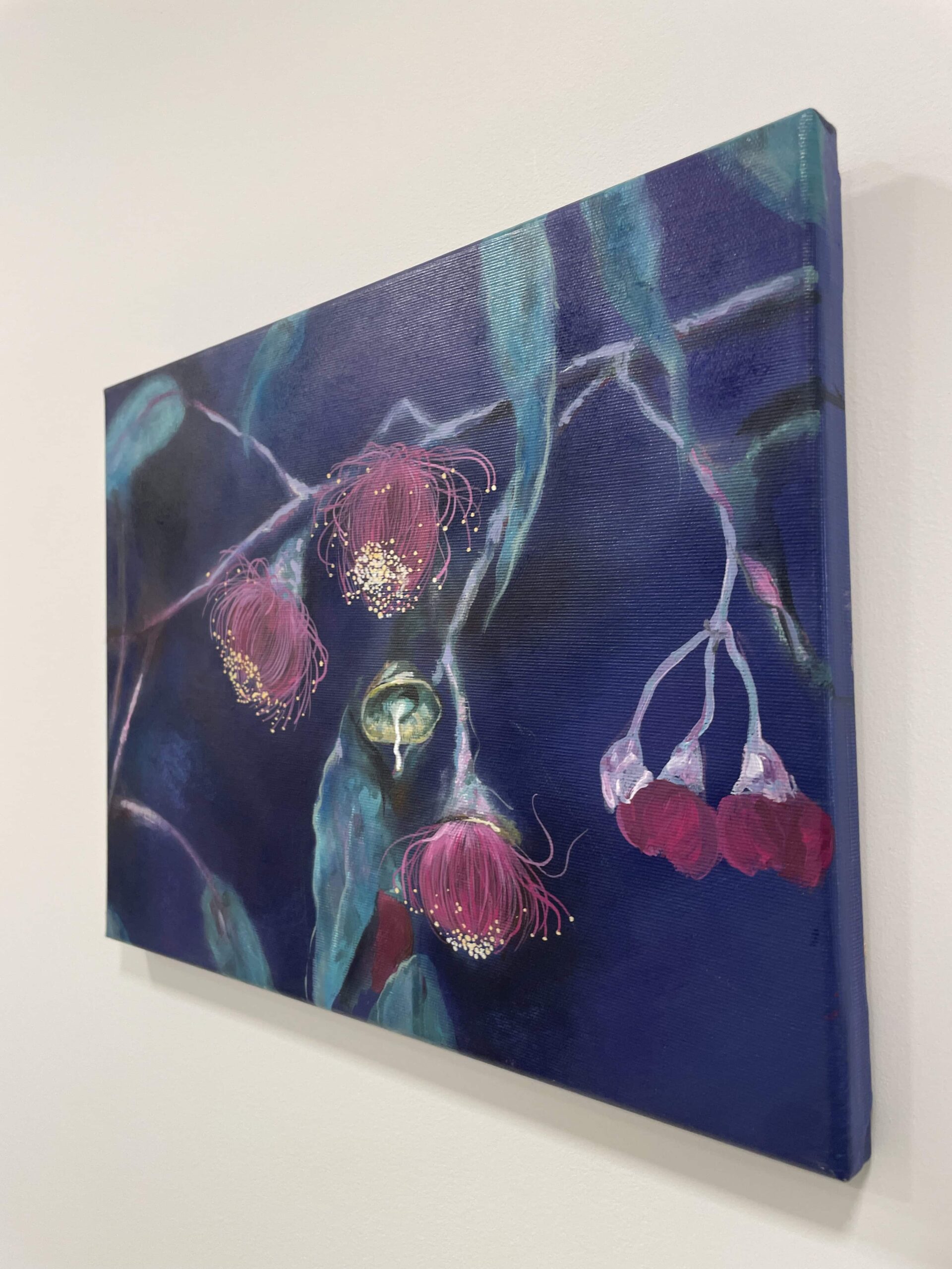 Obraz zachycuje jemnost a exotickou krásu květů eukalyptu v plném rozkvětu. Živé odstíny červené, růžové a bílé majestátně vystupují na tmavě modrém pozadí, které umocňuje jejich svěžest a vizuální sílu. Typická vláknitá struktura eukalyptových květů je pečlivě zpracována s důrazem na detail a strukturu, čímž vzniká fascinující kontrast mezi jemností přírodního motivu a hlubokou hloubkou barev pozadí.