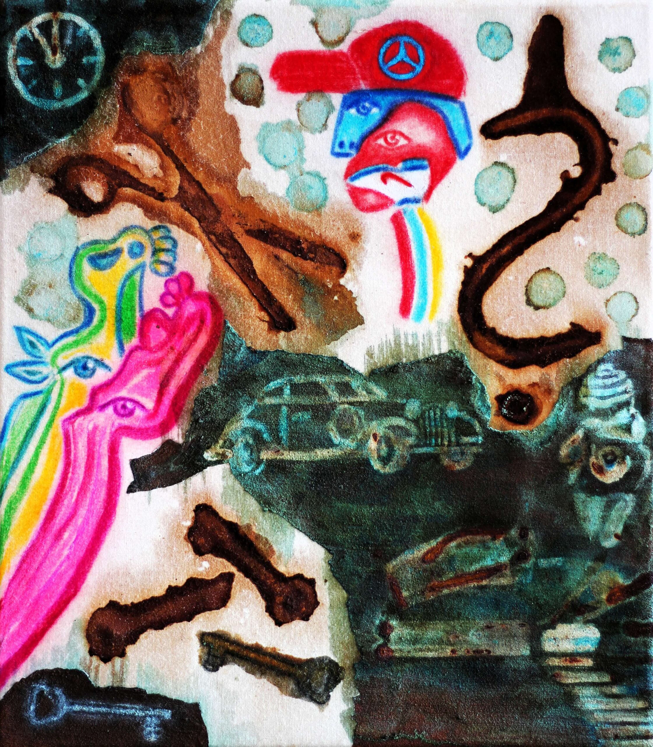 Toto dílo představuje experimentální kompozici, v níž umělec spojuje různé symboly, výrazné barvy a netradiční kontrasty. Na plátně se prolínají surrealistické prvky, fragmenty zvířat, lidské tváře a technické objekty. Všechny tyto motivy vytvářejí zvláštní, ale soudržnou atmosféru, která podněcuje diváka k vlastní interpretaci.