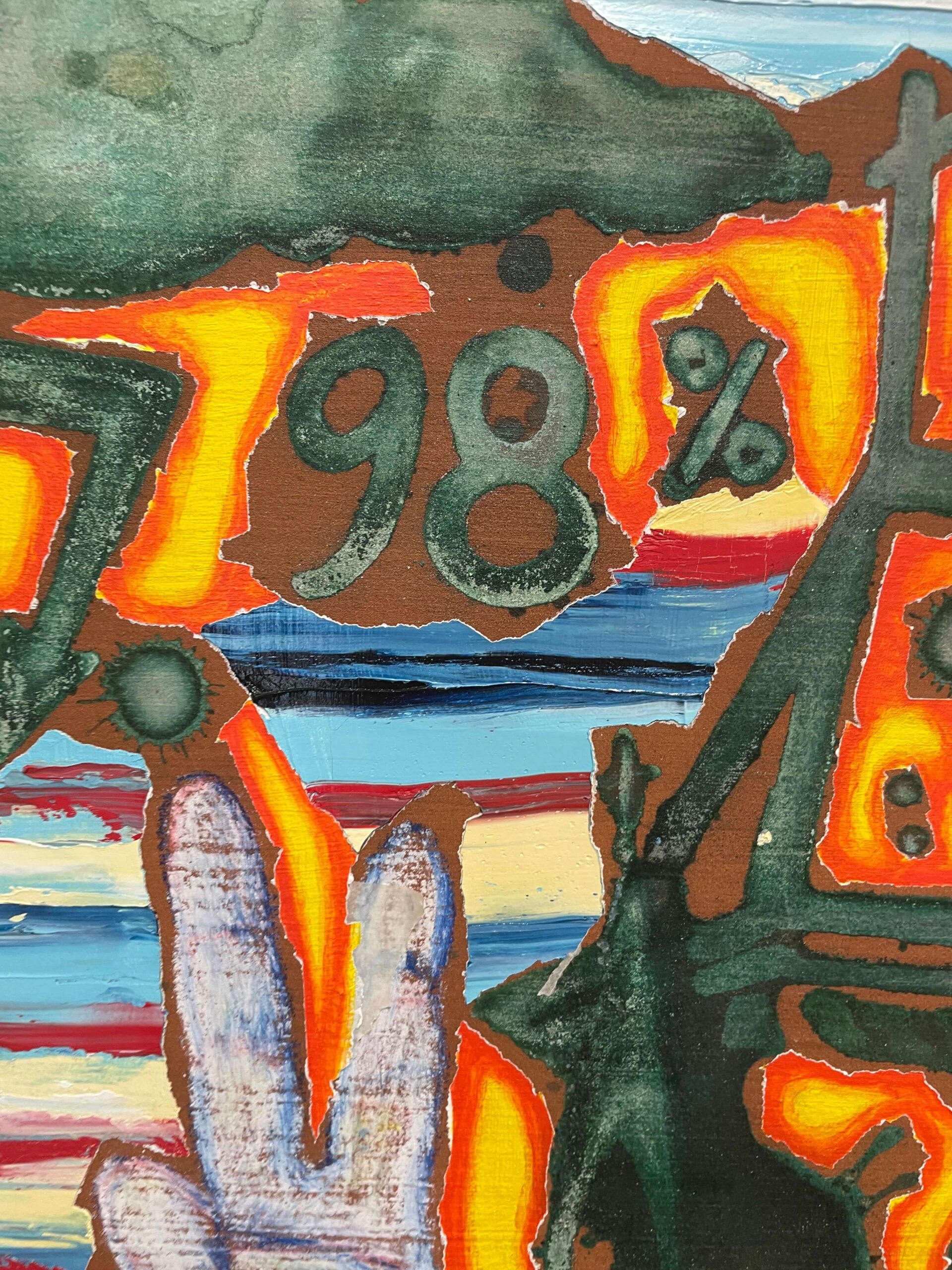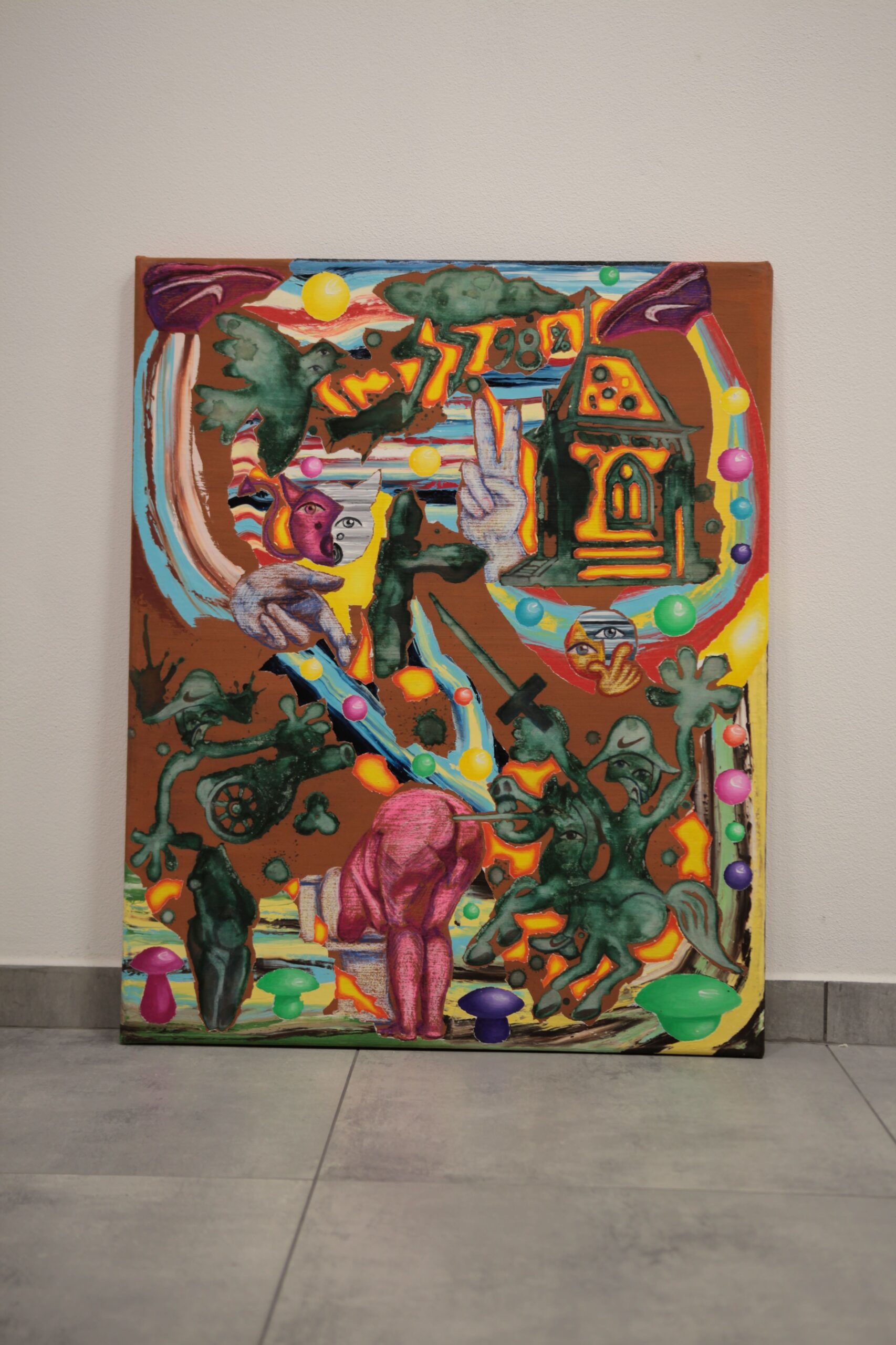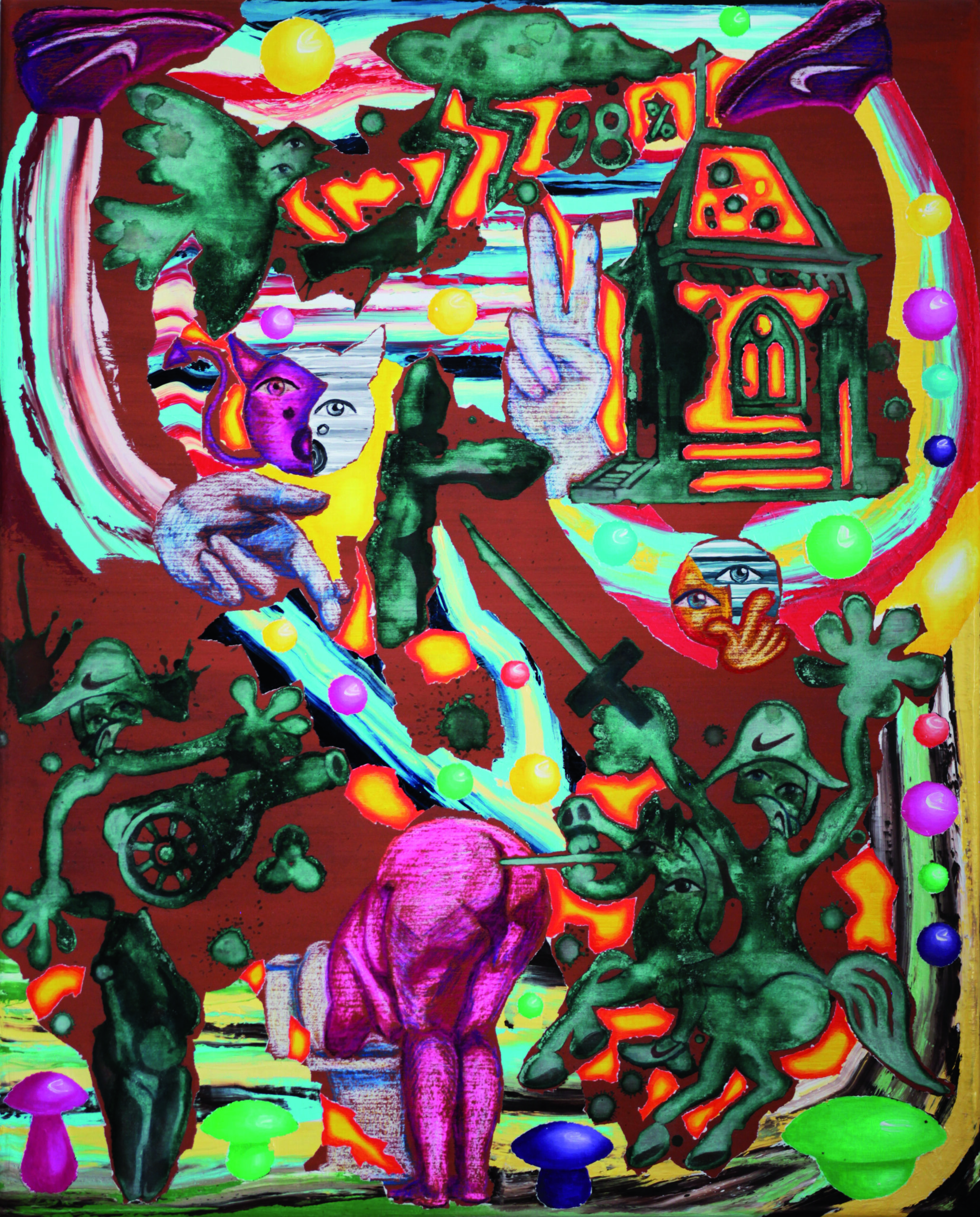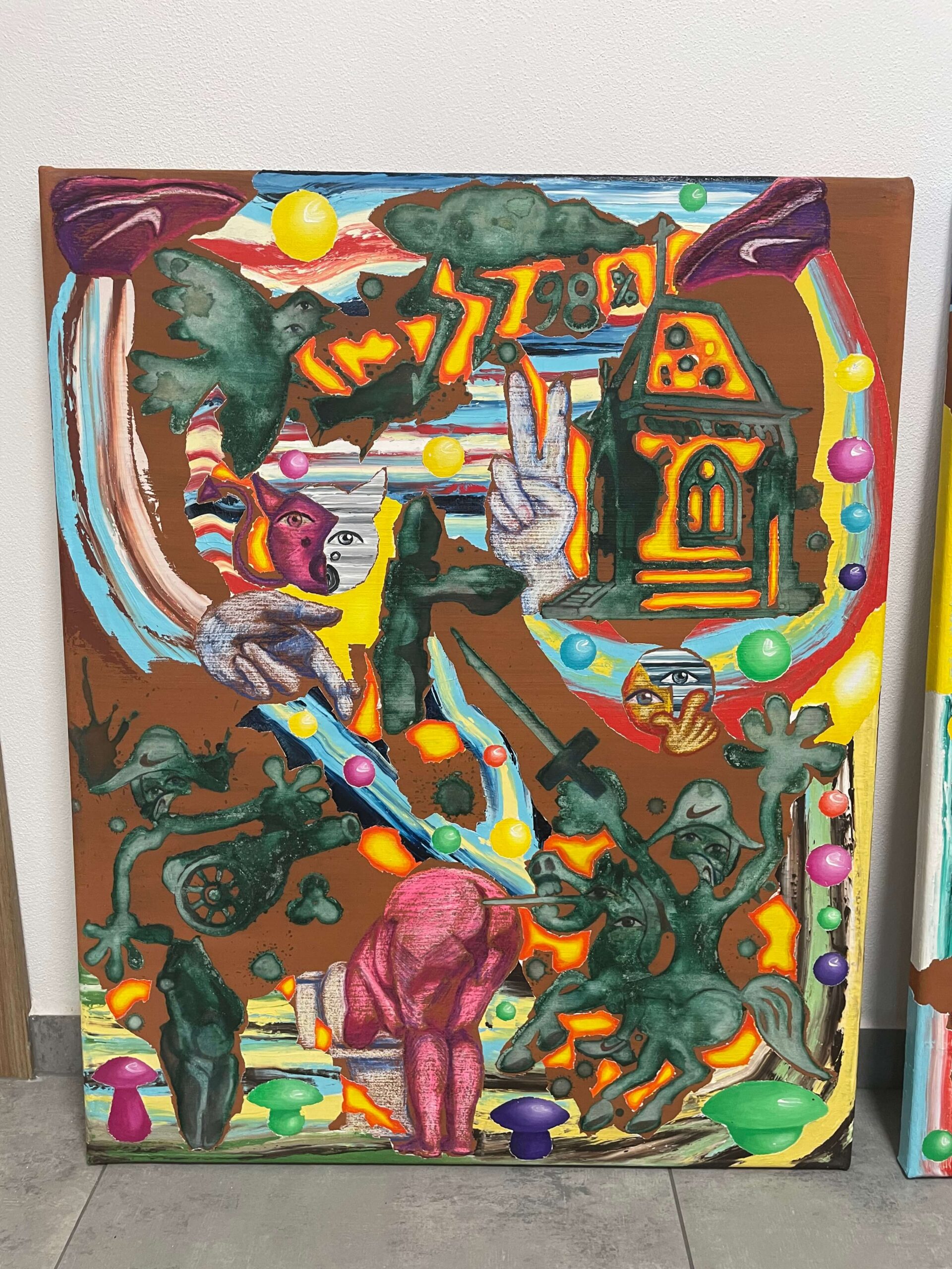 Pozadie je vyplnené surrealistickými symbolmi – veľká ruka s dvoma vztýčenými prstami môže naznačovať mier, moc alebo tajné posolstvo. Vpravo hore sa objavuje dom so žiariacimi dverami, symbolizujúci útočisko alebo cieľ, čím sa scéna obohacuje o vrstvy významov. Žiarivé farebné akcenty a víriace vzory dodávajú obrazu snovú, hravú atmosféru.