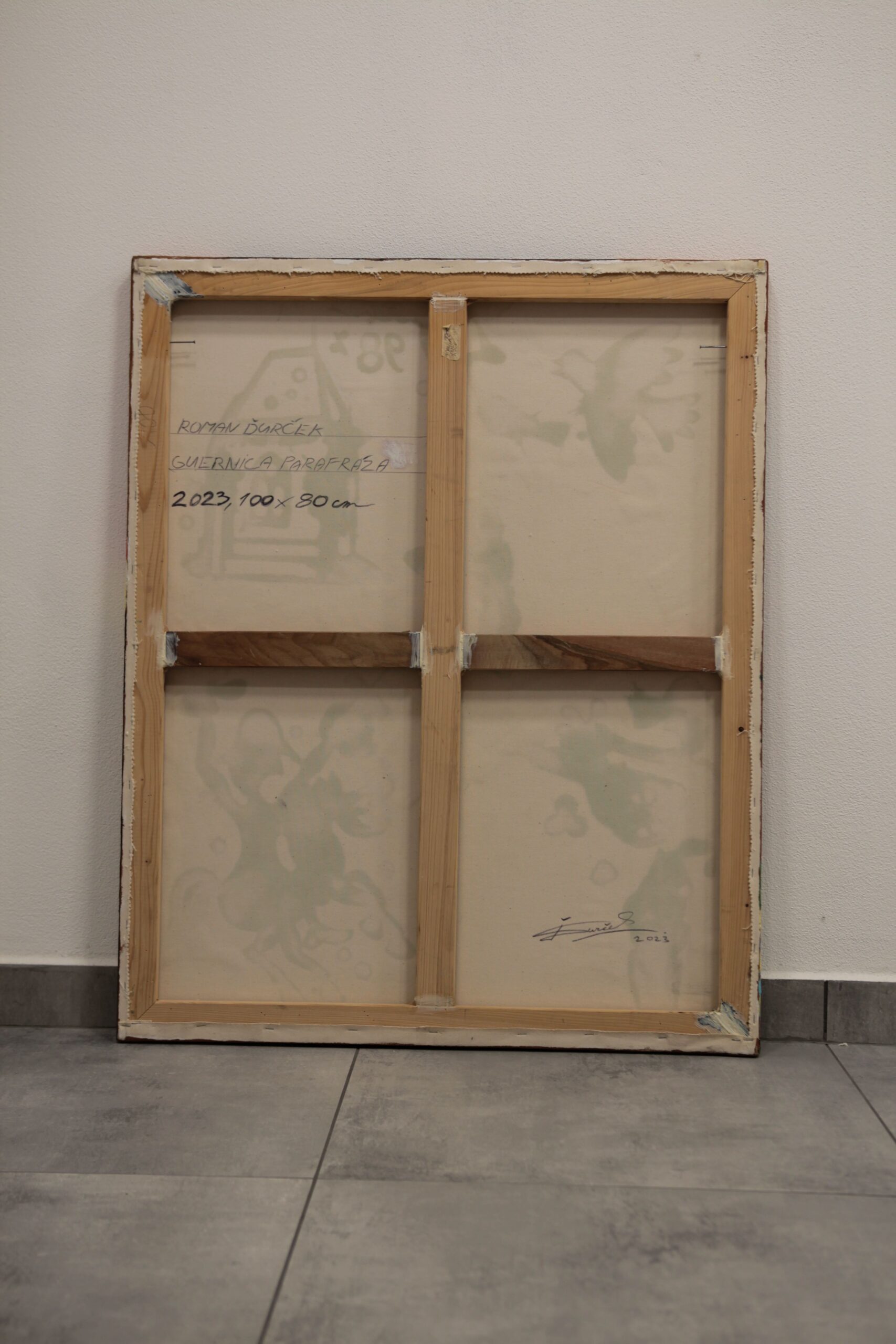Toto dielo od Romana Ďurčeka, nazvané „Guernica – parafráza“, predstavuje expresívnu reinterpretáciu klasickej témy, ktorá kombinuje surrealistické, abstraktné a kubistické prvky. Autor diváka okamžite zaujme dynamikou kompozície a kontrastom farieb – sýta zelená, purpurová, červená a žltá vytvárajú vizuálnu explóziu, ktorá podnecuje k detailnému skúmaniu obrazu.