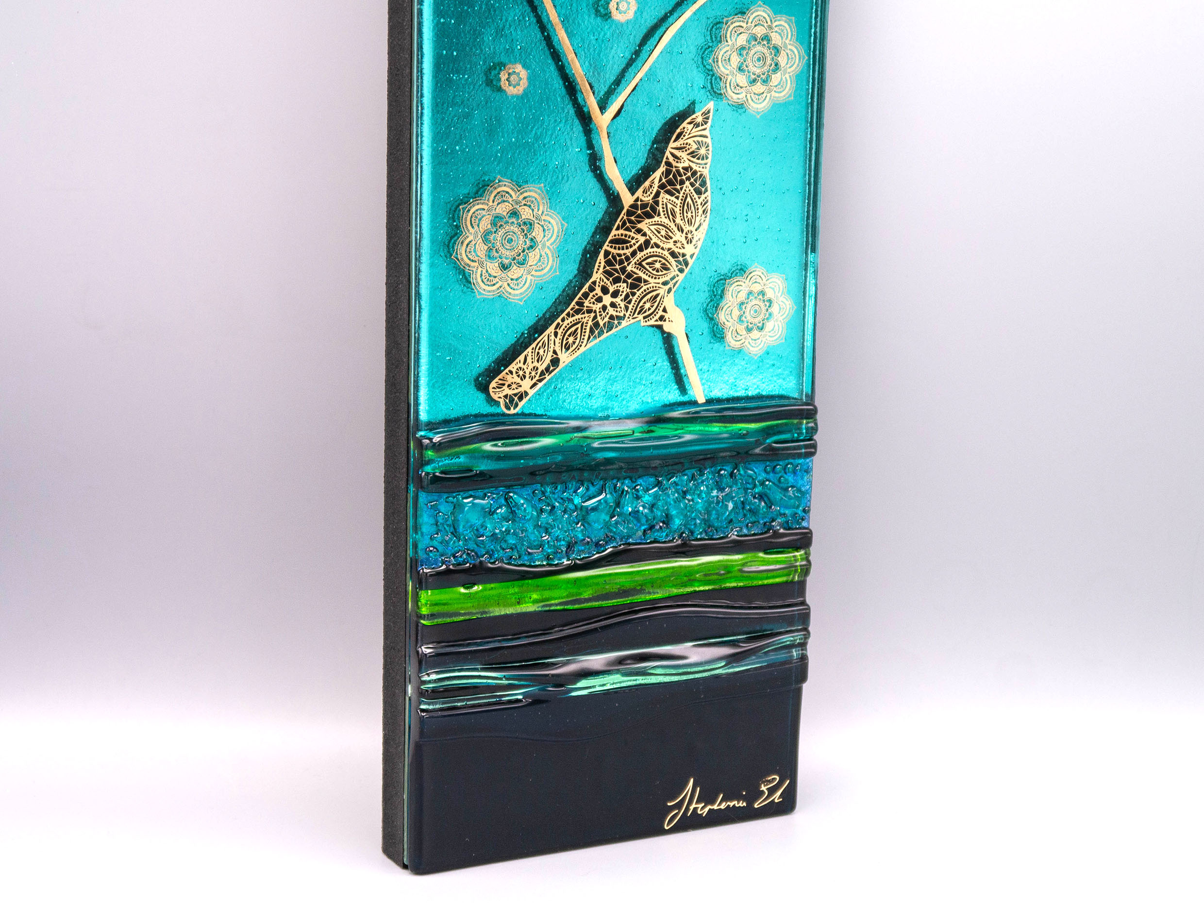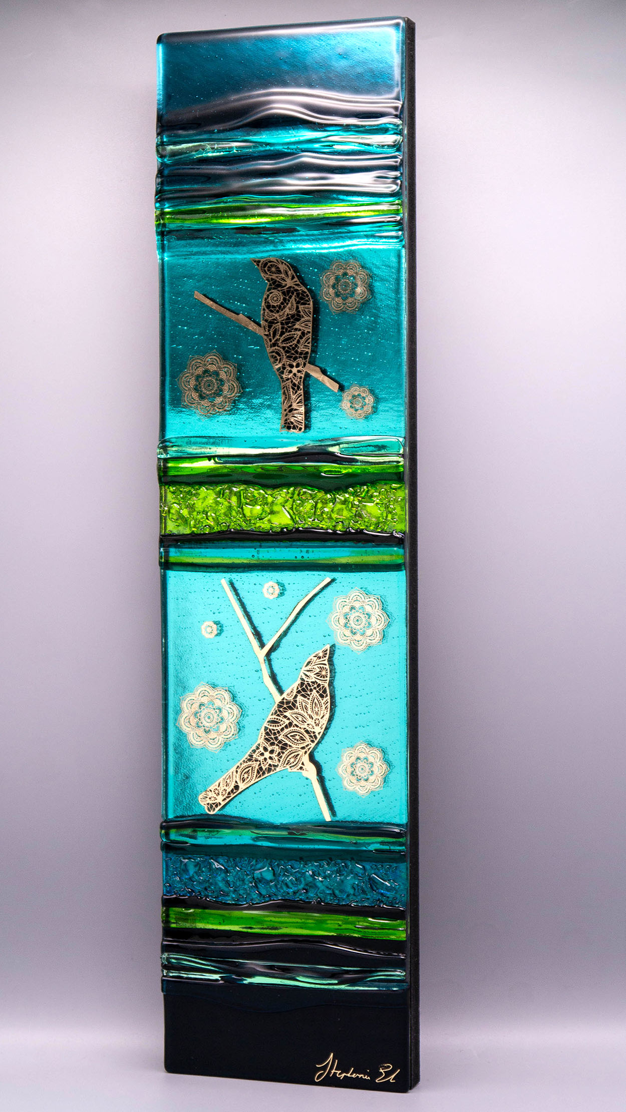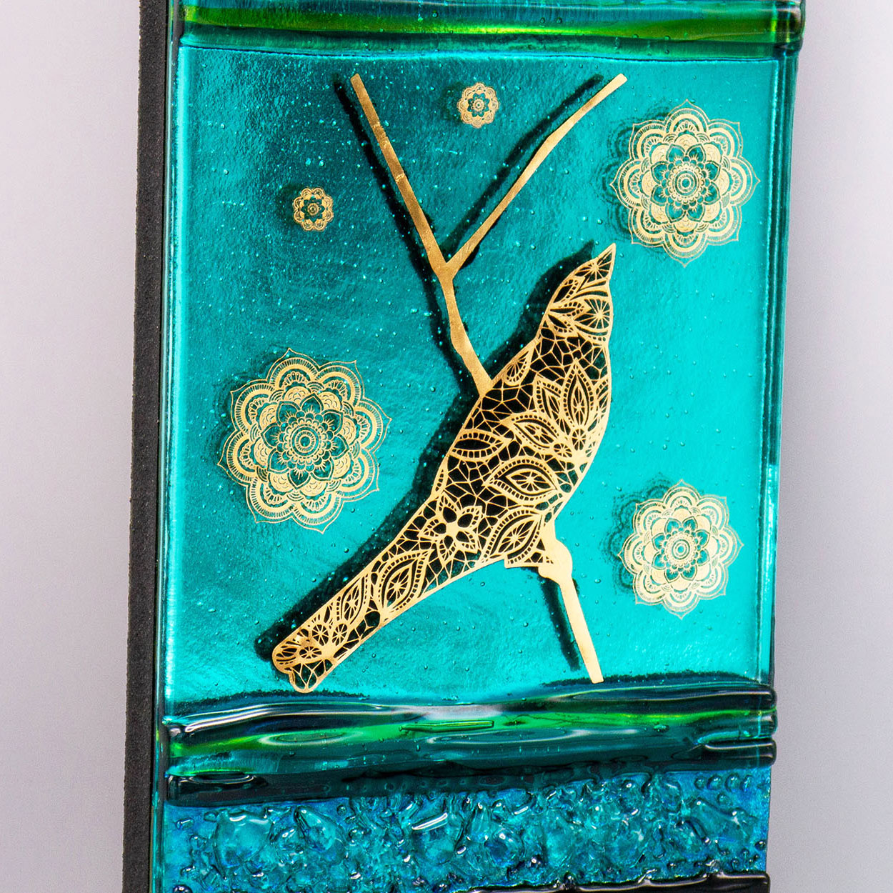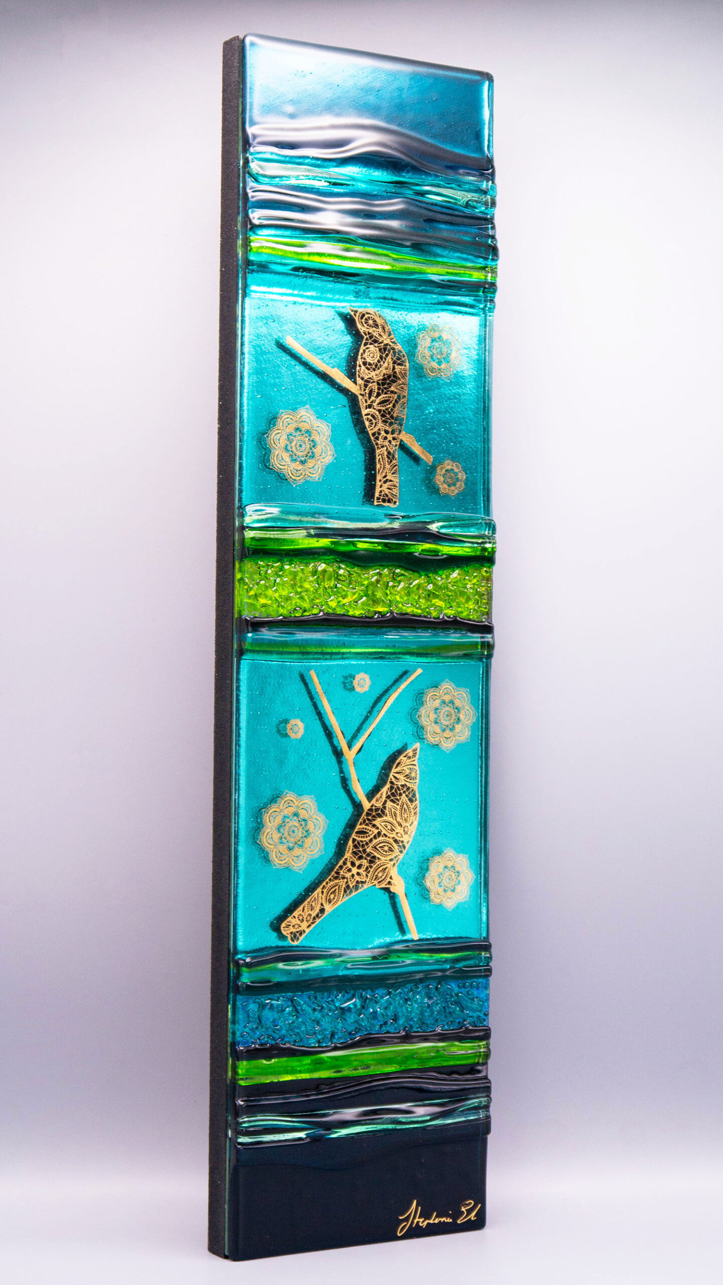 Design ptáků vytvořený z 22karátového zlata krásně kontrastuje se zeleným, limetkovým a tyrkysovým sklem tohoto elegantního nástěnného panelu.