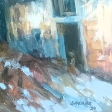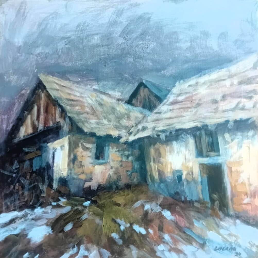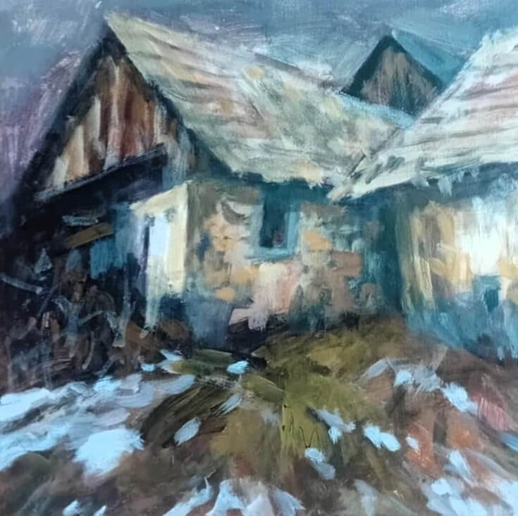 Obraz zobrazuje kamenné domy, které zde stojí již mnoho let a na nichž se podepsal zub času. Autor se soustředí na architekturu a realisticky zobrazuje detaily staveb. Divák si může všimnout struktury zdiva, oken a střech, které odhalují atmosféru starých budov. Barvy autor volí tlumené a přirozené, čímž podporuje dojem historické autentičnosti. Styl kombinuje přesnost s jemnými uměleckými tahy, které obrazu dodávají život a hloubku.