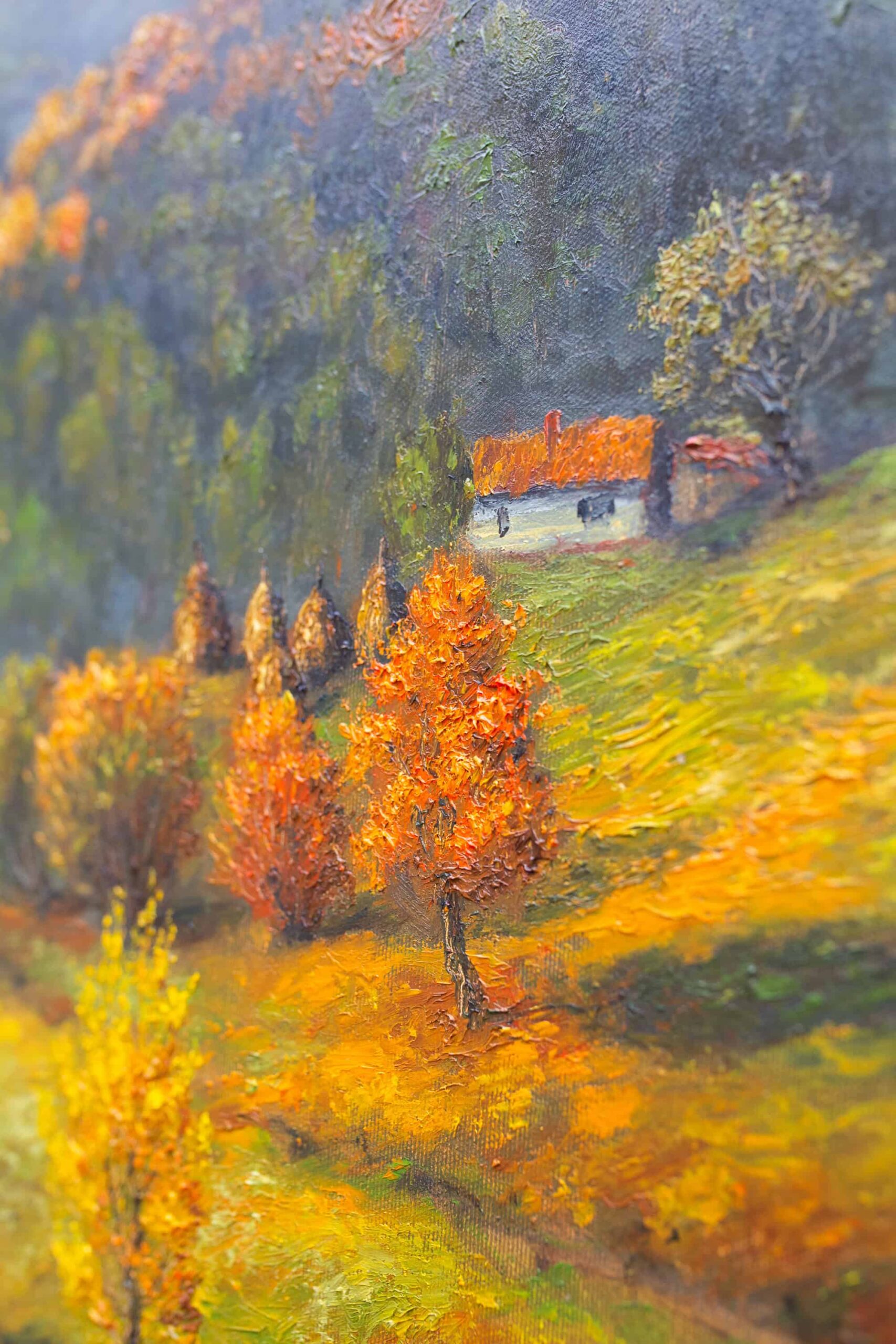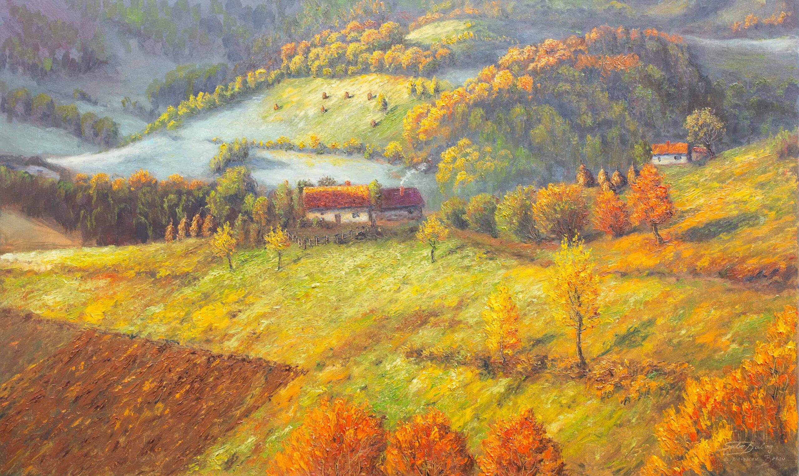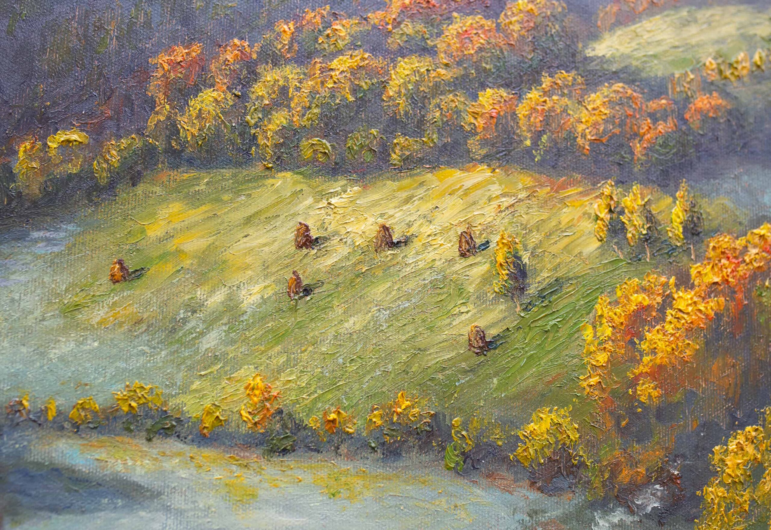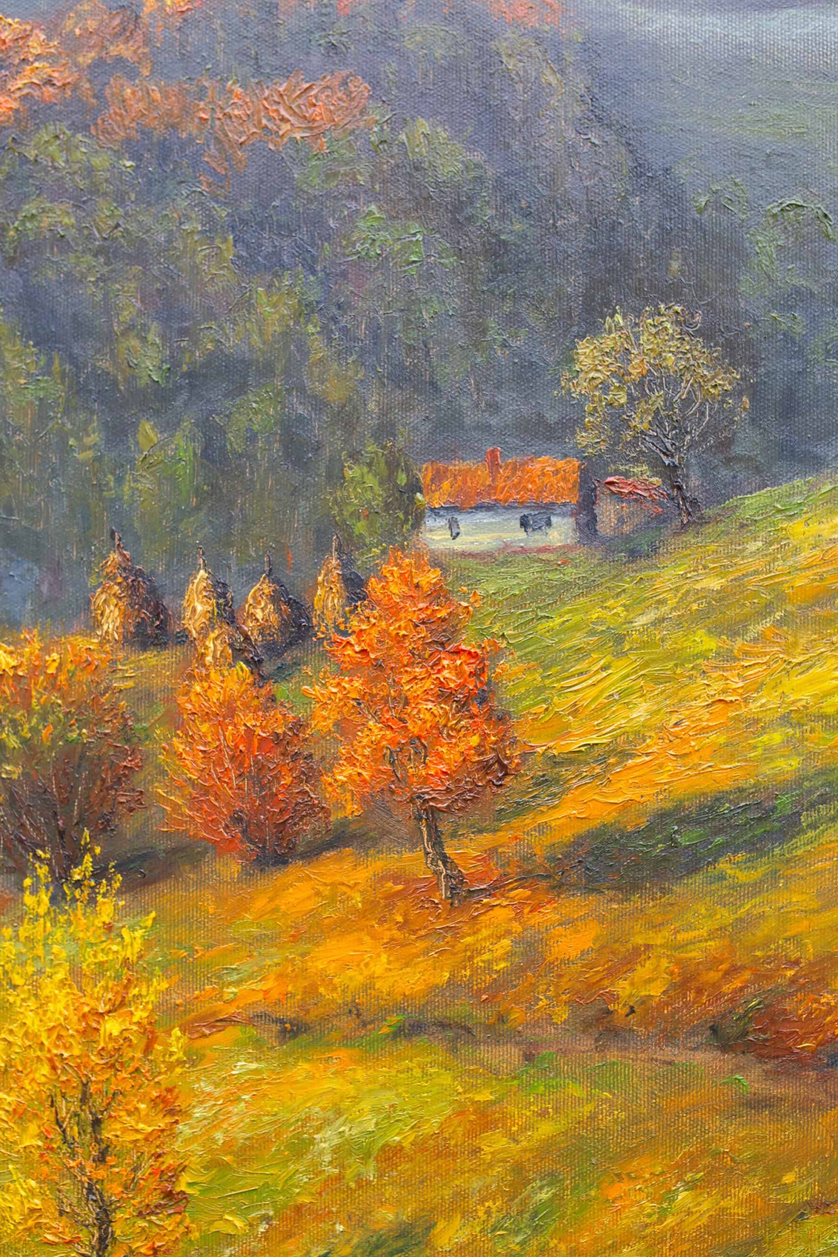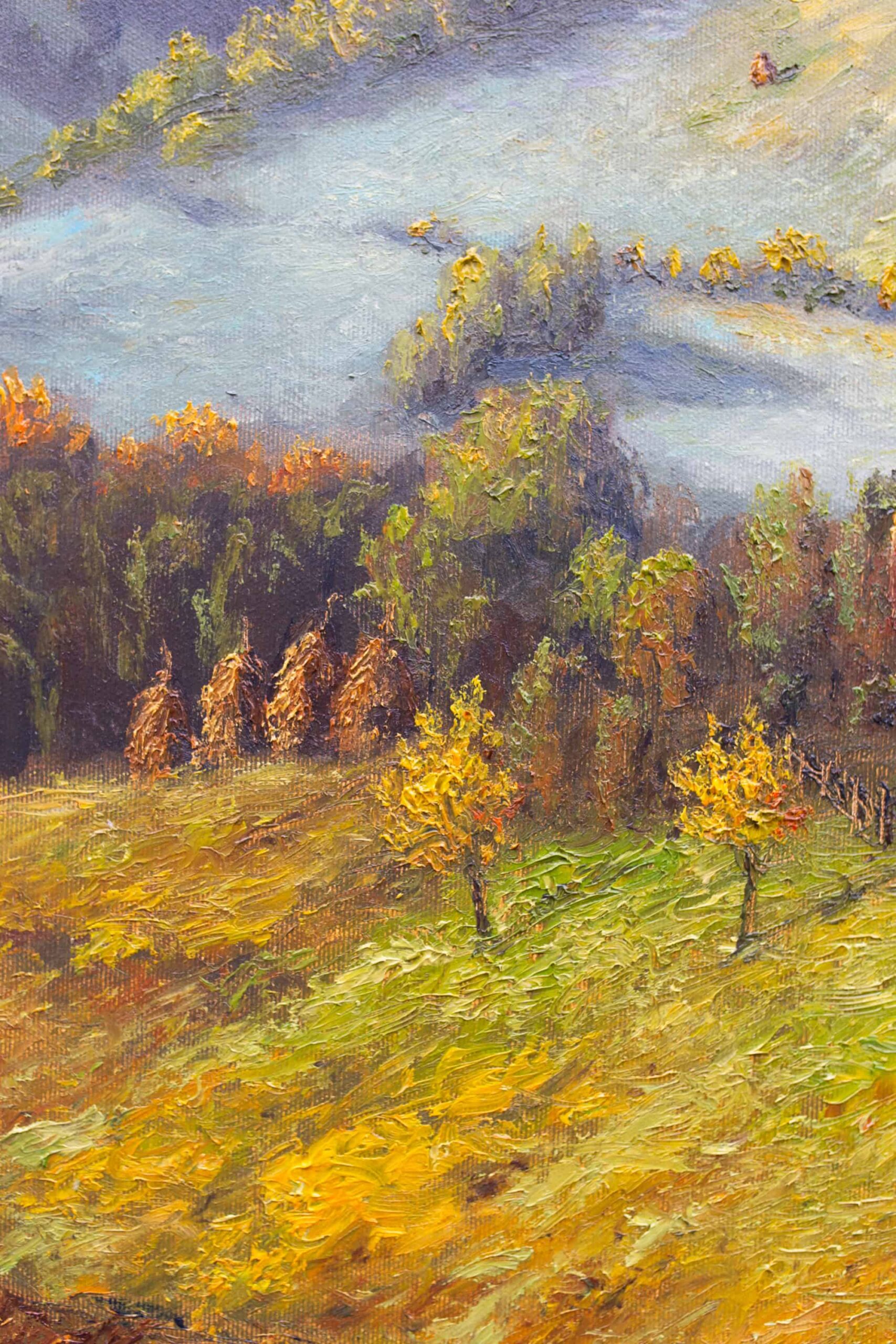 Autor zachycuje podzimní období, kdy se horská krajina mění v bohatou paletu barev. Zlaté, měděné a červené tóny se mísí s tmavě zelenými lesy. Společně vytvářejí harmonickou a klidně působící scenérii. Dílo vyjadřuje blízkost člověka k přírodě a krásu života v jejím přirozeném rytmu. Karpaty zde ukazují svou jedinečnou tvář, která se mění s každým ročním obdobím.