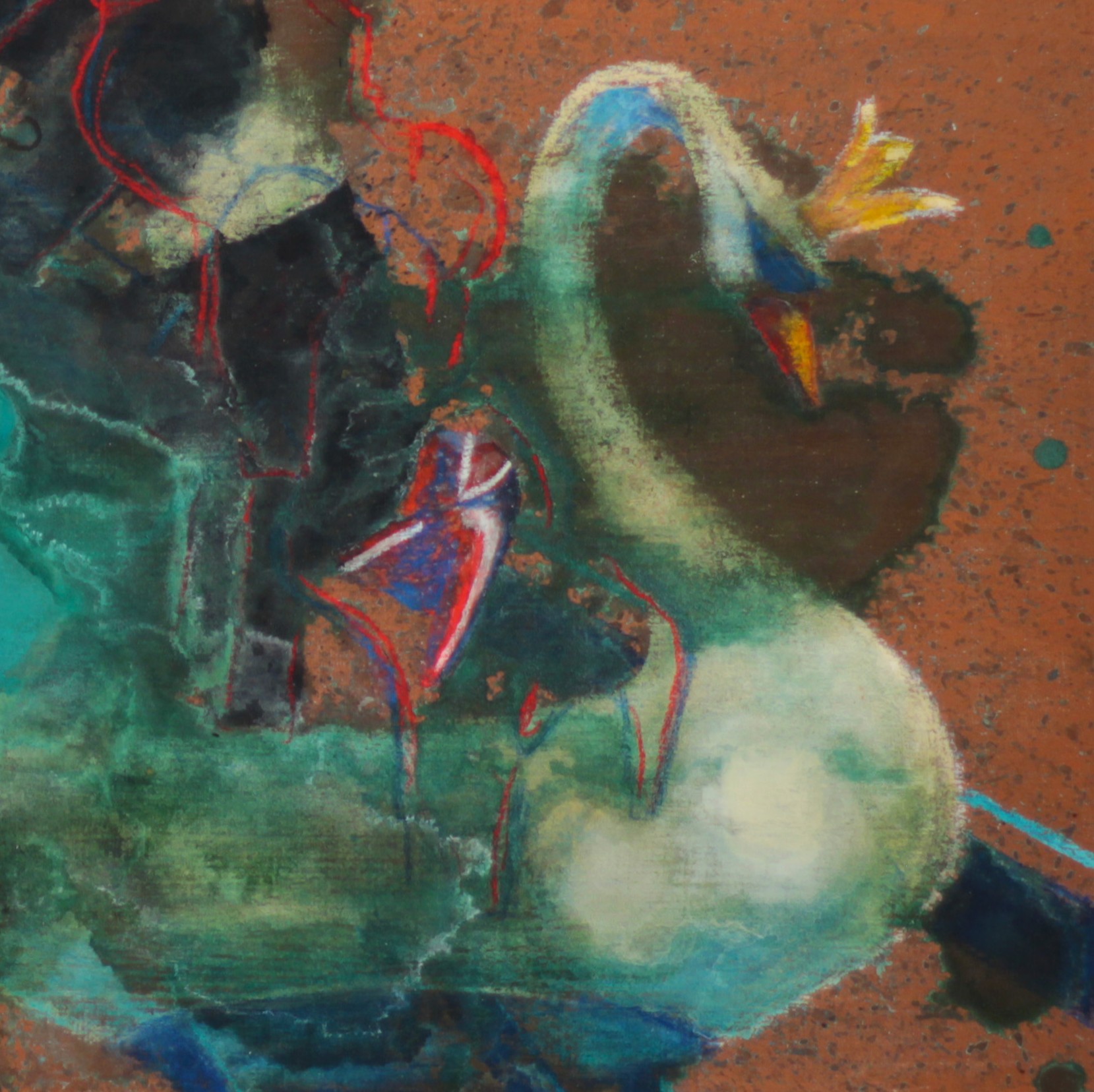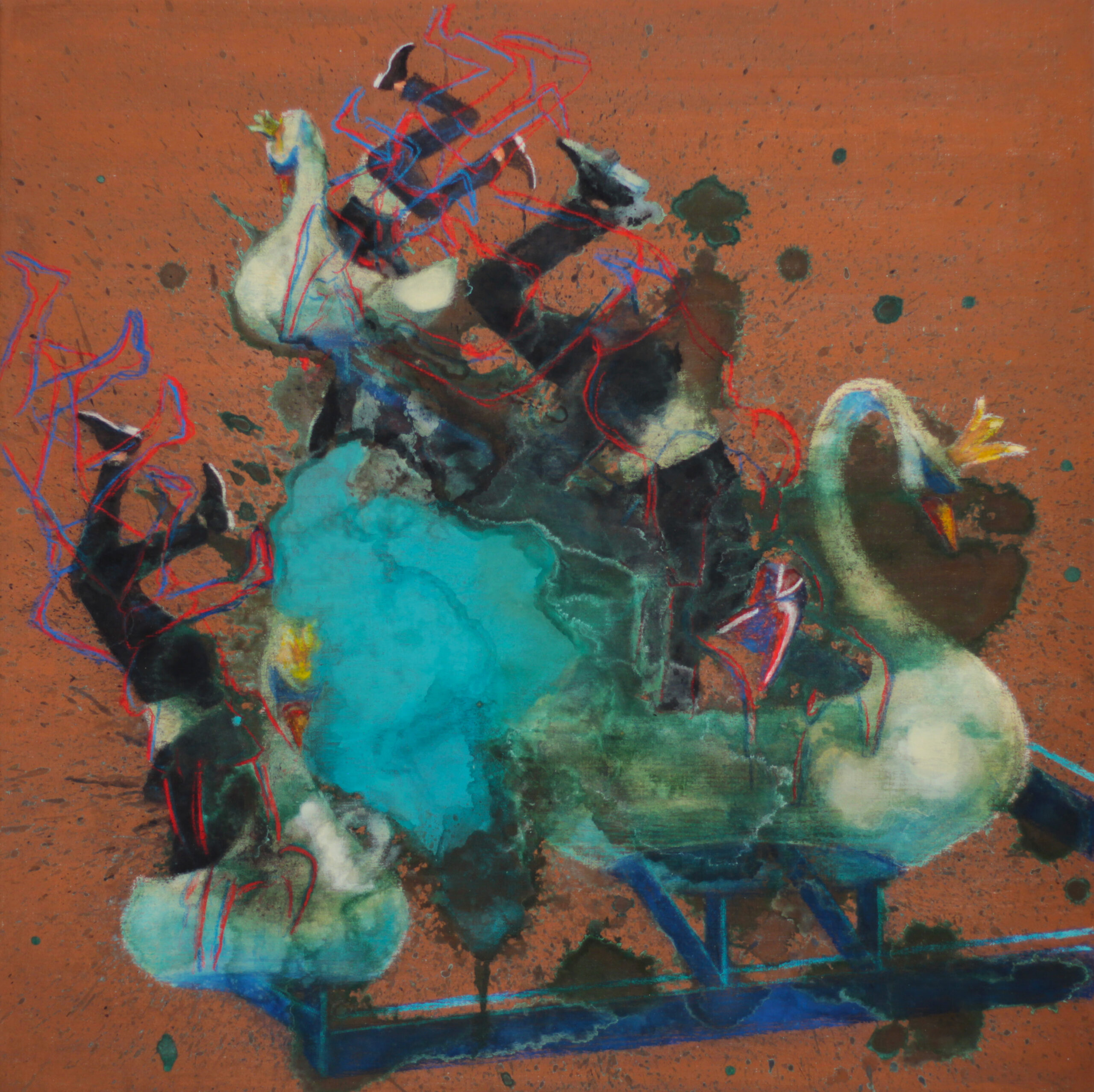Dynamické a surrealistické ztvárnění poutového kolotoče, jehož ramena tvoří labutě. Na jejich hřbetech stojí postavy na rukou a hledají rovnováhu v pohybu a chaosu kolotoče. Autor kombinuje realistické detaily s fantazijními prvky, čímž vytváří napětí mezi stabilitou a nestabilitou, pohybem a klidem. Dílo zkoumá hranice fyziky i lidské flexibility a nabízí poetickou reflexi života jako neustálého hledání rovnováhy.