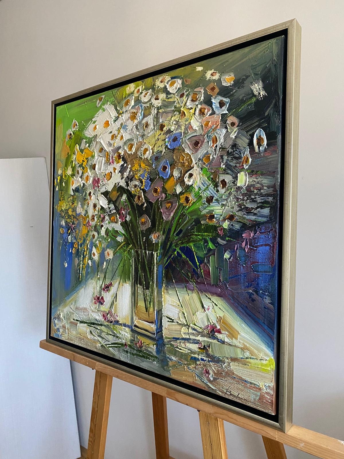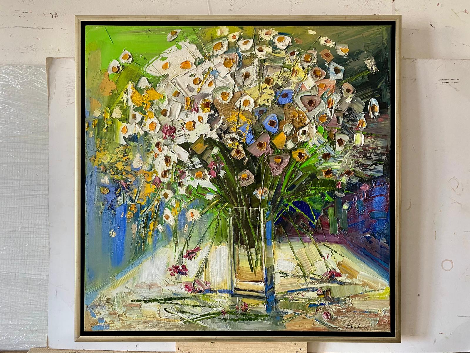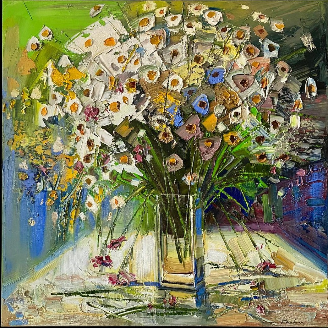 Obraz zobrazuje jednoduchou, přesto působivou scénu: skleněná váza naplněná svěžími bílými kopretinami se žlutými středy stojí na dřevěném stole. Sluneční světlo dopadá jemně z levé strany, odráží se v průhledném skle vázy a osvětluje jednotlivé okvětní lístky. Tlumené, mírně rozostřené pozadí zvýrazňuje jemnost květin a klidný charakter každodenní krásy. Kopretiny působí přirozeně, jako by je právě utrhli ze zahrady, a kompozice vyzařuje pocit čistoty, něžnosti a pohody.