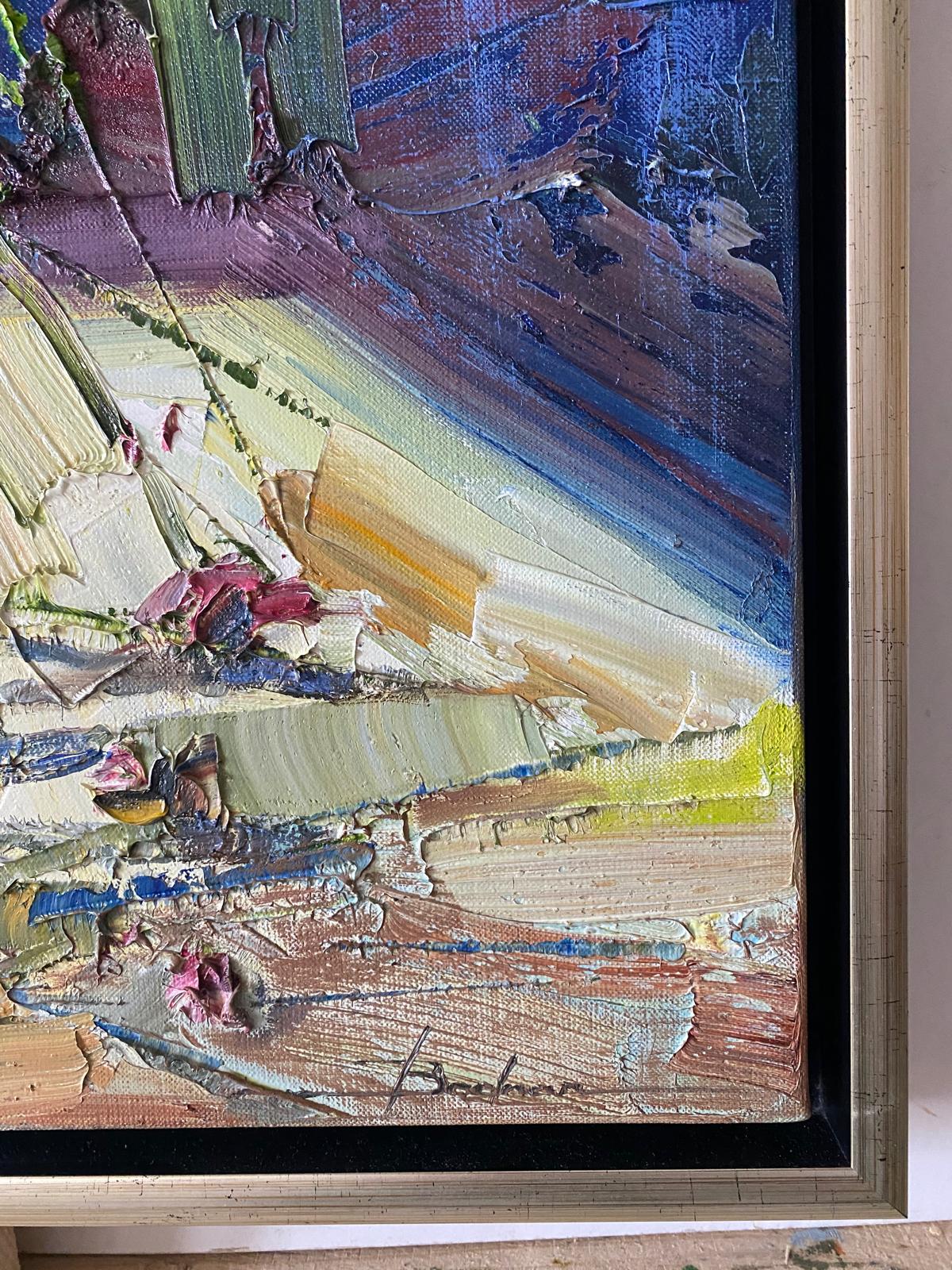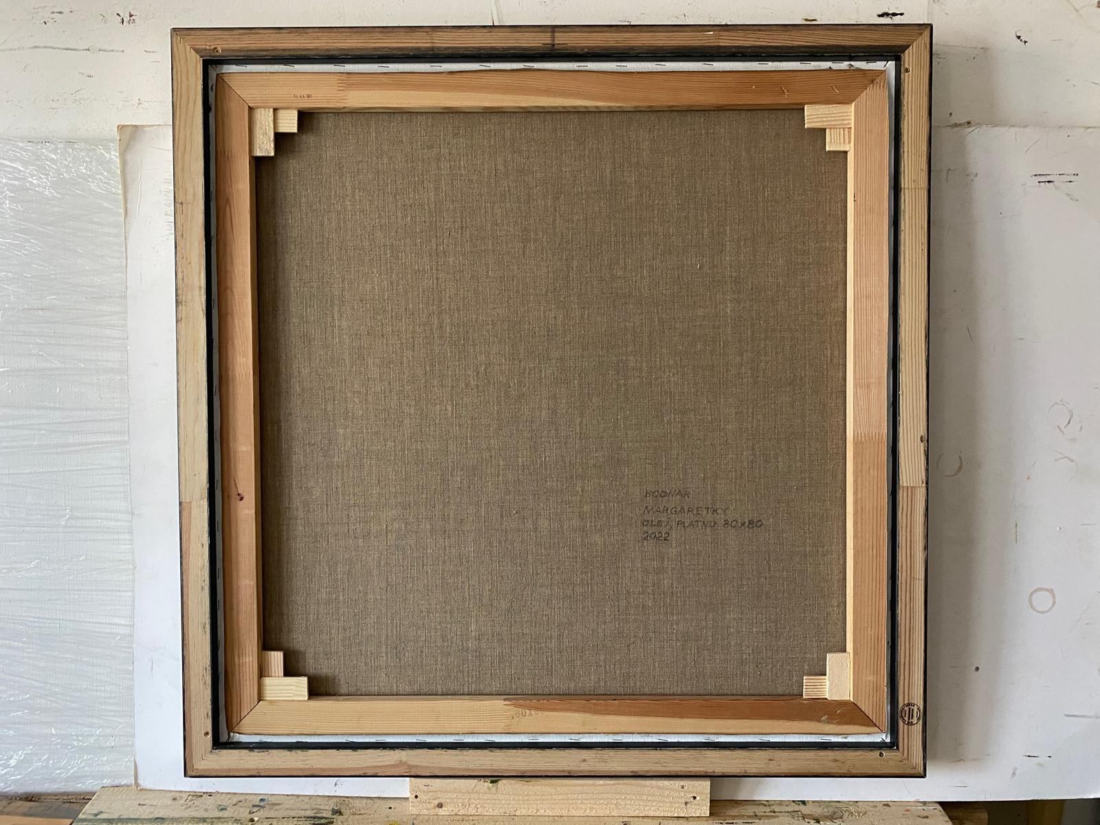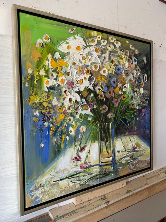 Obraz zobrazuje jednoduchou, přesto působivou scénu: skleněná váza naplněná svěžími bílými kopretinami se žlutými středy stojí na dřevěném stole. Sluneční světlo dopadá jemně z levé strany, odráží se v průhledném skle vázy a osvětluje jednotlivé okvětní lístky. Tlumené, mírně rozostřené pozadí zvýrazňuje jemnost květin a klidný charakter každodenní krásy. Kopretiny působí přirozeně, jako by je právě utrhli ze zahrady, a kompozice vyzařuje pocit čistoty, něžnosti a pohody.