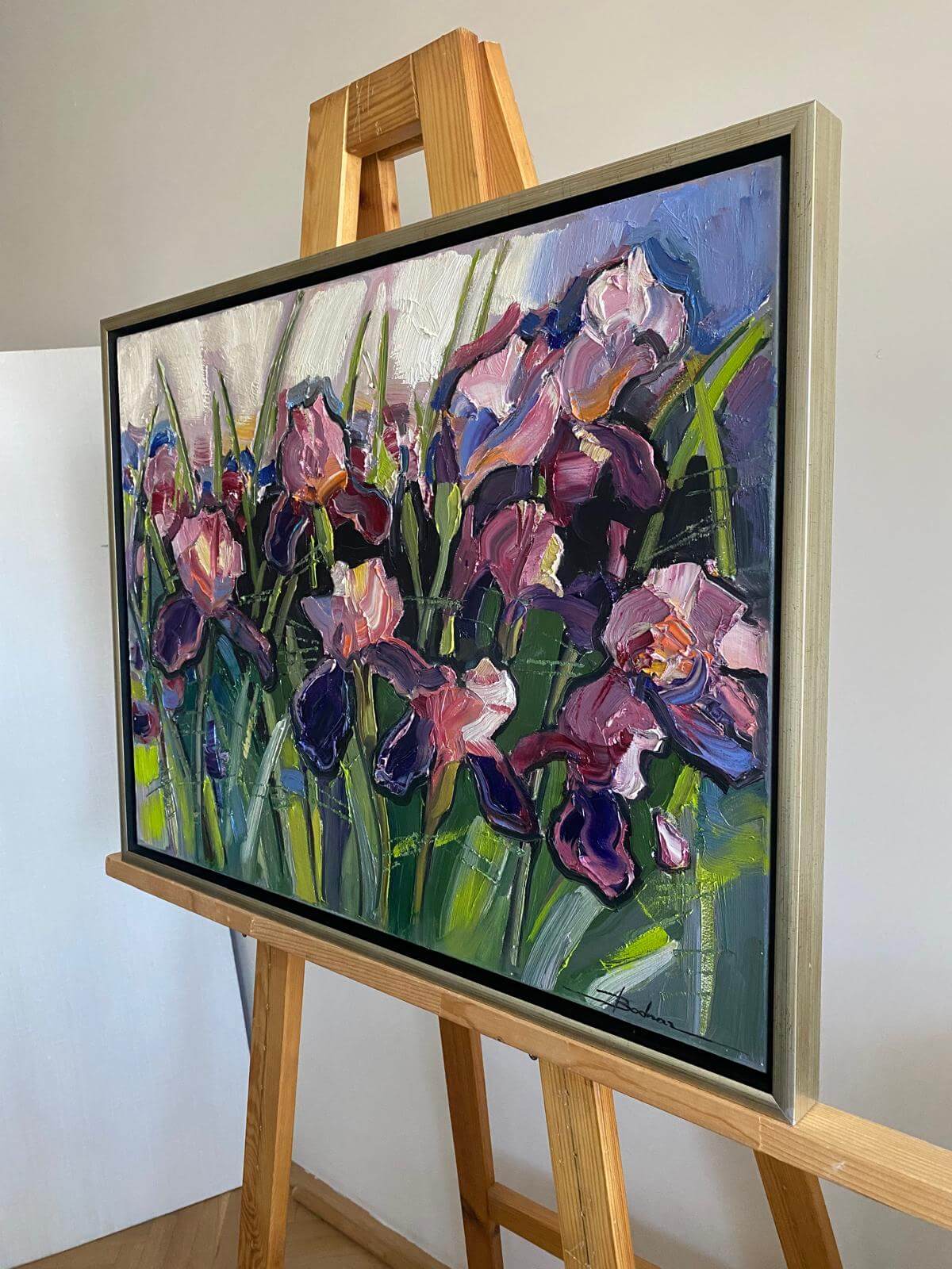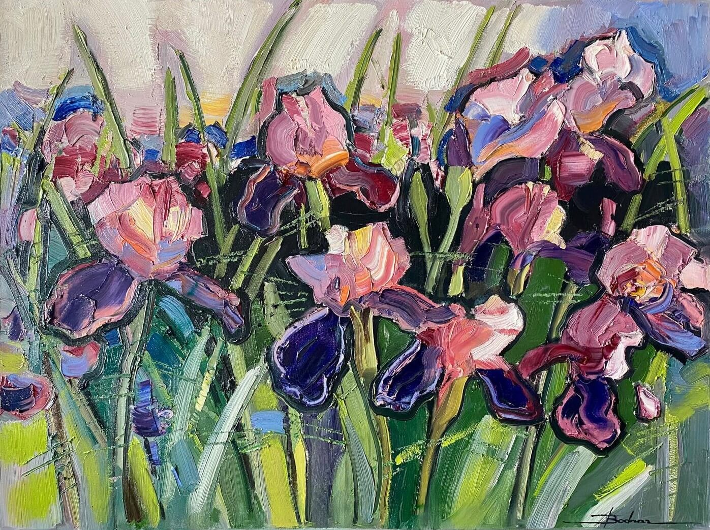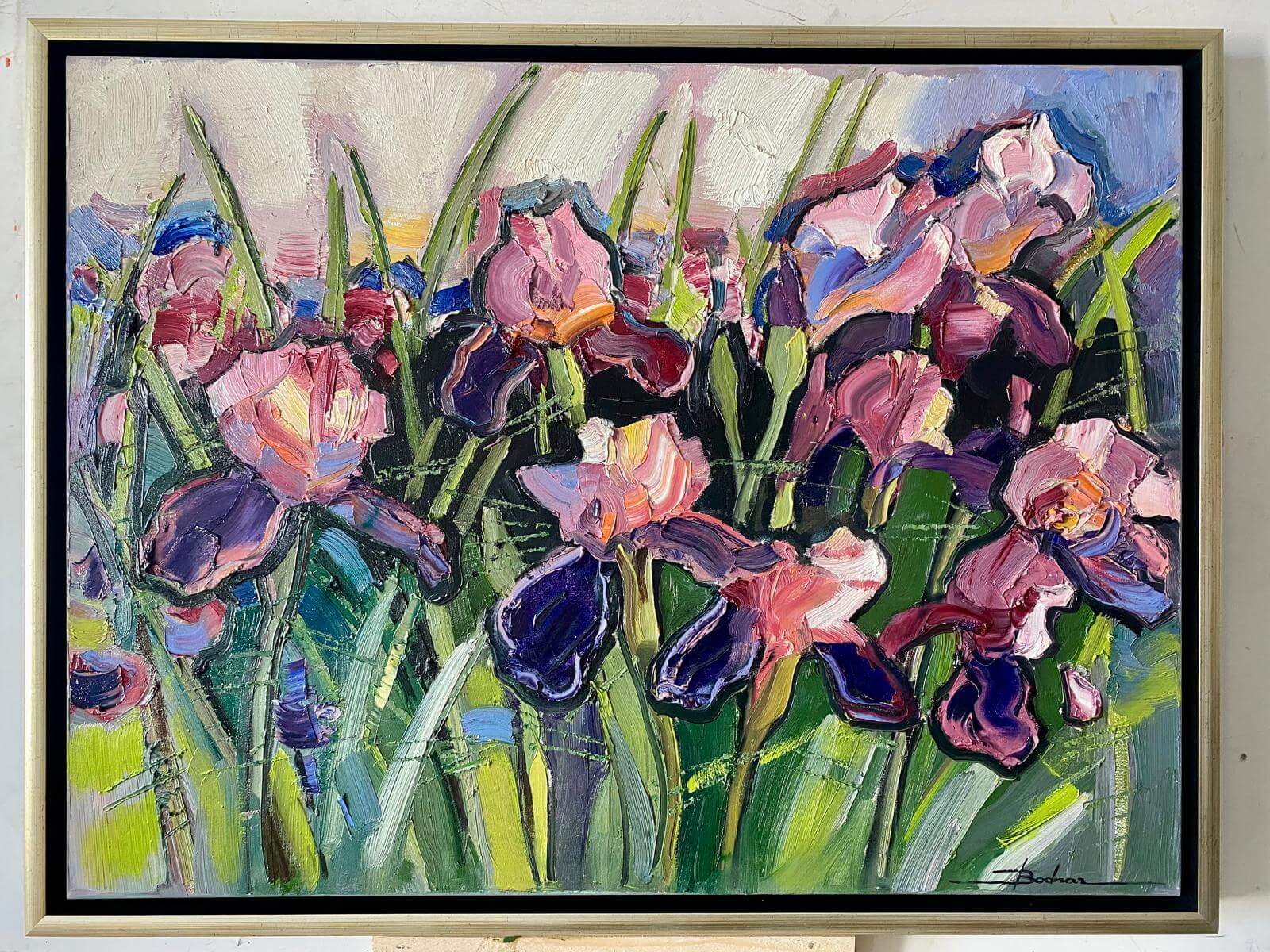 Toto živé umělecké dílo zachycuje rozkvetlou zahradu kosatců, přičemž efektně zdůrazňuje hru barev a tvarů. Mykola Bodnar pracuje s výraznými tahy štětce, které obrazu dodávají pohyb a energii. Syté fialové odstíny v kontrastu s jemnými růžovými tóny zvýrazňují detaily květů, zatímco zelené stonky a listy vytvářejí přirozené pozadí. Styl malby spojuje expresivitu s realistickým přístupem, a proto působí spontánně a živým dojmem. Světlo a stín dodávají hloubku a podtrhují jemnou strukturu okvětních lístků. Celkově dílo zaujme dynamickou kompozicí a harmonickou prací s barvami, díky čemuž krásně vystihuje půvab a jedinečnost rozkvetlých kosatců.