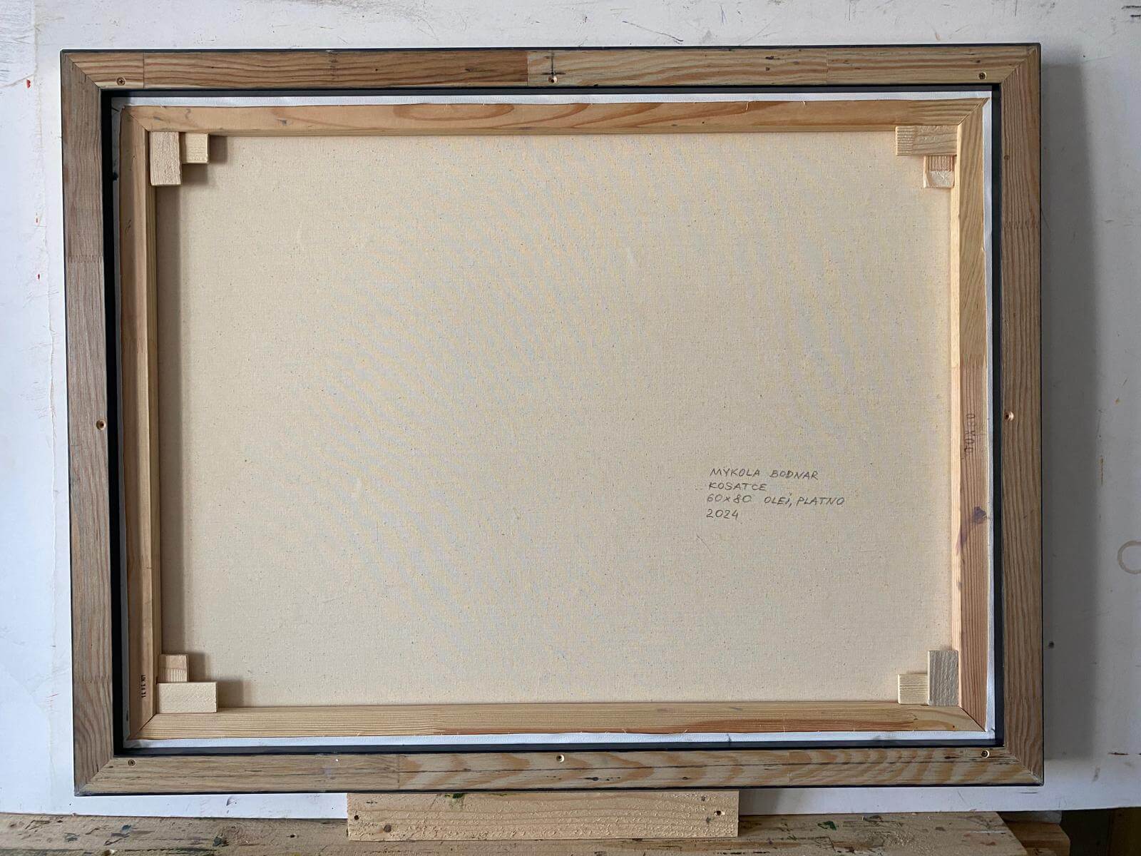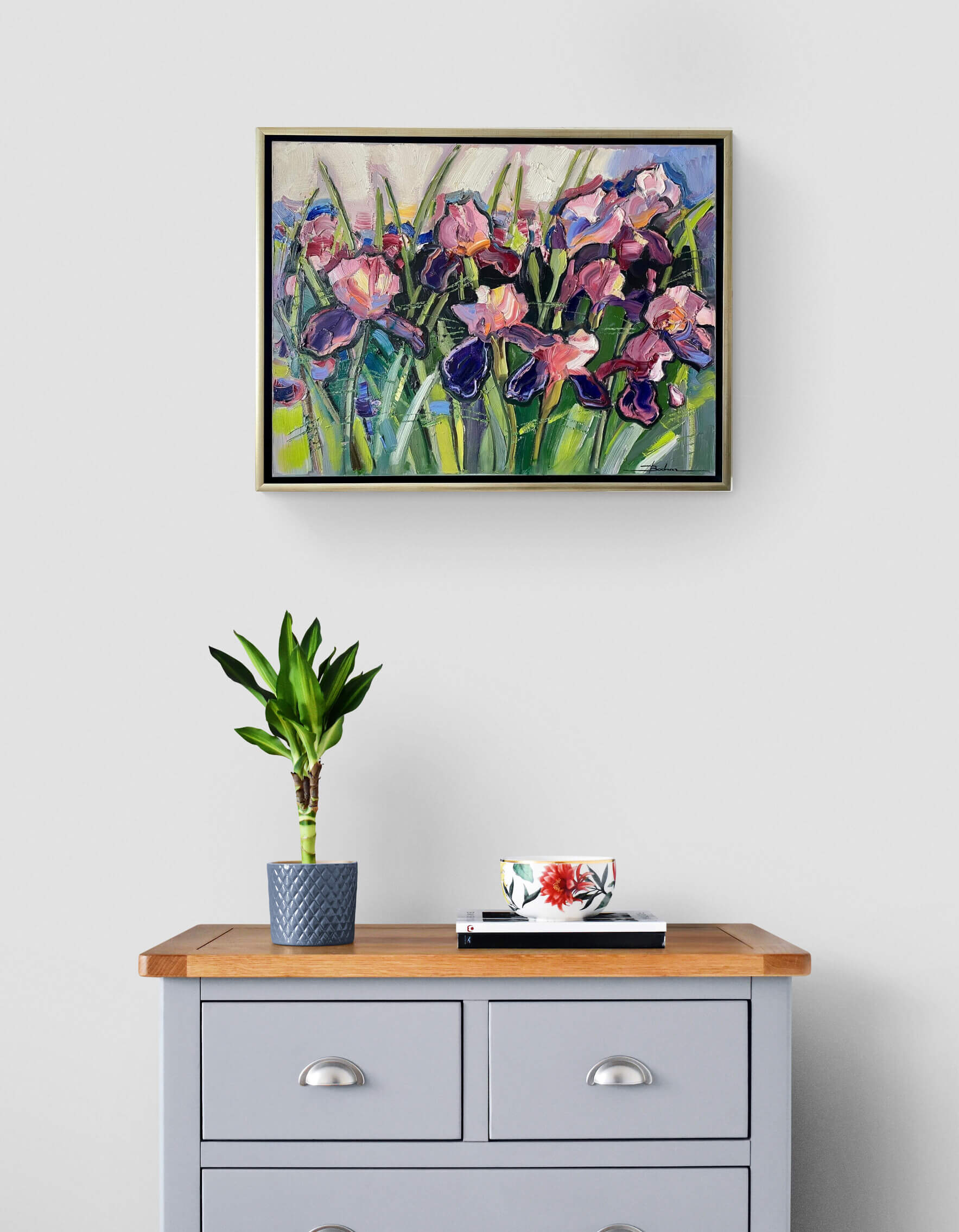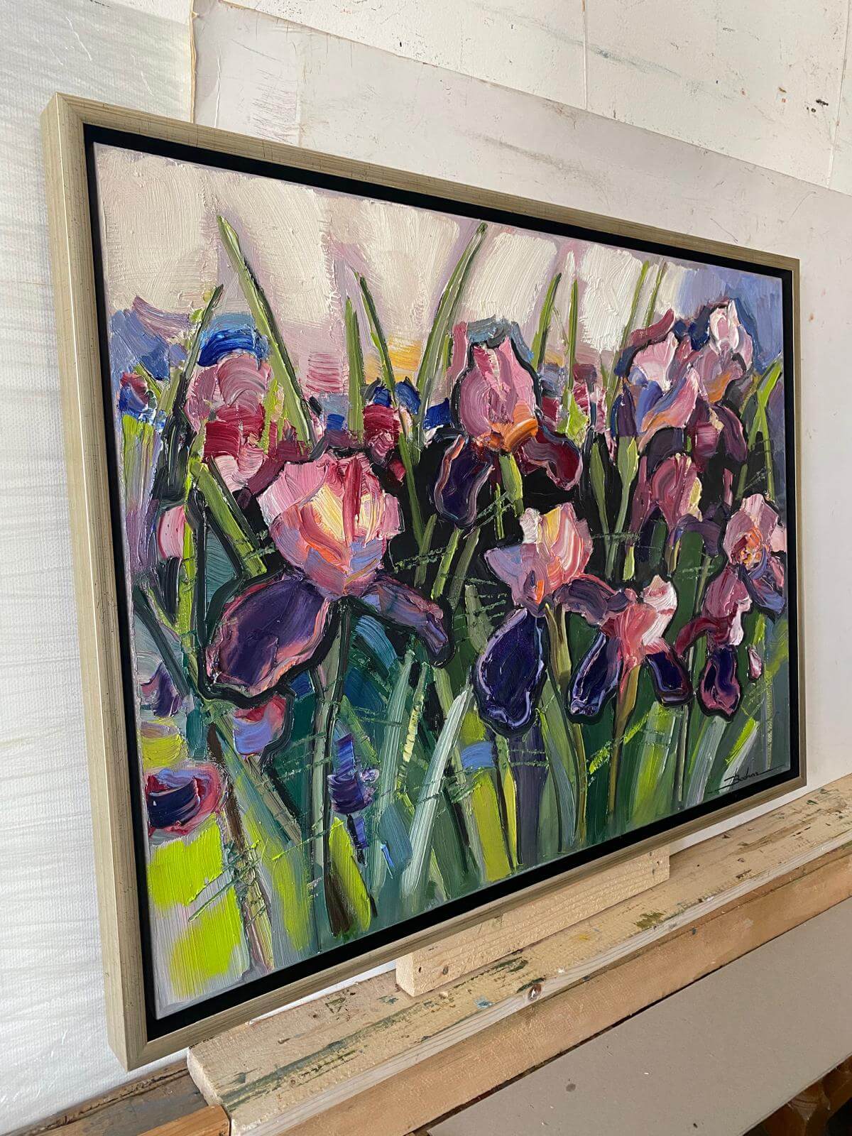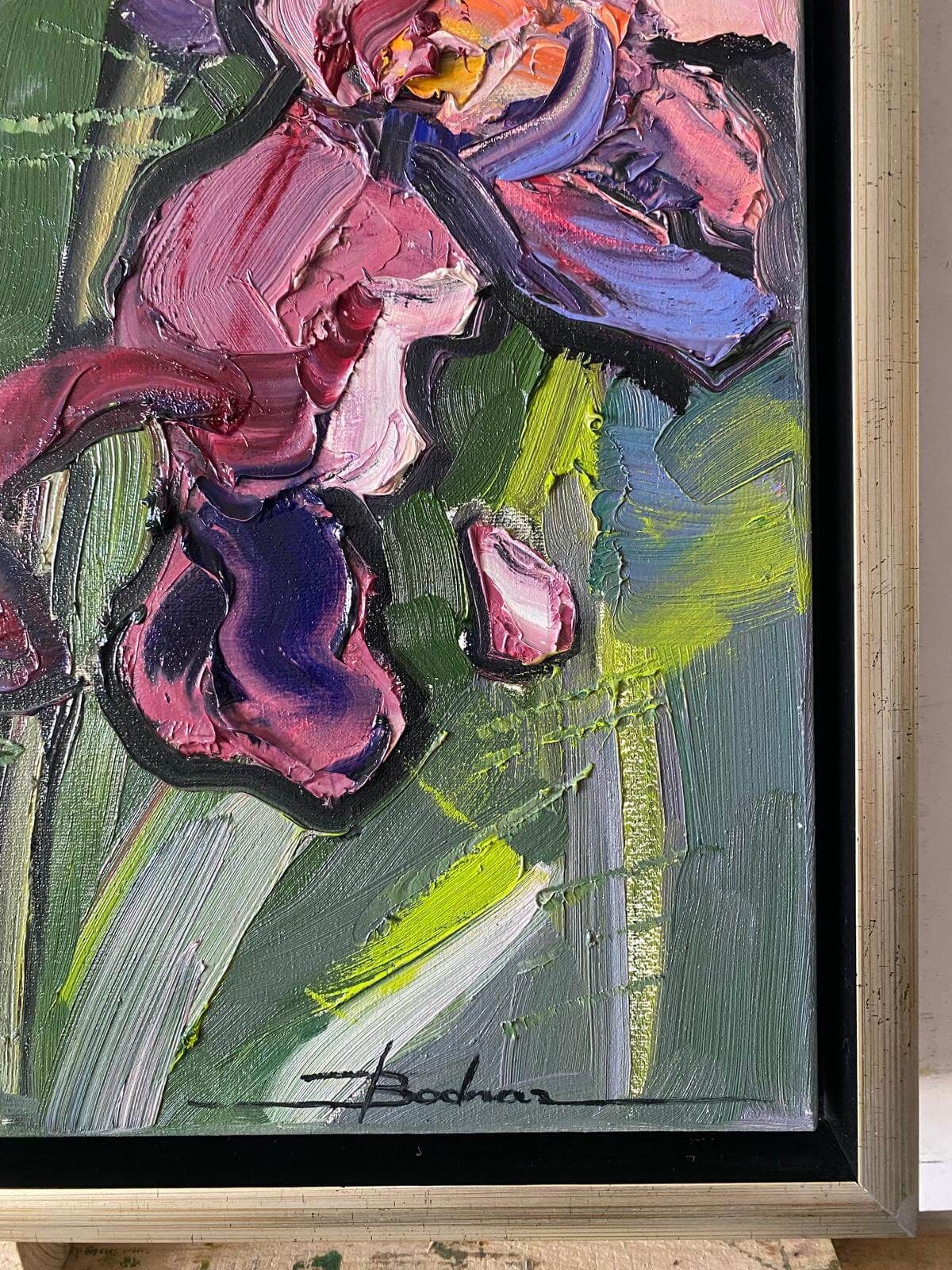 Toto živé umělecké dílo zachycuje rozkvetlou zahradu kosatců, přičemž efektně zdůrazňuje hru barev a tvarů. Mykola Bodnar pracuje s výraznými tahy štětce, které obrazu dodávají pohyb a energii. Syté fialové odstíny v kontrastu s jemnými růžovými tóny zvýrazňují detaily květů, zatímco zelené stonky a listy vytvářejí přirozené pozadí. Styl malby spojuje expresivitu s realistickým přístupem, a proto působí spontánně a živým dojmem. Světlo a stín dodávají hloubku a podtrhují jemnou strukturu okvětních lístků. Celkově dílo zaujme dynamickou kompozicí a harmonickou prací s barvami, díky čemuž krásně vystihuje půvab a jedinečnost rozkvetlých kosatců.