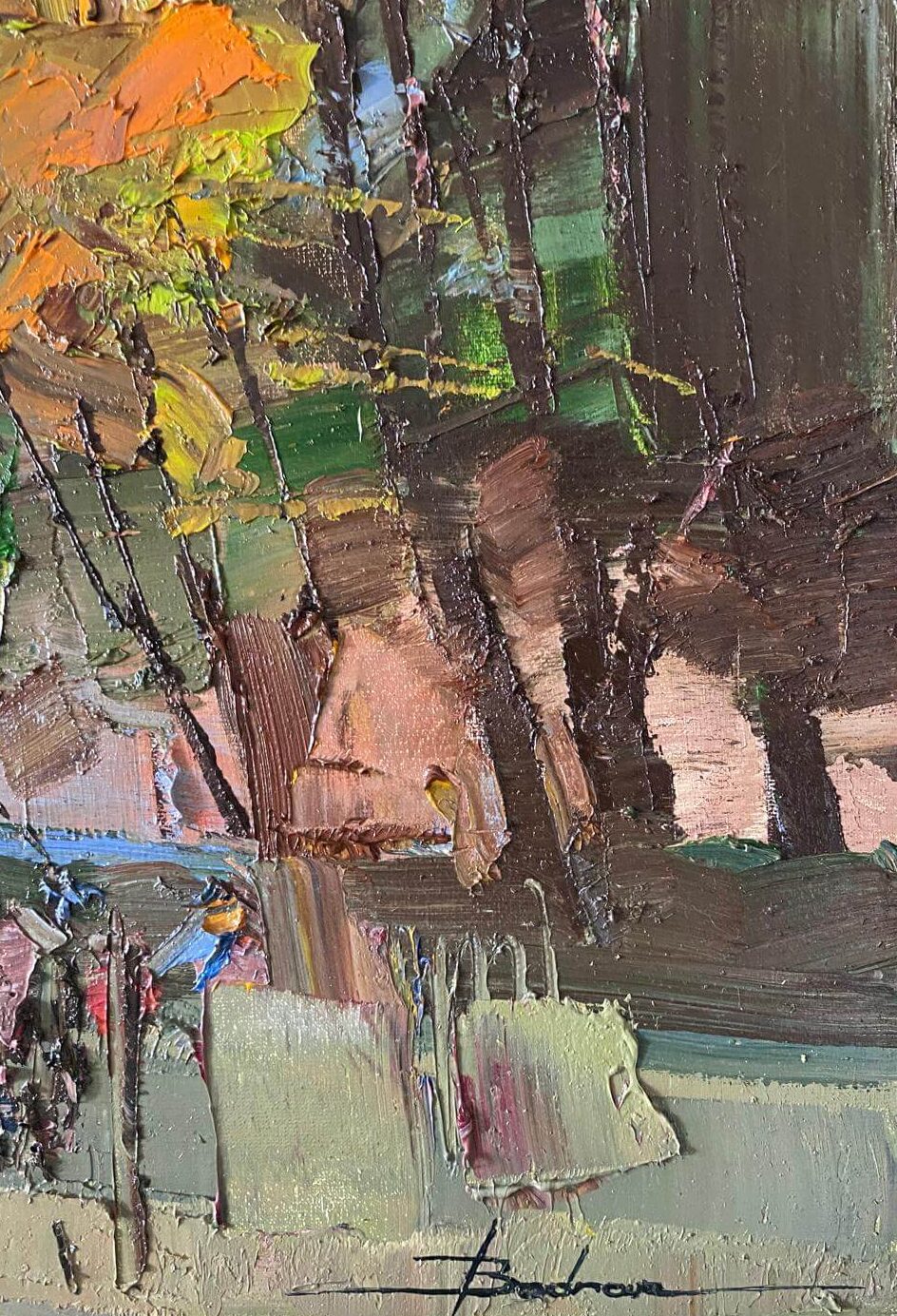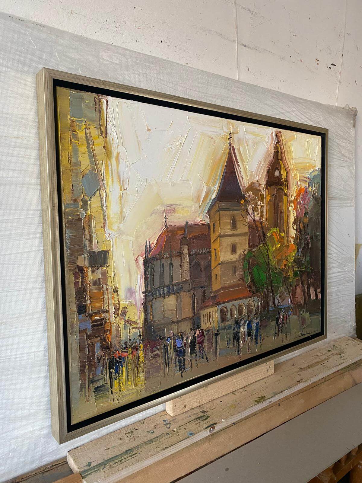 Barevná paleta obrazu převládá v odstínech béžové a hnědé, doplněná jemnými vícebarevnými akcenty, které scéně dodávají živost a hloubku. Tyto odstíny podtrhují historický charakter katedrály a vyvolávají dojem teplého slunečného dne, během kterého návštěvníci obdivují její krásu. Před kostelem se pohybují lidé, každá postava směřuje pohledem k majestátní stavbě, což dílu přidává dynamiku a lidský rozměr. Bodnar zobrazuje postavy nenásilně a přirozeně, čímž zdůrazňuje harmonii mezi architekturou a jejím okolím.