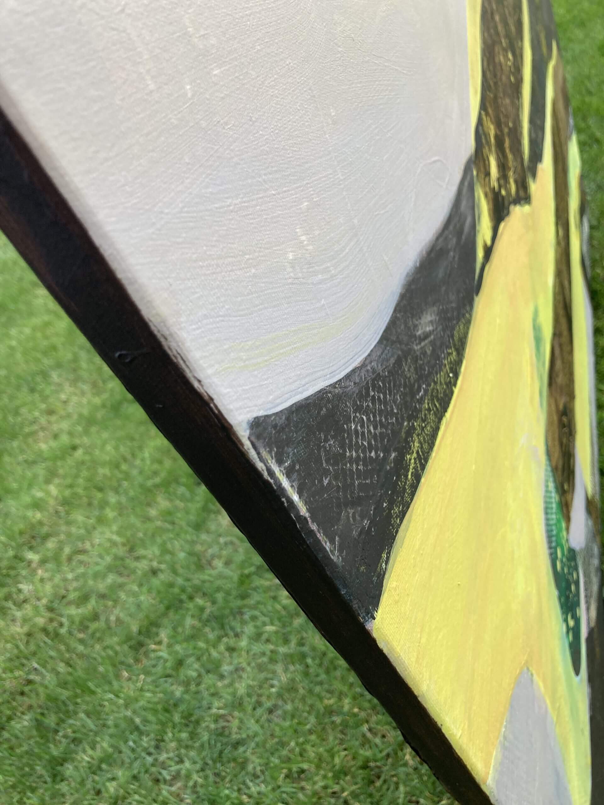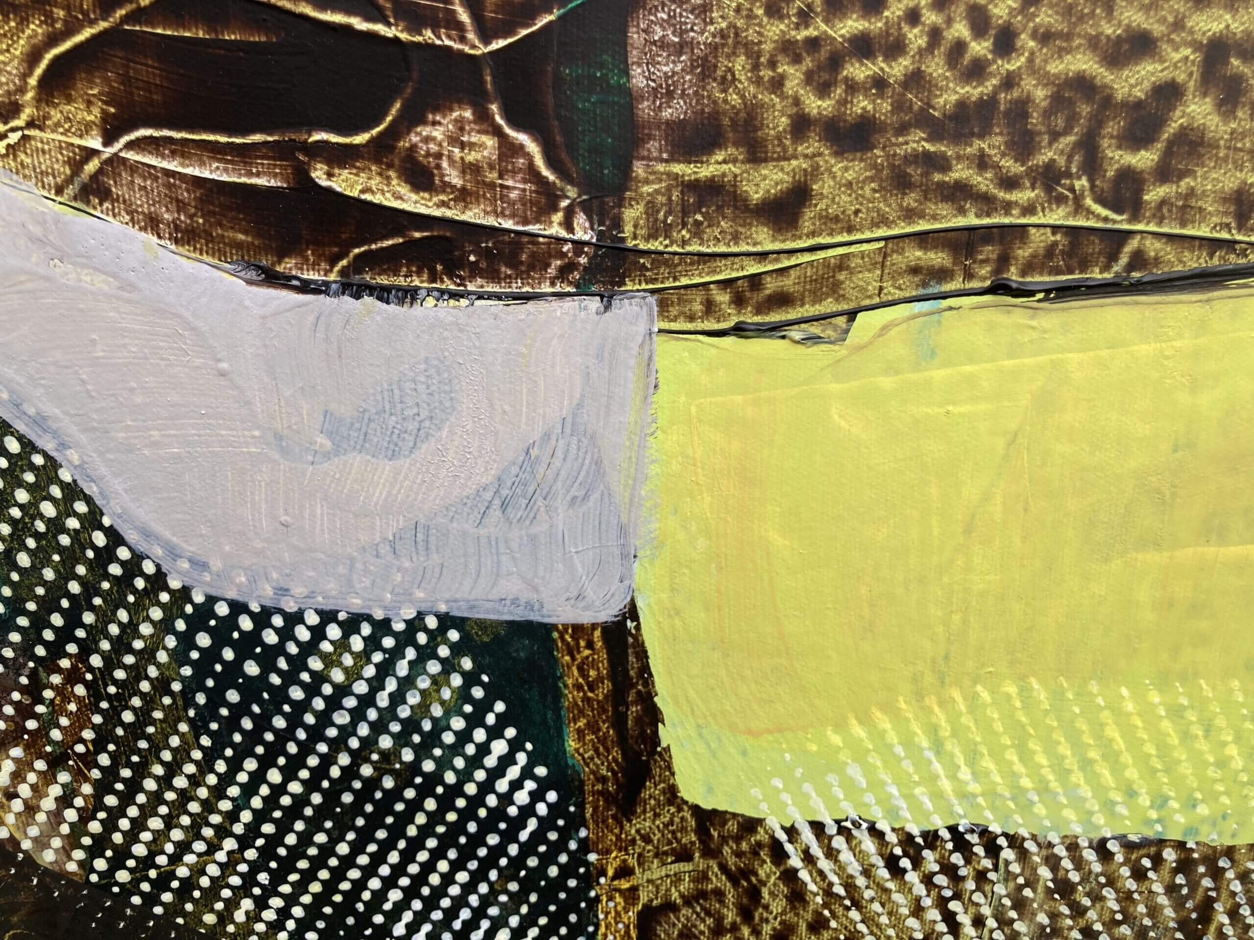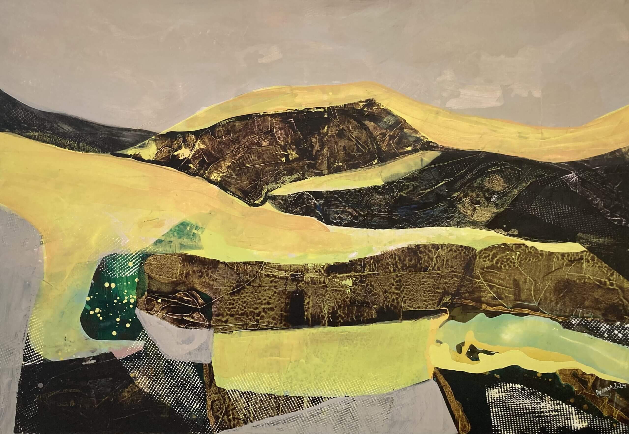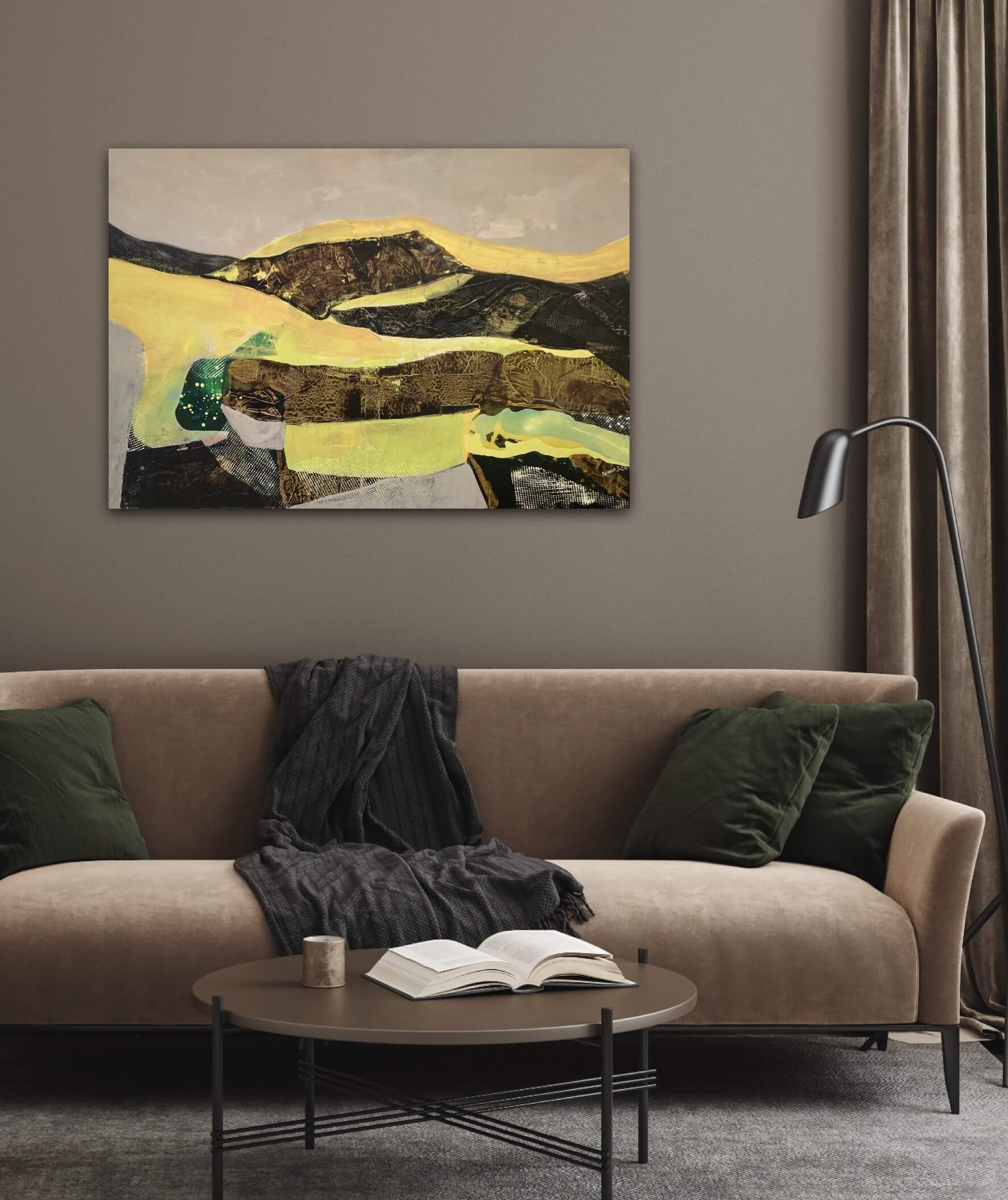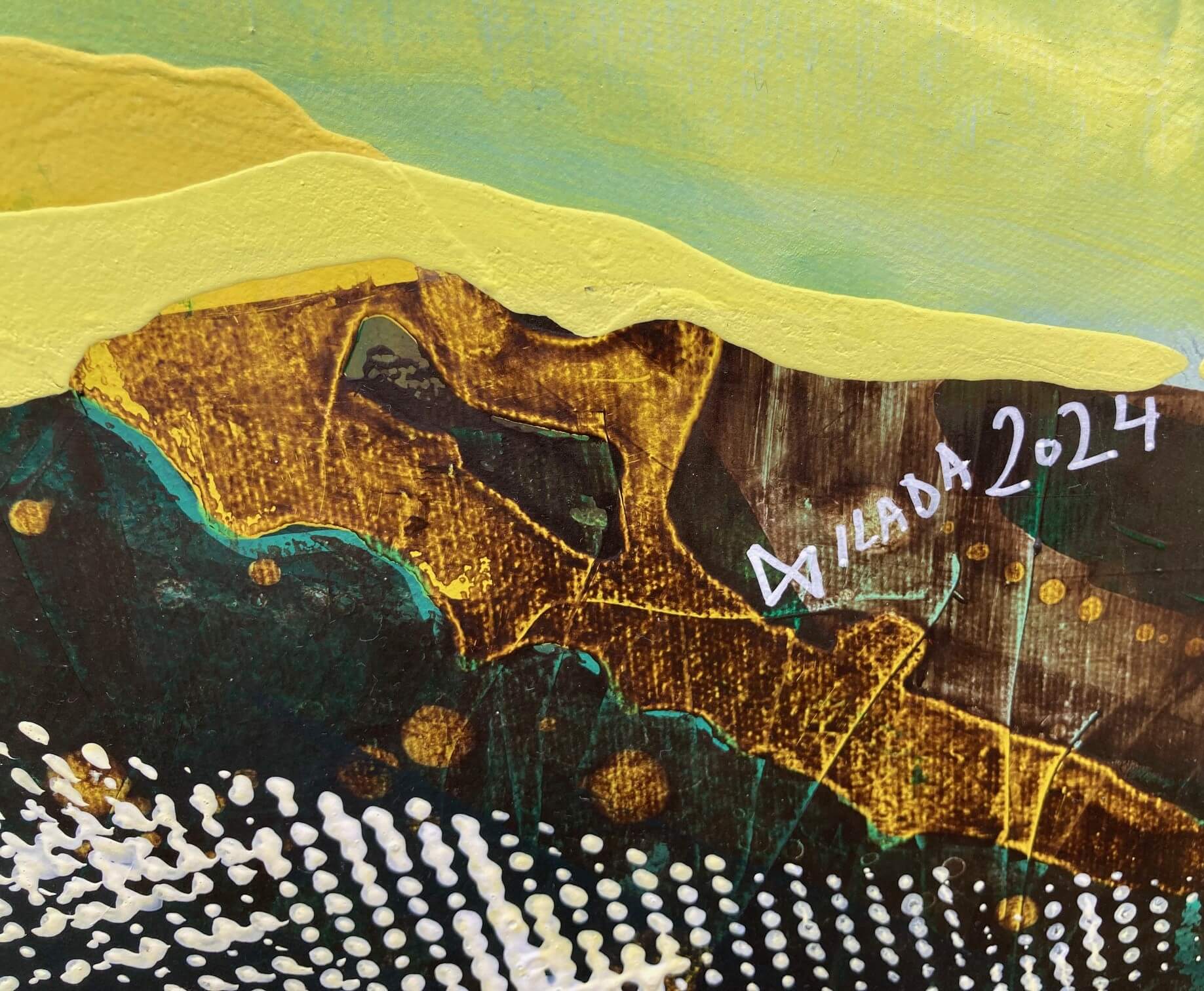 Obraz představuje abstraktní krajinářskou kompozici plnou živých barev a organických tvarů. Barvy jako žlutá, béžová a hnědá vytvářejí dynamickou a harmonickou atmosféru, která upoutá pozornost diváka. Vrstvy a textury naznačují přírodní motivy, jako jsou kopce, řeky či lesy, a zároveň umožňují divákovi vytvořit si vlastní interpretaci. Každý tah štětce přináší pocit pohybu, energie a života, což dodává obrazu vizuální hloubku a emoční intenzitu.