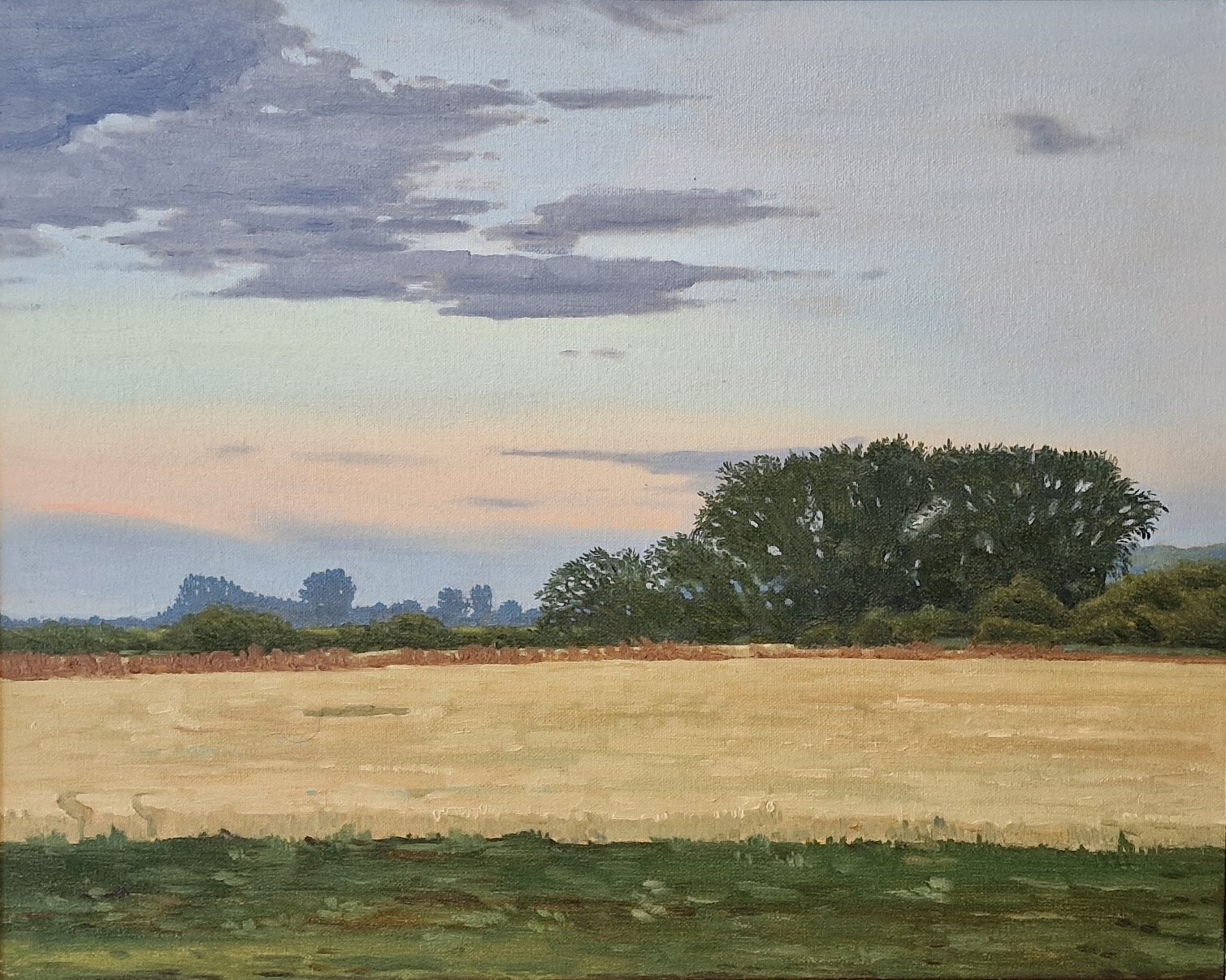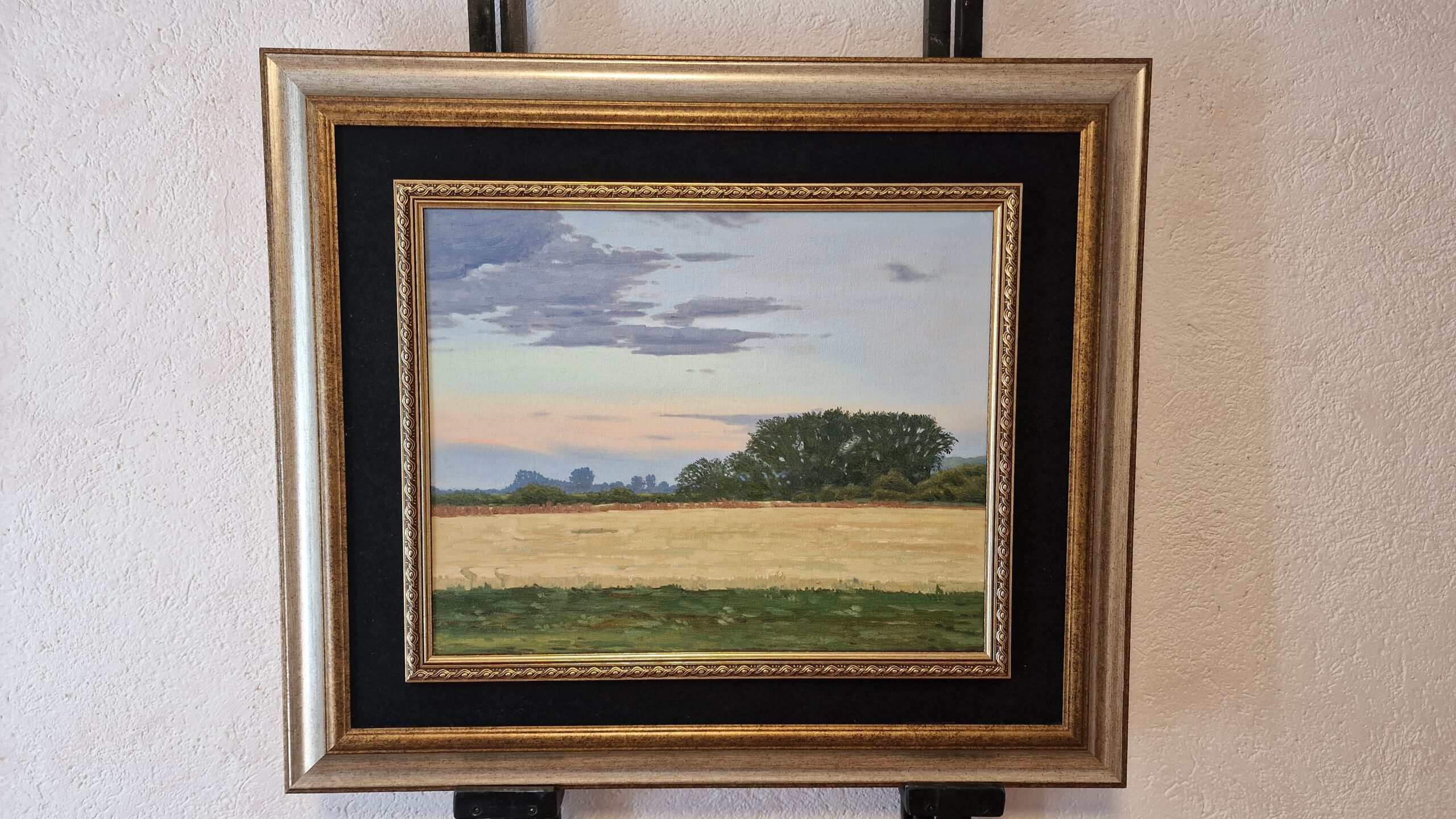 Obraz zachycuje letní krajinu v okamžiku, kdy den pomalu ustupuje noci. Umělec mistrně vystihl atmosféru doznívajícího dne. V dálce se rozprostírá chladná obloha, kterou jemně prohřívají teplé tóny naznačující zapadající slunce. V popředí se nachází klidná scenérie s kupou sena, jež symbolizuje jednoduchou krásu venkova. Tento obraz vás vtáhne do kouzelného okamžiku, kdy se příroda ukládá k odpočinku, a umožní vám pocítit klidnou harmonii mezi chladem večera a teplem uplynulého dne.