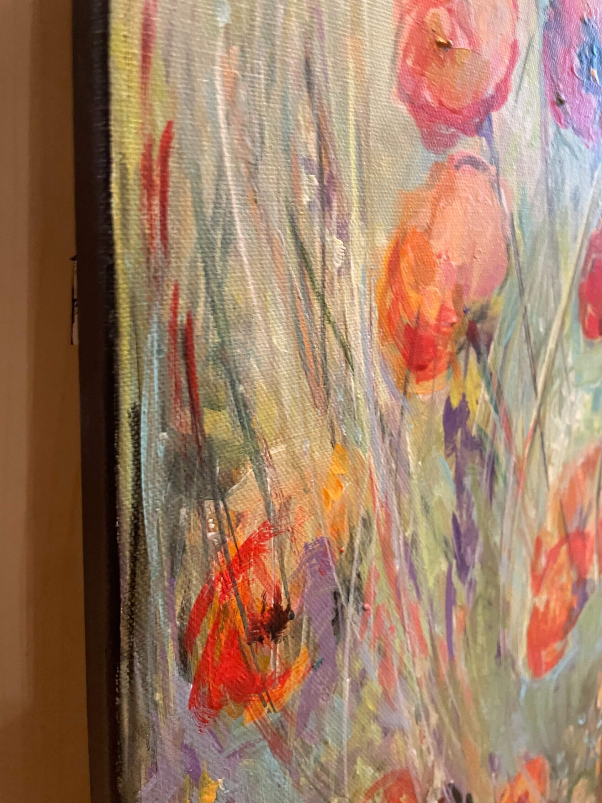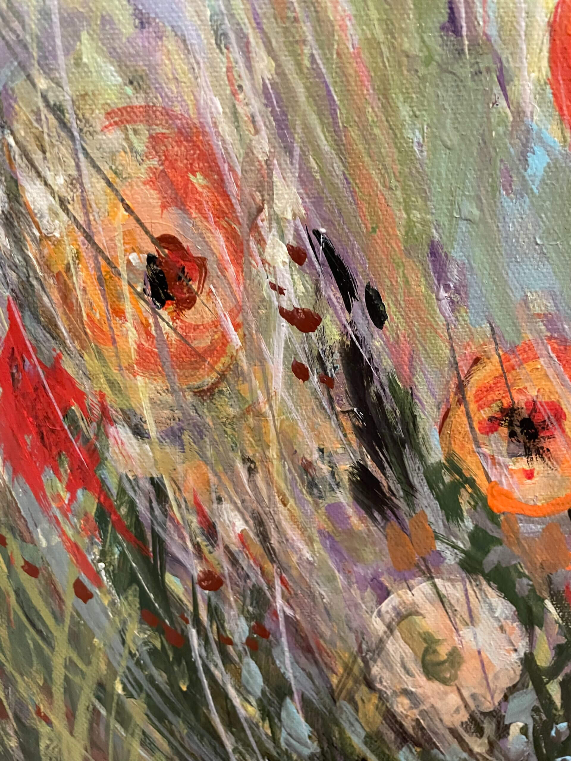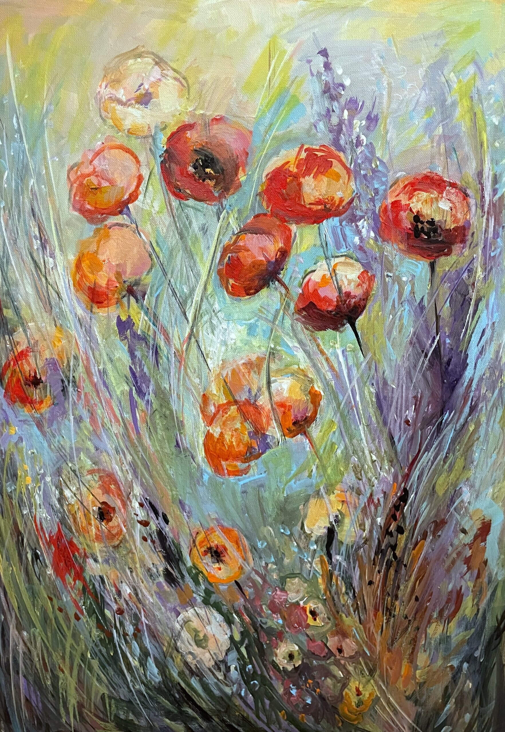 Barevné tóny se volně mísí a vytvářejí pocit pohybu, světla a radosti. Louka nepůsobí staticky – spíše jako okamžik zachycený mezi větrem a sluncem, mezi tichem a životem.