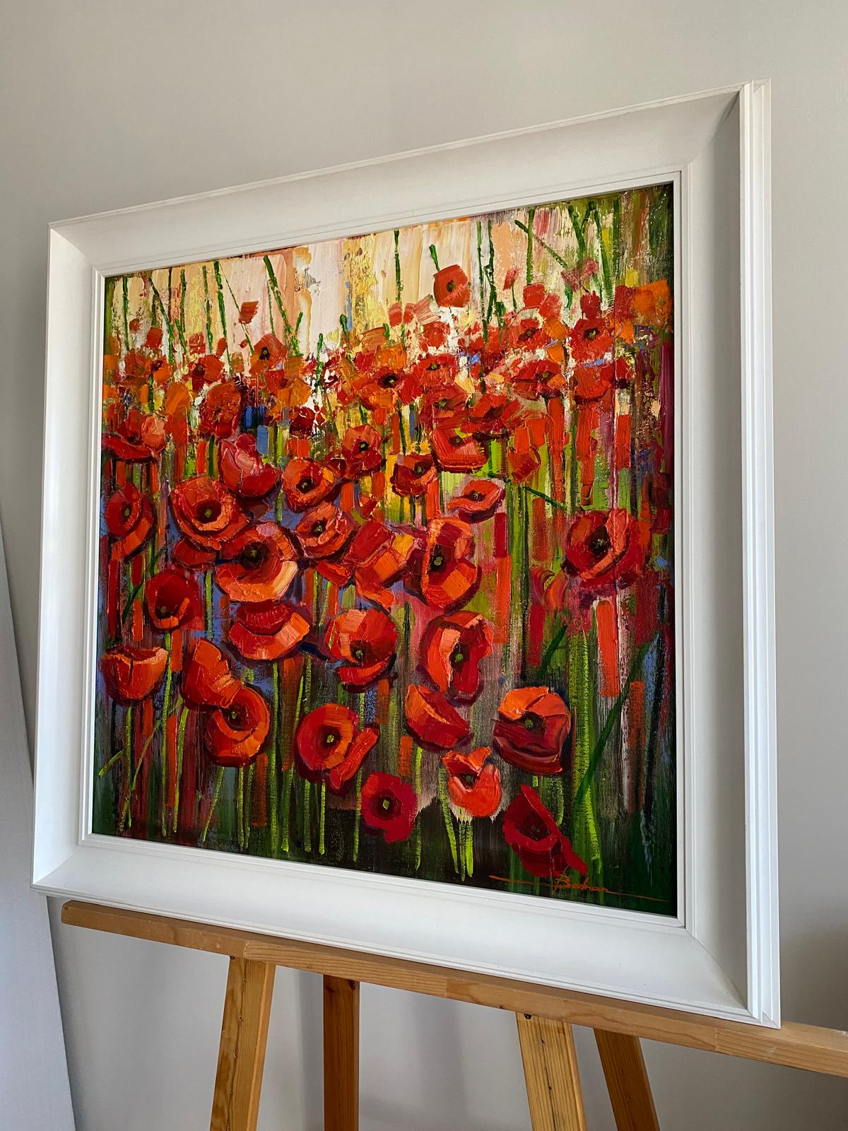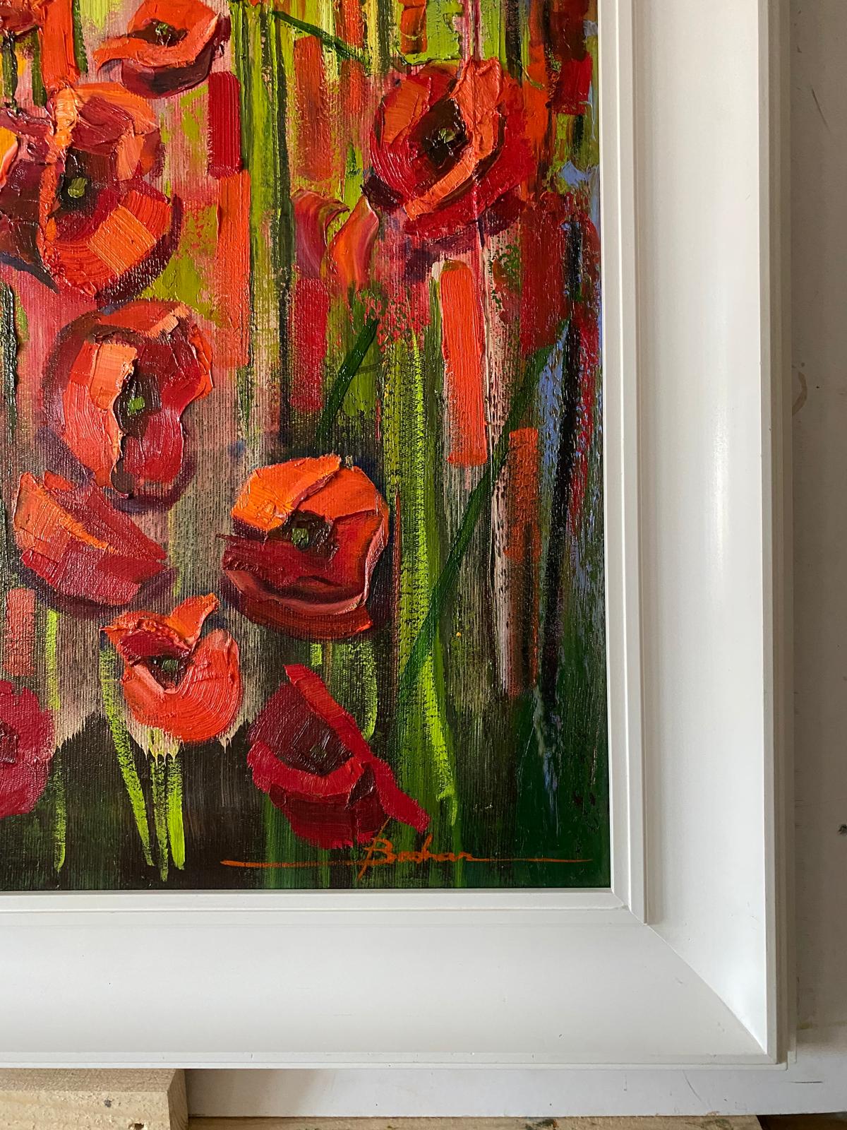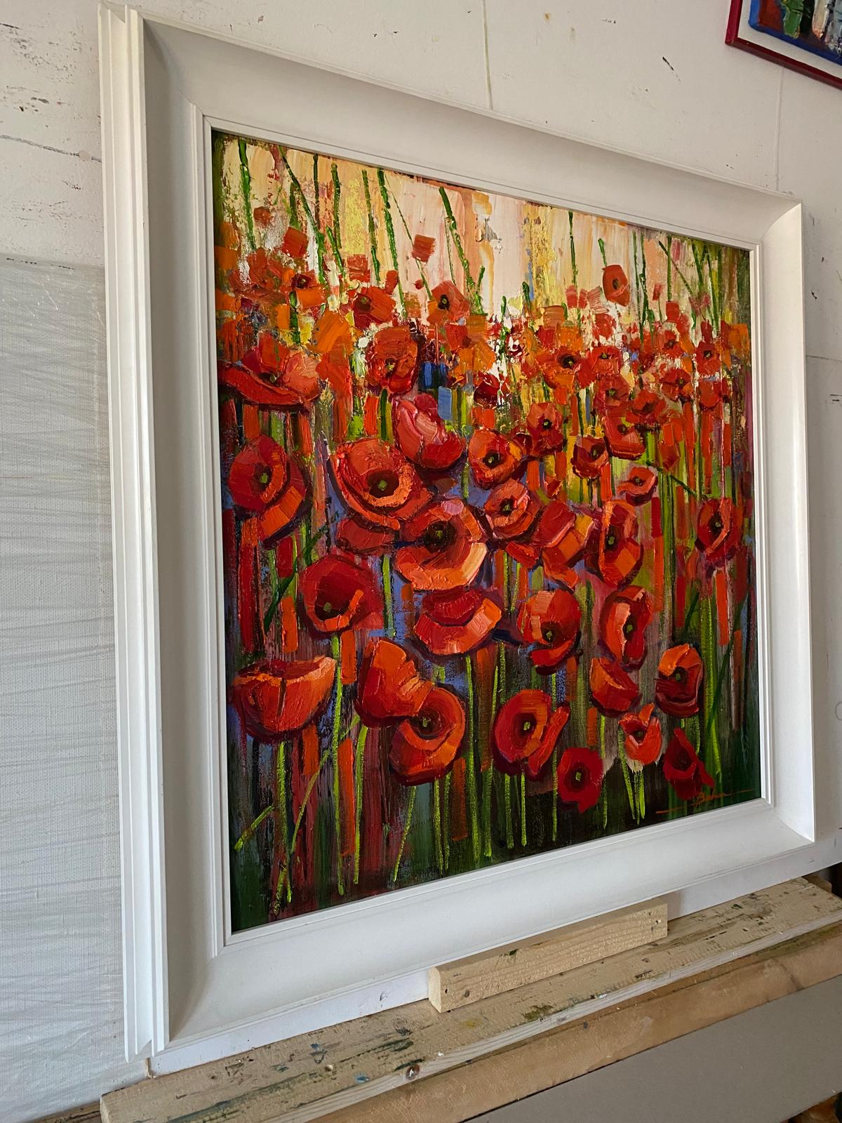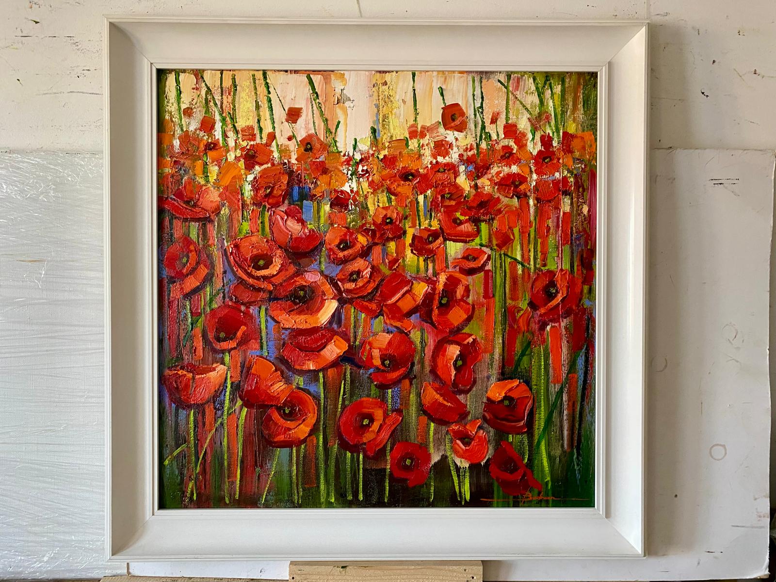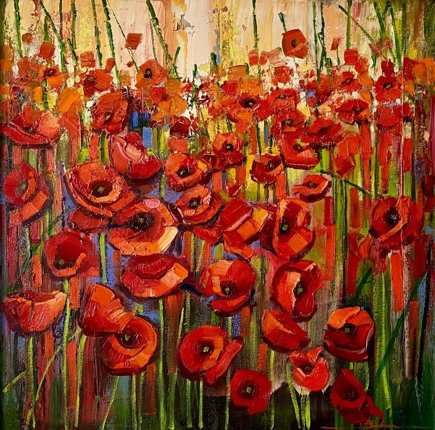 Obraz zobrazuje rozkvetlou louku plnou červených máků, které se vlní ve slabém vánečku. V pozadí září zapadající slunce, jeho teplé paprsky osvětlují květy a vrhají jemné zlatavé odlesky na okolní trávu. Louka působí živě a malebně, barvy květin kontrastují s tlumeným zeleným pozadím a scéna vyzařuje klid a radost z přírody.