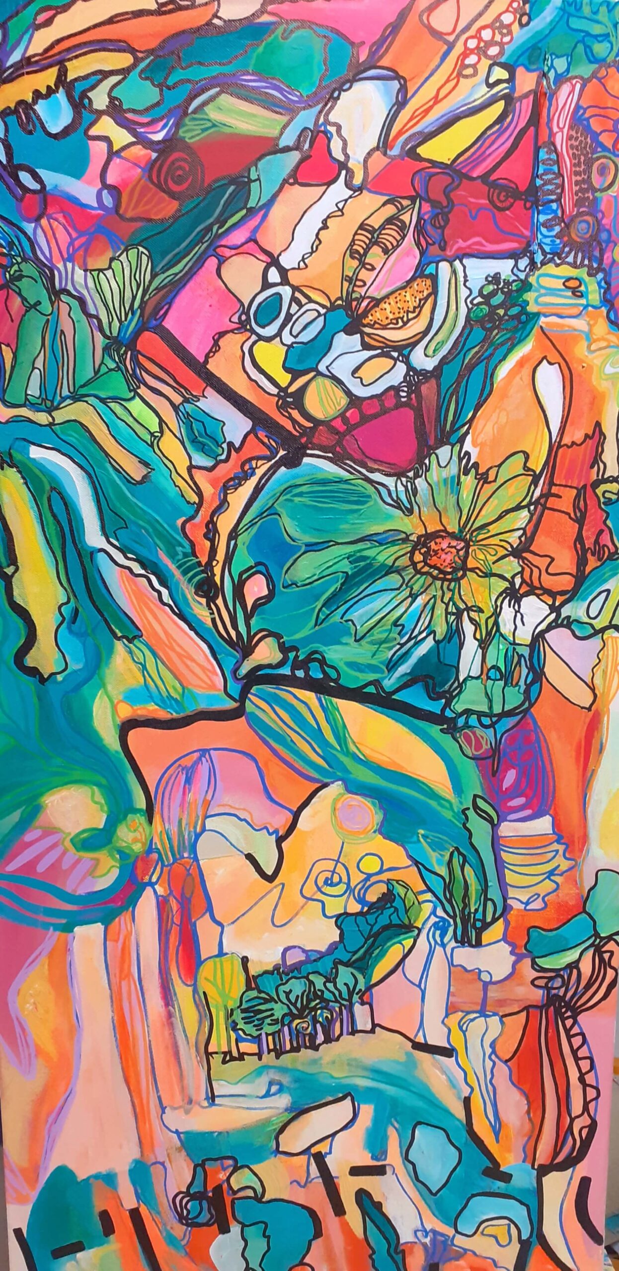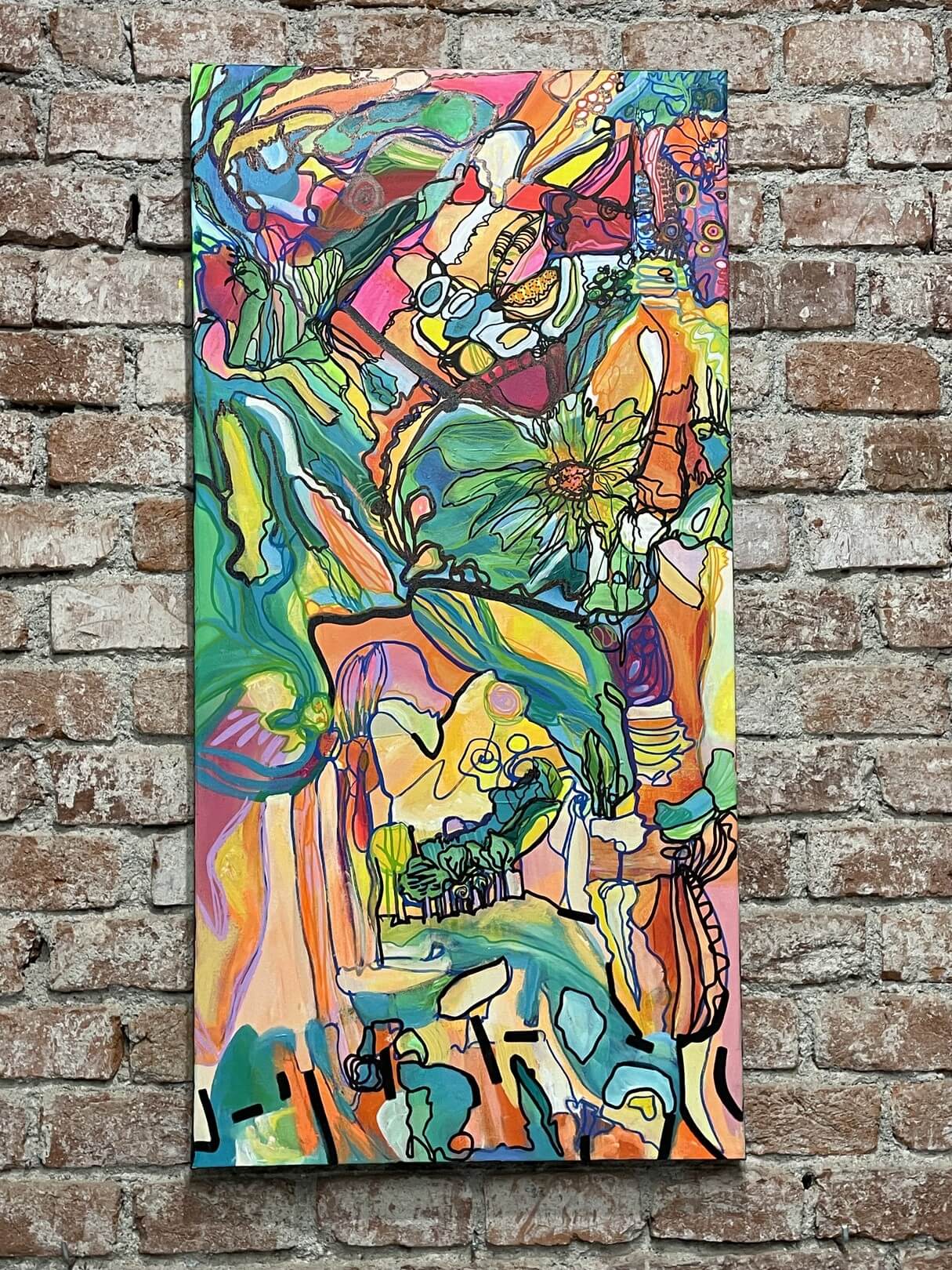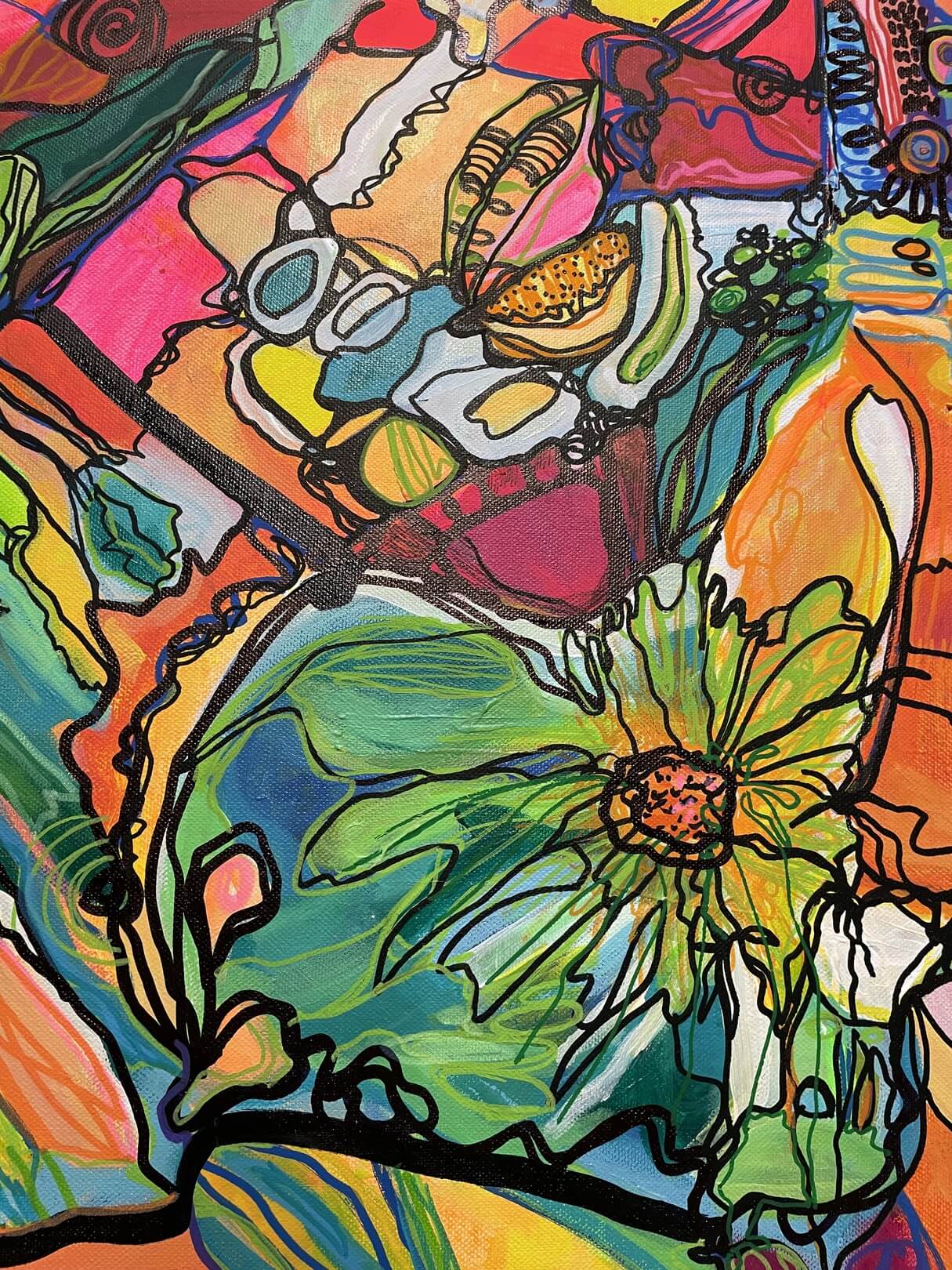 Toto živé dílo je explozí barev a forem, odvážně proplétající abstraktní tvary s prvky přírody. V jádru kompozice se střetávají výrazné modré a zářivé oranžové tóny, vyvolávající pocit současného chaosu i harmonie. Květinový motiv, zobrazující velký květ s detailně propracovanými okvětními lístky, je ústřední, vyzařuje ven a dává dílu pocit organického pohybu. Silné černé obrysy energicky sledují kontury různých tvarů a vedou oko diváka spletí složitých vzorů. Tyto obrysy vytvářejí ostrý kontrast s jasnou paletou, účinně rámují části vířících barev a dodávají kompozici hloubku. Roztroušené po celém díle jsou prvky naznačující hravou narativní složku (možná malá stvoření nebo abstraktní objekty), které vybízejí diváka k osobnějšímu a imaginativnímu zapojení. Vrstvení barev a forem dodává texturální rozměr, díky čemuž působí dílo živě, téměř trojrozměrně.