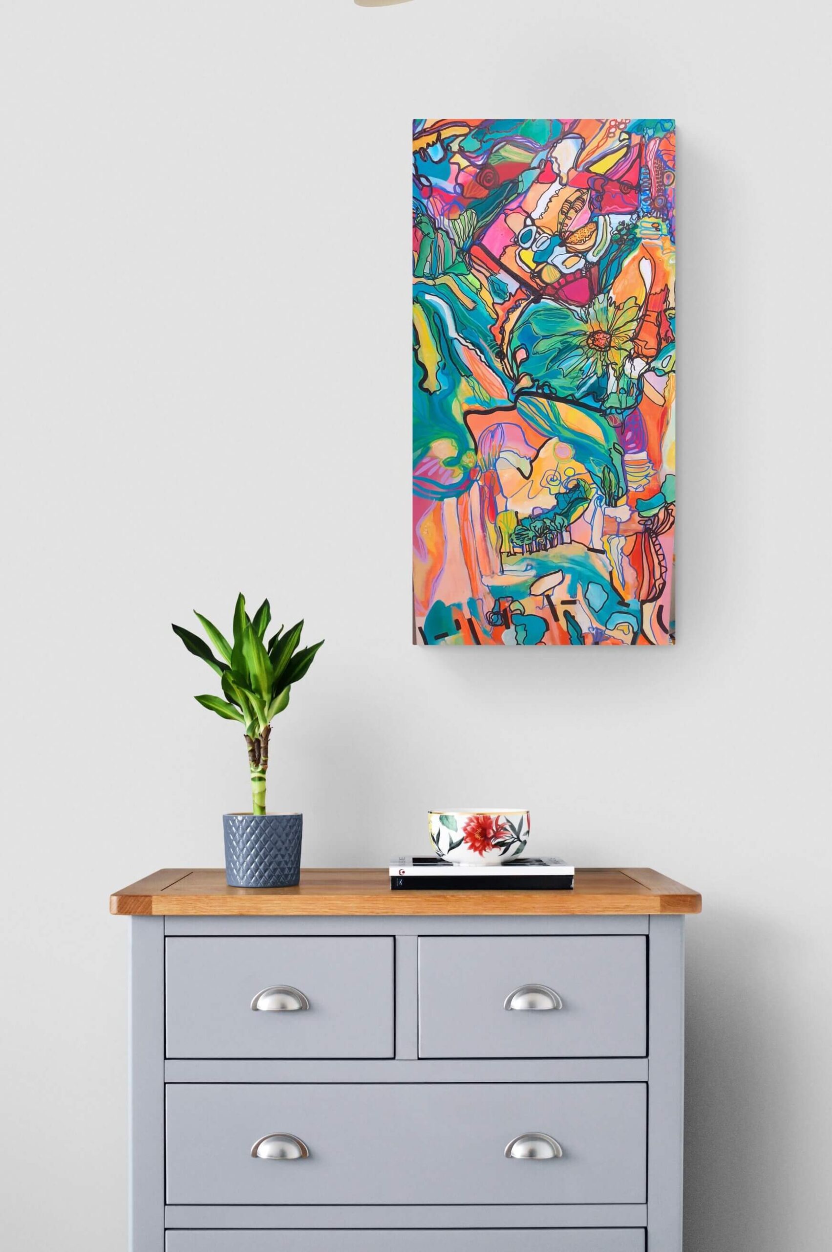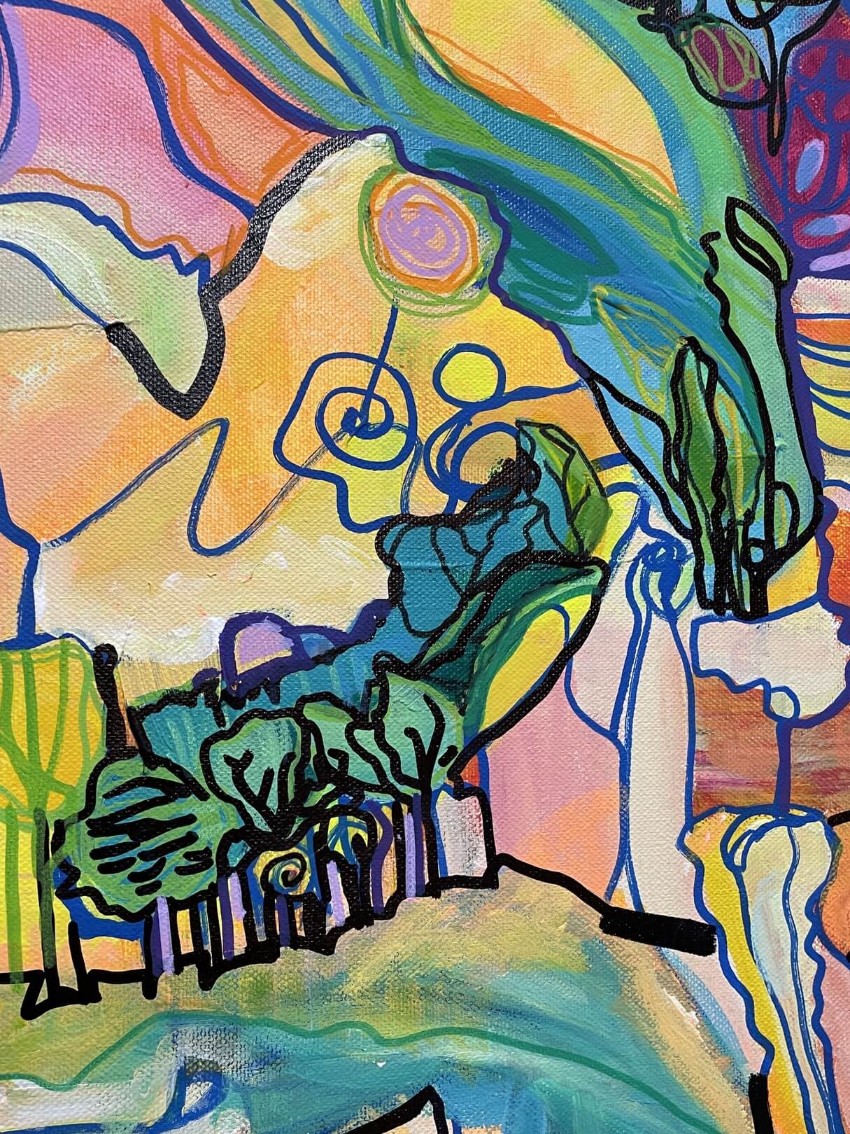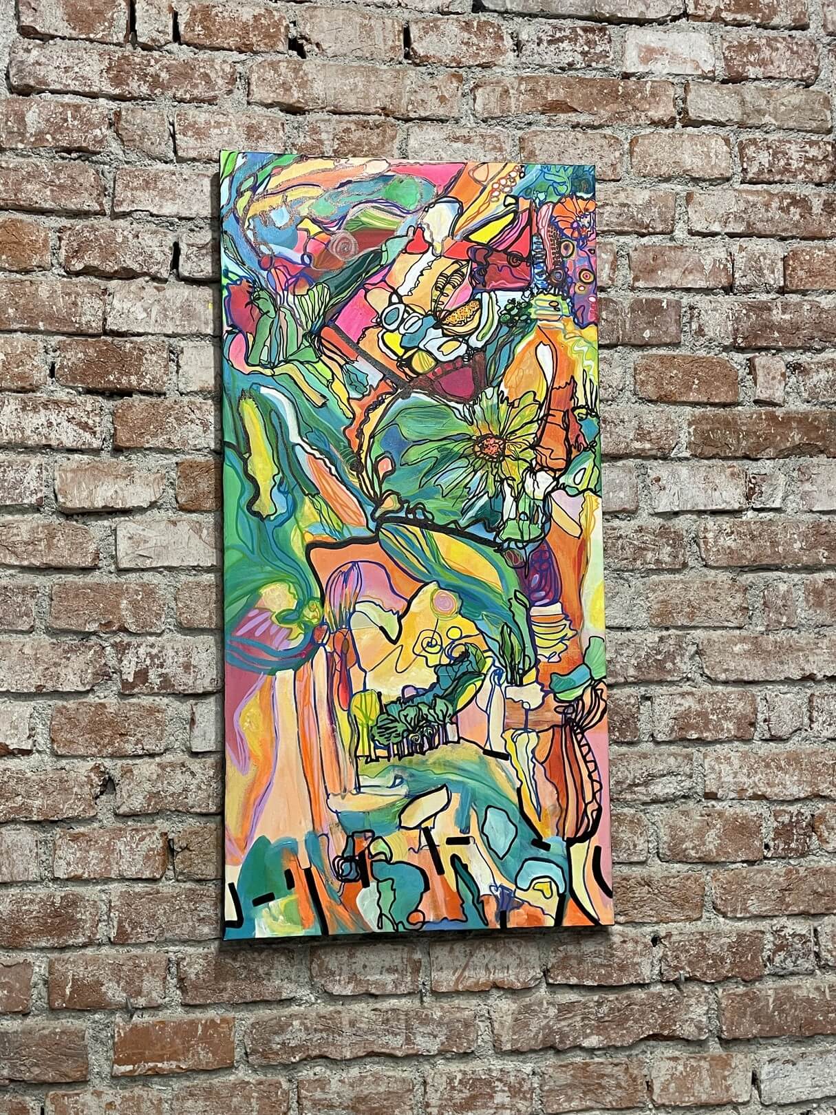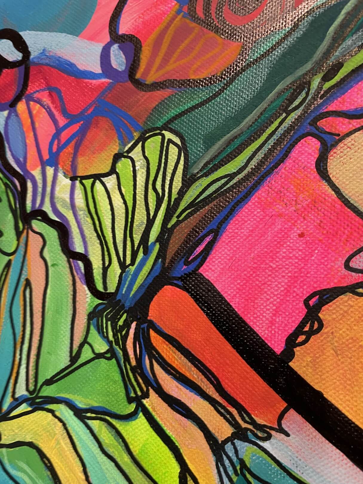 Toto živé dílo je explozí barev a forem, odvážně proplétající abstraktní tvary s prvky přírody. V jádru kompozice se střetávají výrazné modré a zářivé oranžové tóny, vyvolávající pocit současného chaosu i harmonie. Květinový motiv, zobrazující velký květ s detailně propracovanými okvětními lístky, je ústřední, vyzařuje ven a dává dílu pocit organického pohybu. Silné černé obrysy energicky sledují kontury různých tvarů a vedou oko diváka spletí složitých vzorů. Tyto obrysy vytvářejí ostrý kontrast s jasnou paletou, účinně rámují části vířících barev a dodávají kompozici hloubku. Roztroušené po celém díle jsou prvky naznačující hravou narativní složku (možná malá stvoření nebo abstraktní objekty), které vybízejí diváka k osobnějšímu a imaginativnímu zapojení. Vrstvení barev a forem dodává texturální rozměr, díky čemuž působí dílo živě, téměř trojrozměrně.
