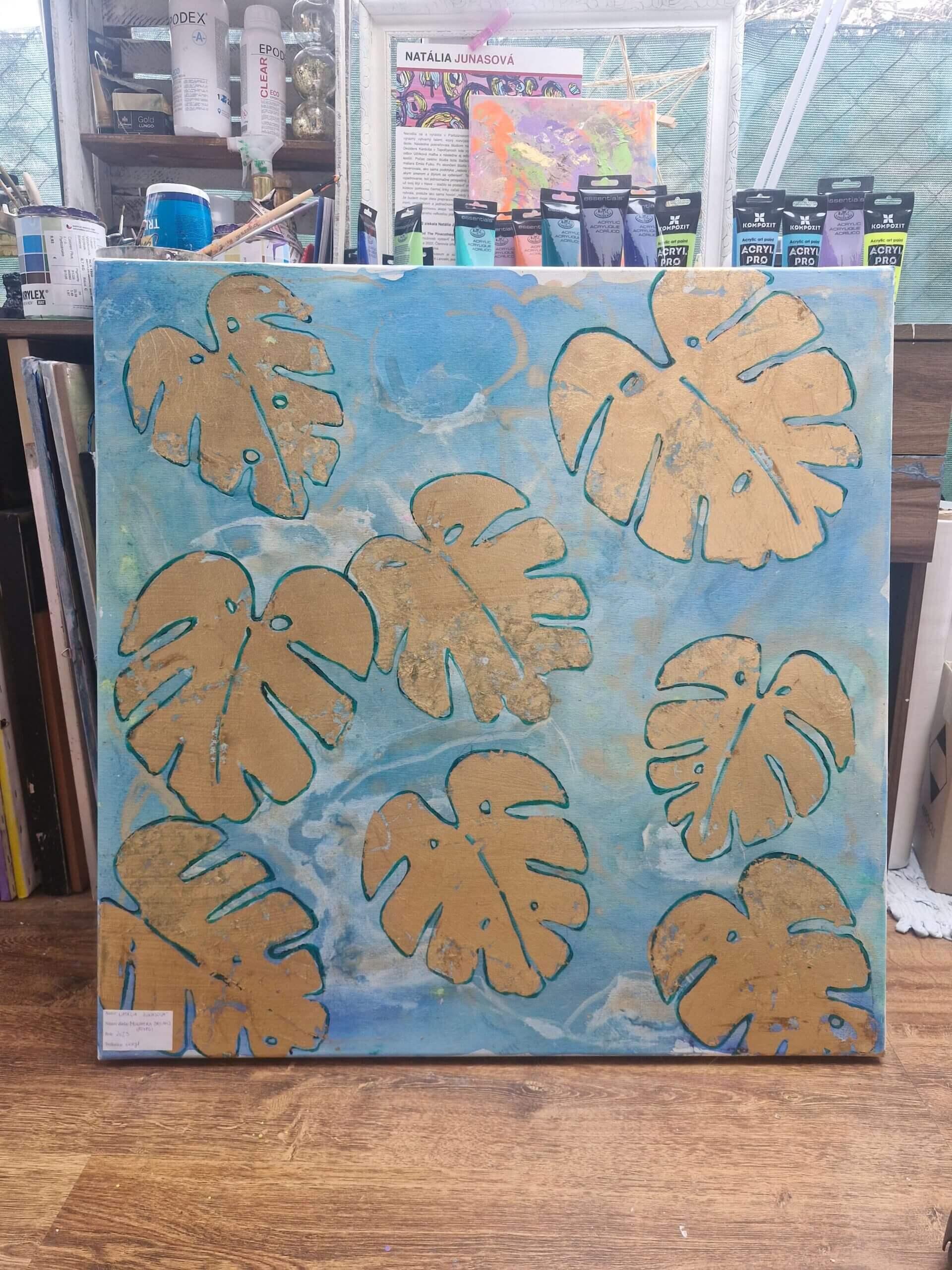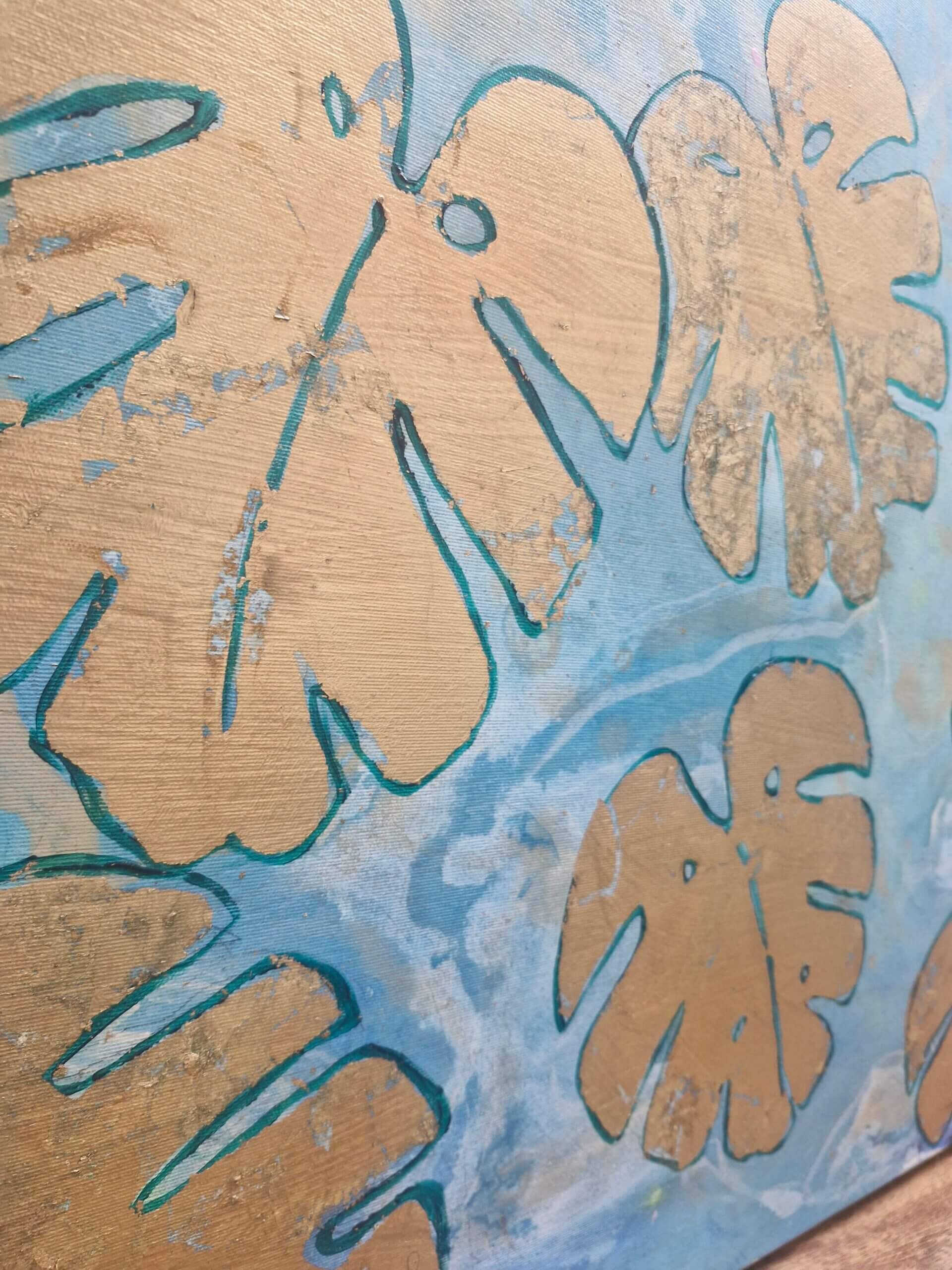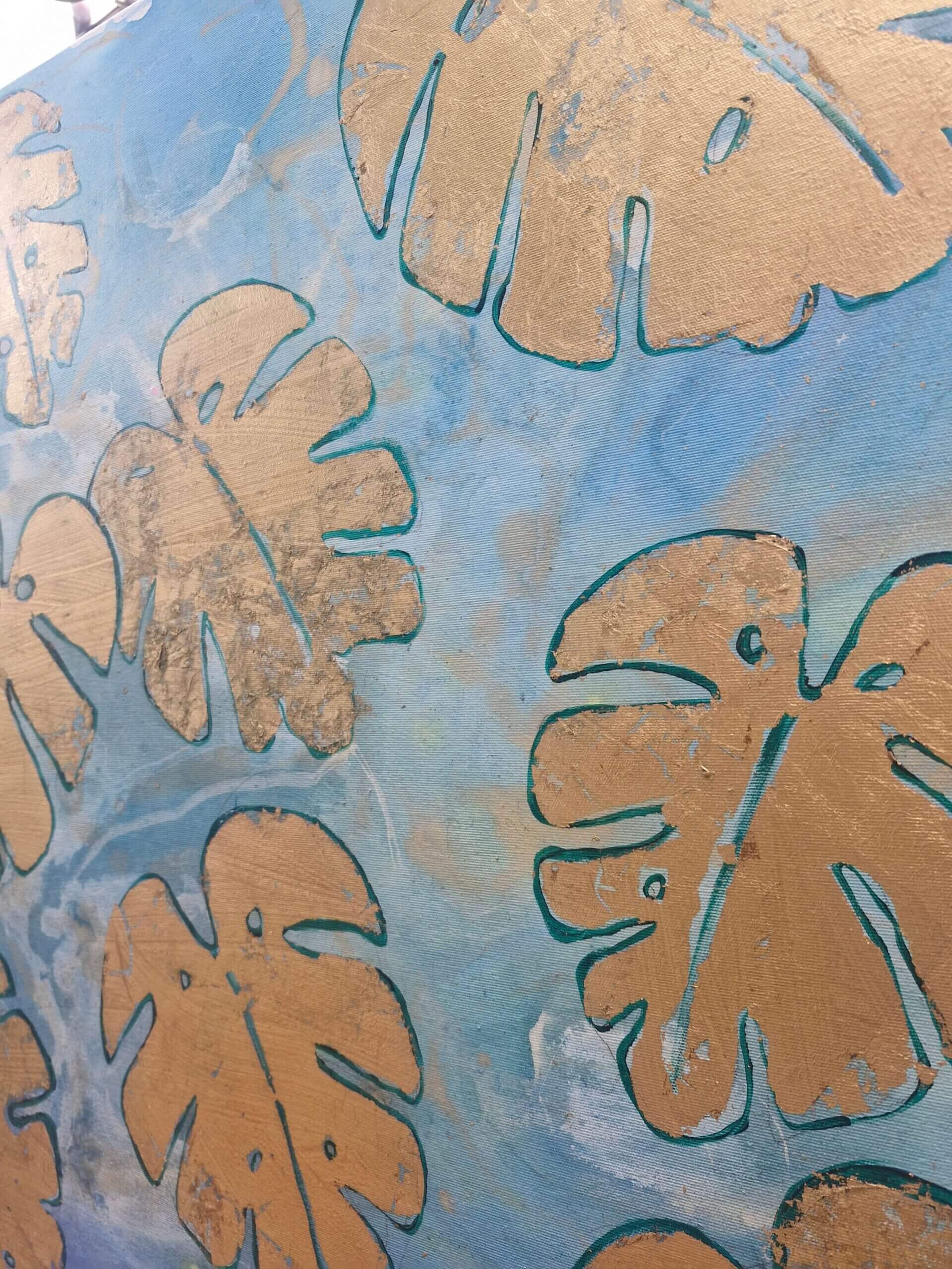 Elegantní umělecký kousek s vyobrazenými listy Monstery na jemném tyrkysovém pozadí. Každý list je zvýrazněn ručně aplikovaným plátkovým zlatem, které dodává obrazu luxusní a moderní vzhled. Kombinace syté barvy a zlatých akcentů vytváří jedinečný kontrast a působí jako originální doplněk do interiéru.