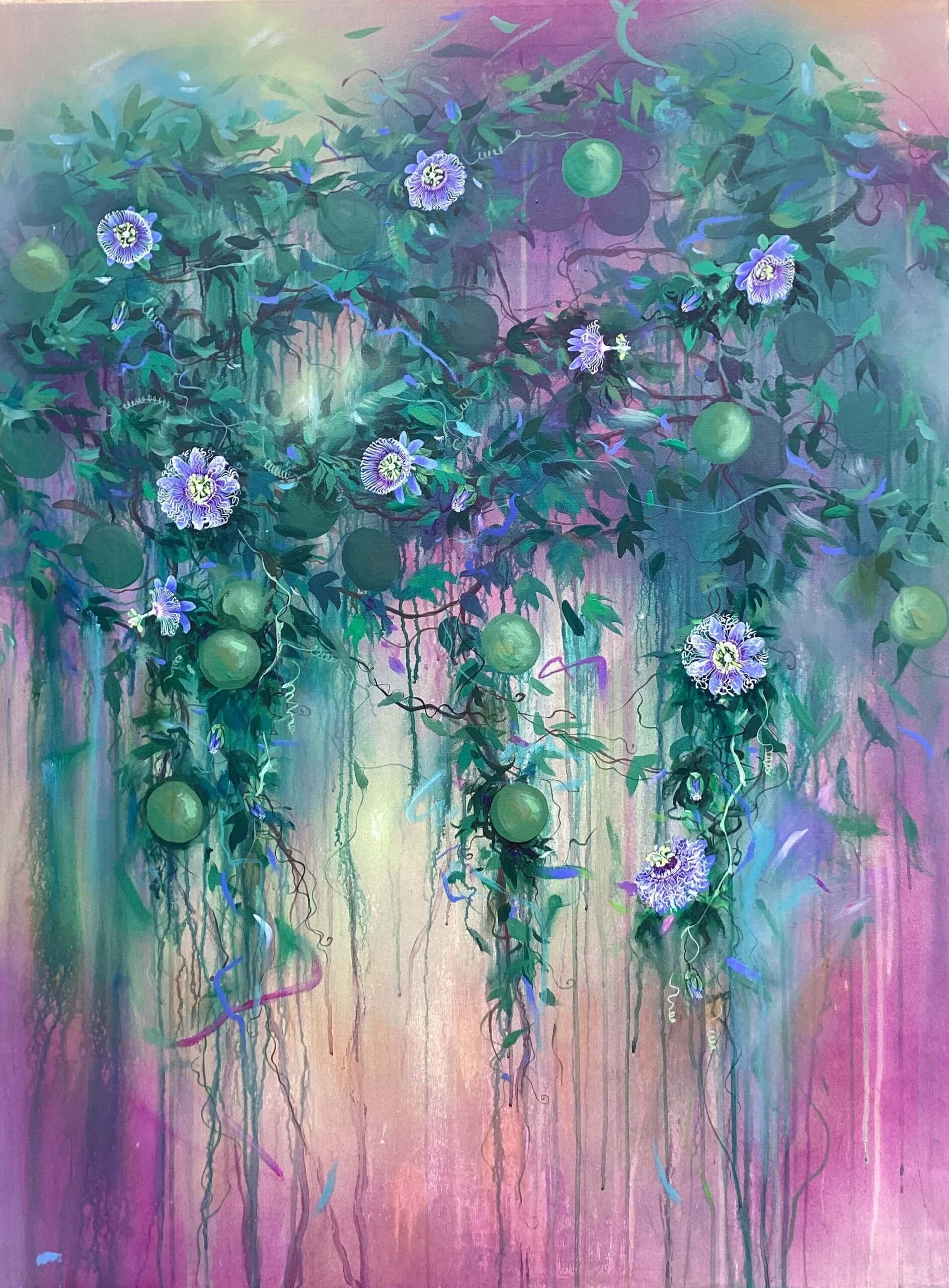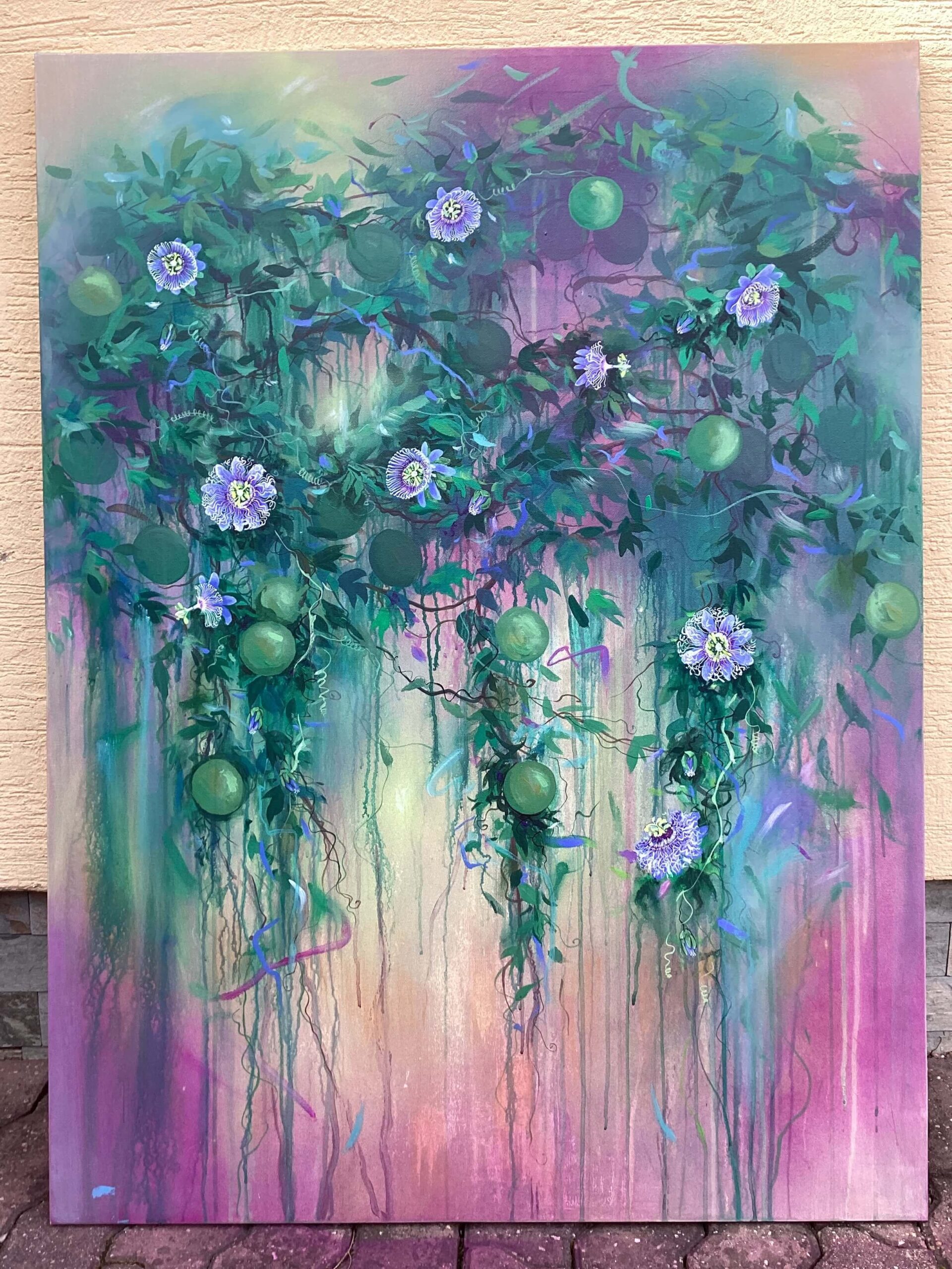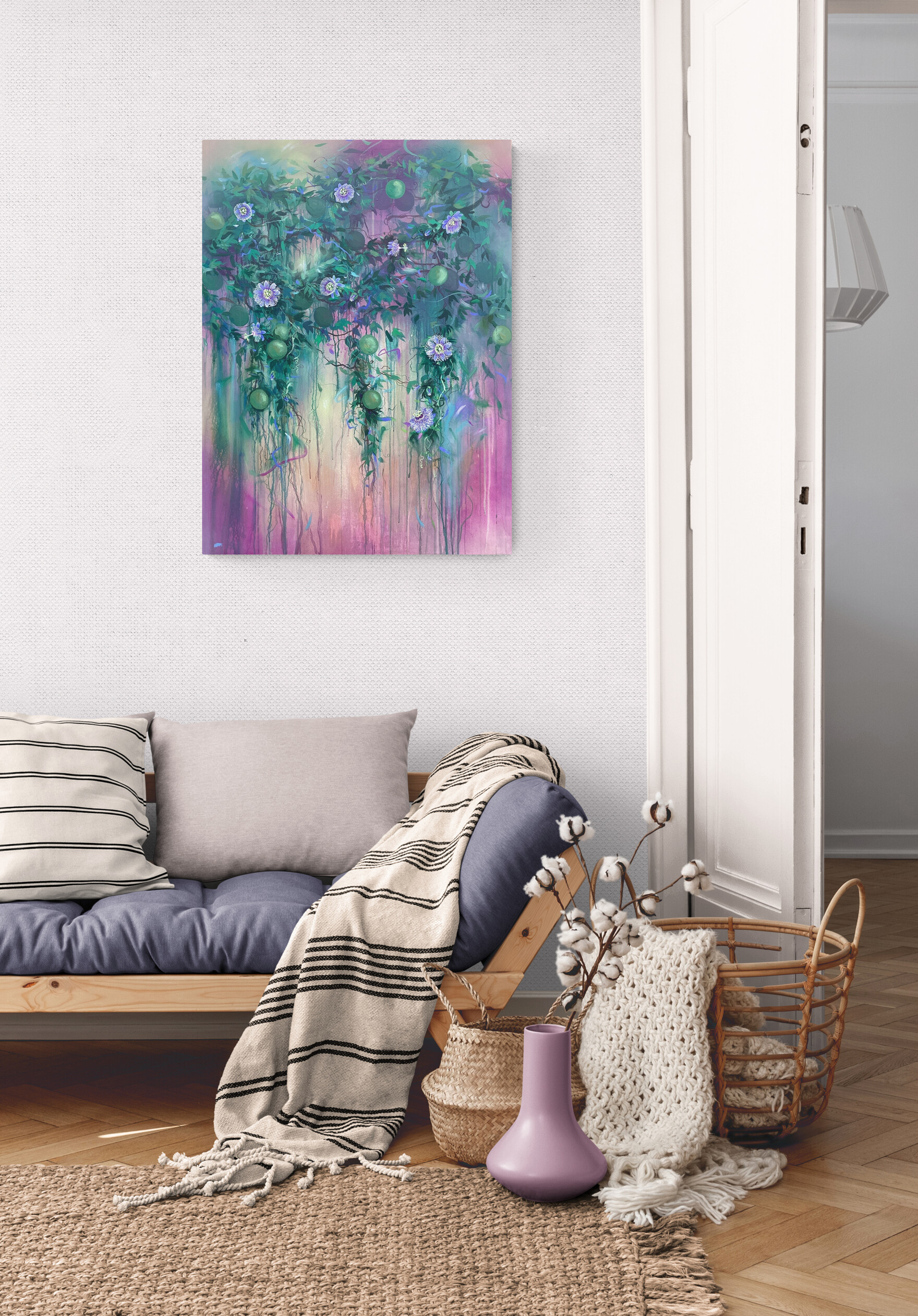 Obraz zachycuje krásu a jedinečný charakter tropické mučenky v její plné kráse. Kombinace zářivých barev, bohatých textur a detailních květů vnáší do prostoru energii, svěžest a exotickou atmosféru.