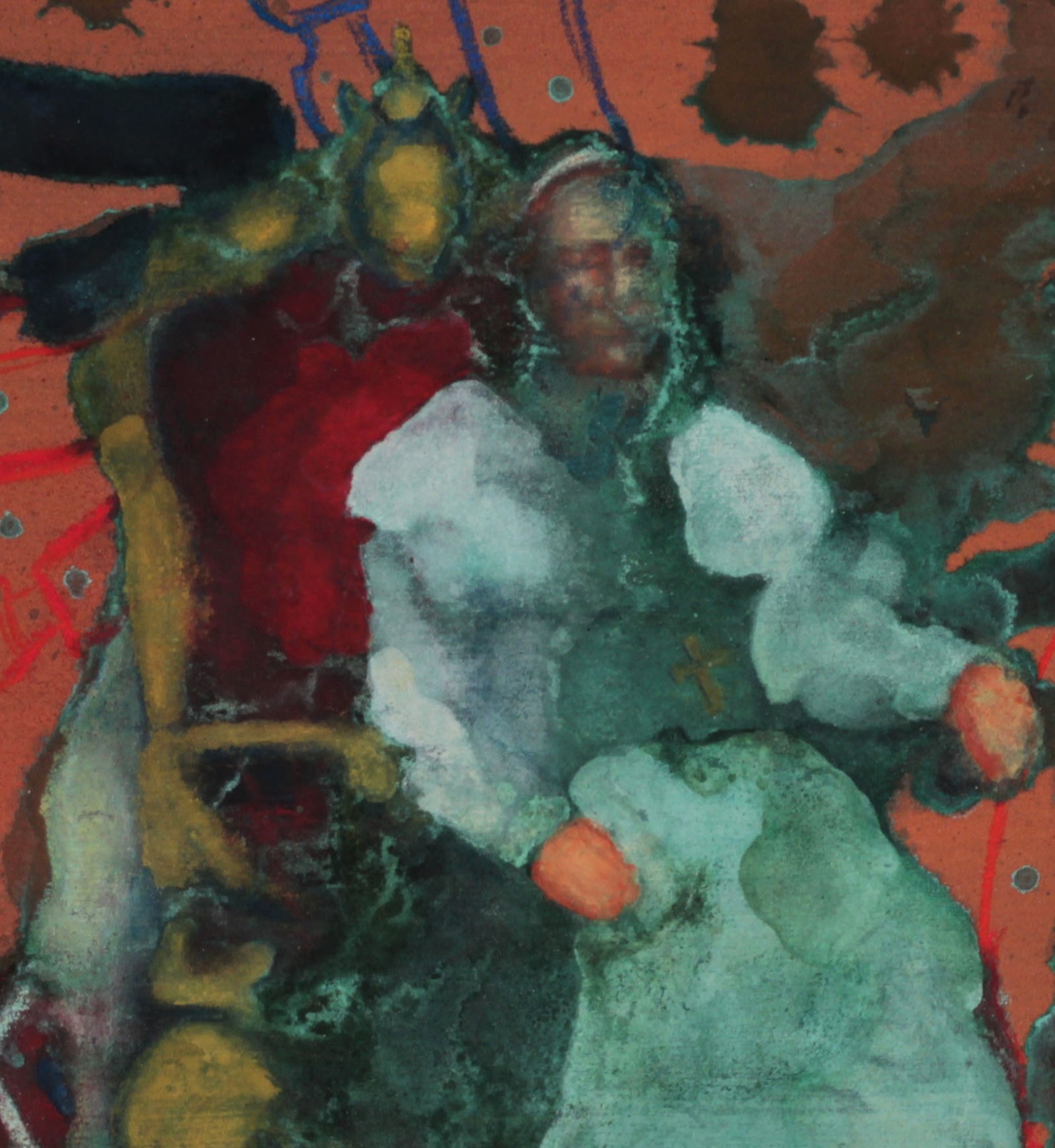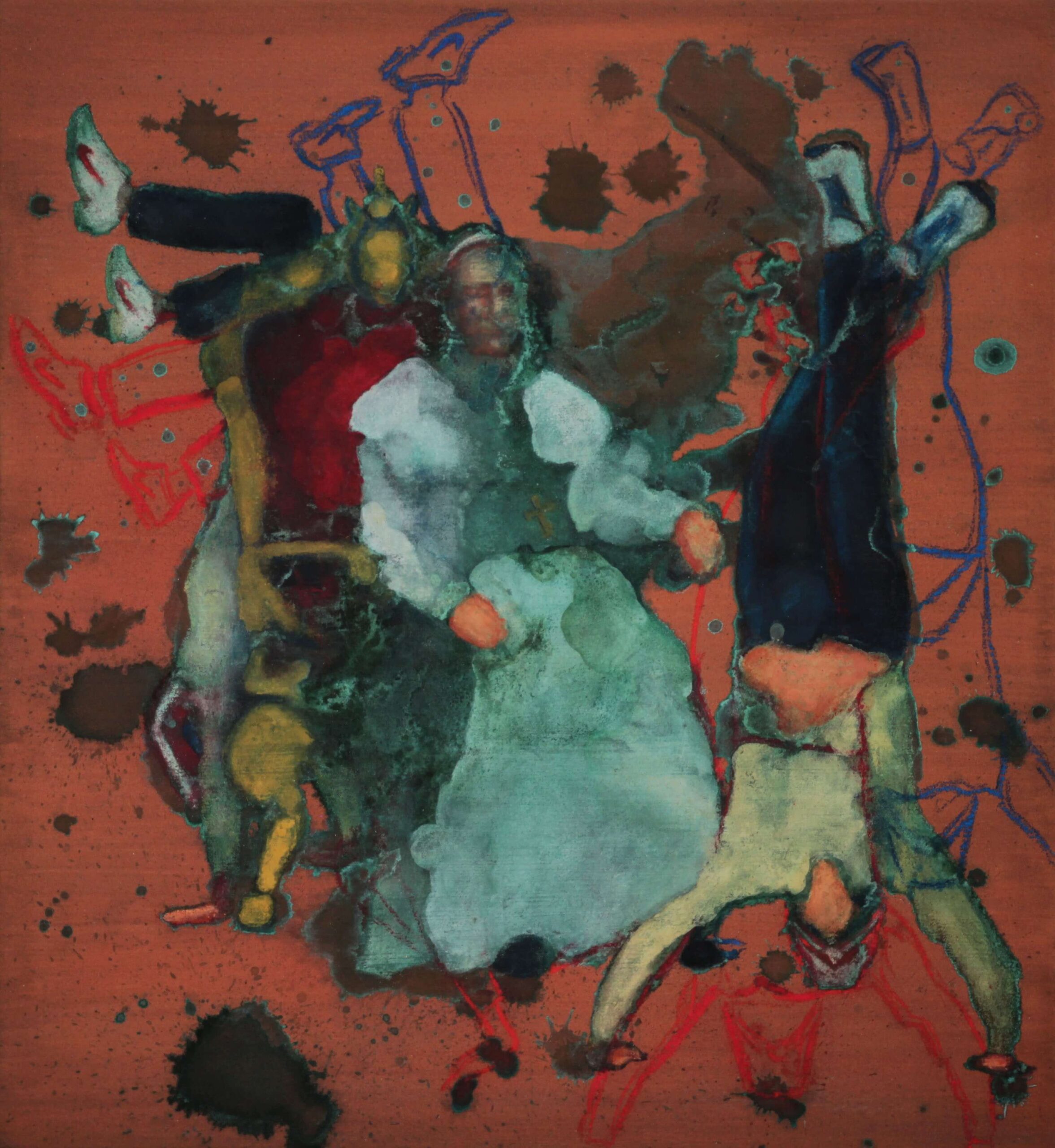 Dílo zobrazuje papeže sedícího na trůnu. Kolem něj stojí postavy na rukou. Papež působí jako stabilní a trvalý prvek kompozice. Postavy kolem něj vytvářejí dojem rovnováhy a křehkosti. Kontrast mezi nimi a jeho autoritou dodává obrazu dynamiku a napětí.