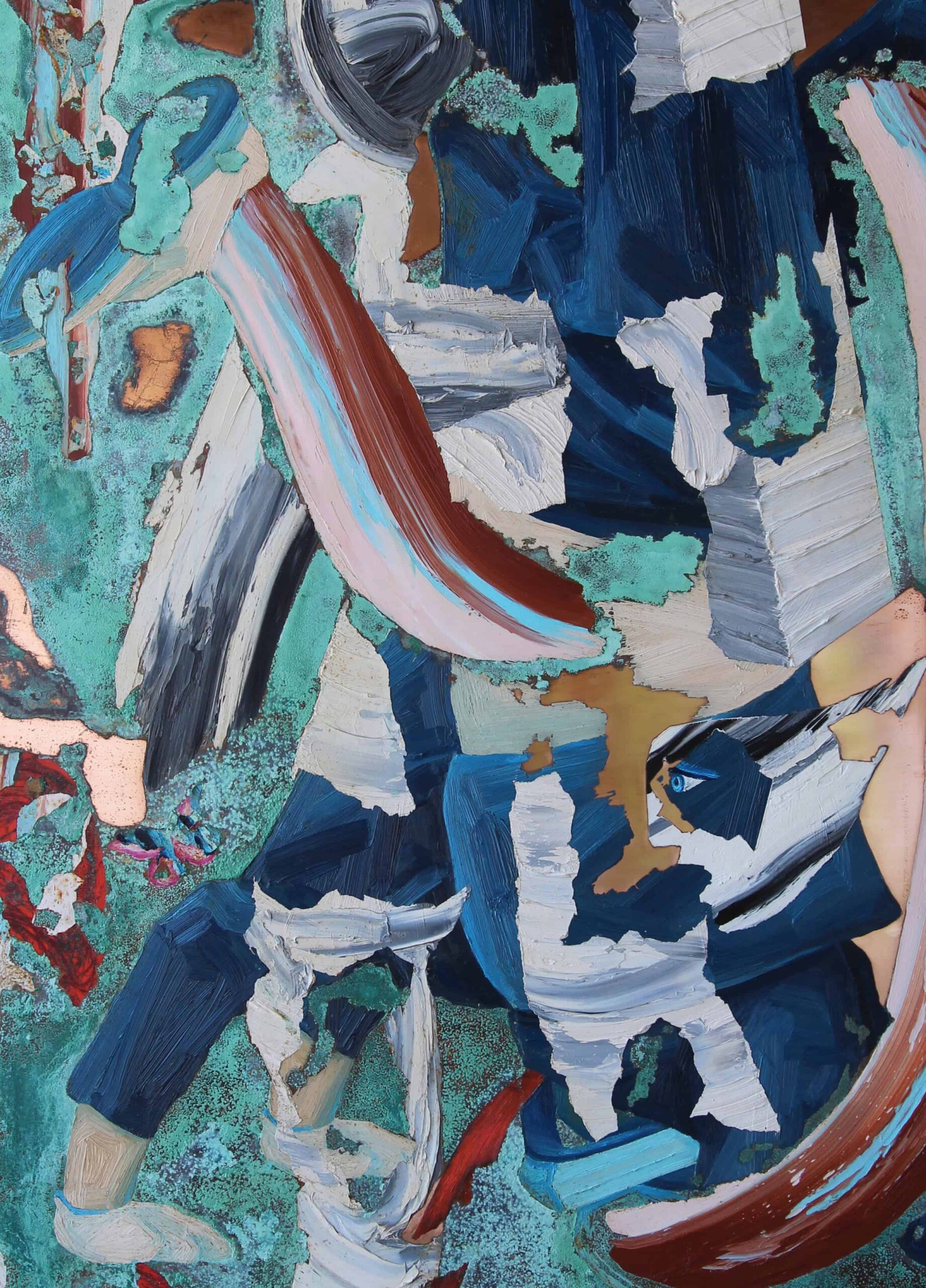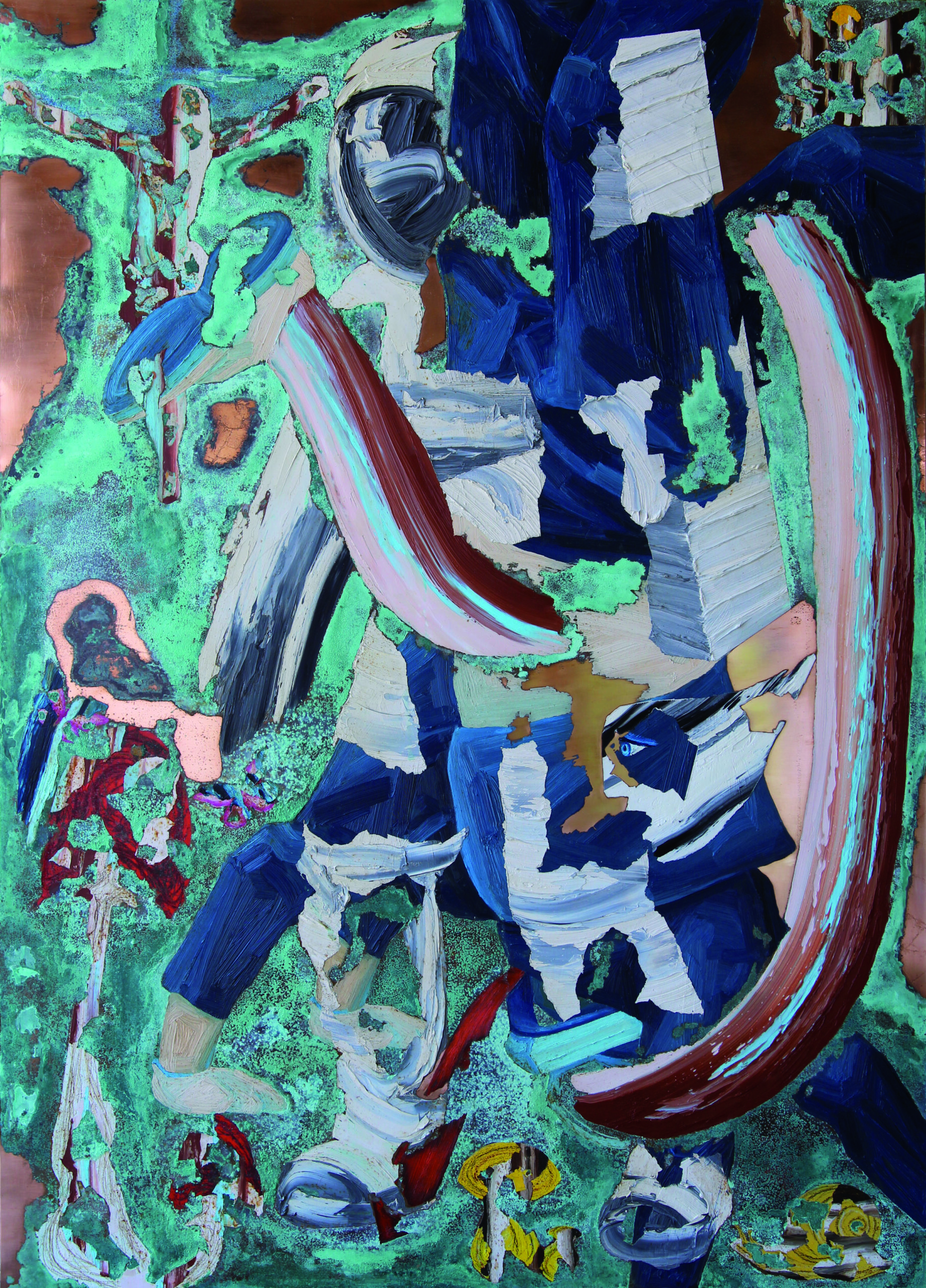 Výsledkem je dílo, které nese stopy záměrné destrukce, přeměny a samovolného vývoje, čímž se stává živým artefaktem. Stejně nevyzpytatelným jako samotná doba, kterou reflektuje. Povrch měděné desky je narušen a přeměněn chemickým zásahem, přesto zároveň zafixován do podoby malby, která se vzpírá tradiční interpretaci.