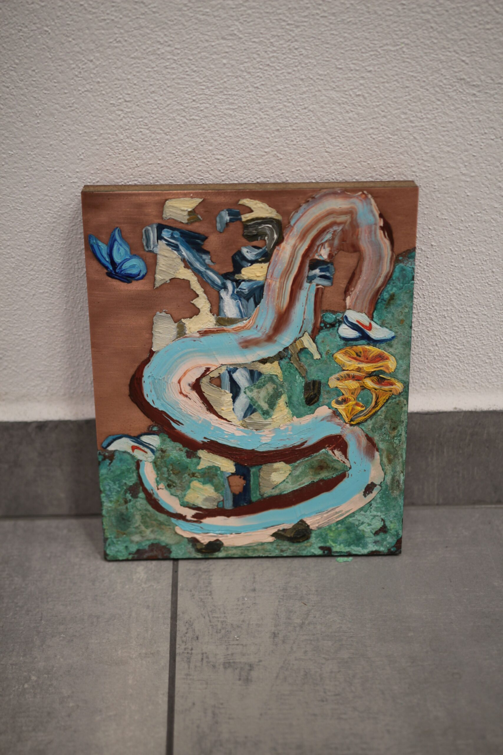 Vnitřní konflikt mezi silou a jemností, mezi vnitřními pohnutkami a vnějšími očekáváními. Autor používá kombinovanou techniku oleje a akrylu na měděné desce, která umožňuje vytvořit bohatou texturu a hluboké barevné vrstvy. Husté barvy a vrstvené plochy vytvářejí vizuální rytmus, který působí energicky i meditativně zároveň. Kompozice si hraje s kontrasty světla a stínu, což umocňuje pocit napětí a dynamiky mezi protiklady. Dílo zve diváka k osobnímu čtení a hledání vlastních interpretací, čímž se stává významným estetickým i konceptuálním zážitkem.