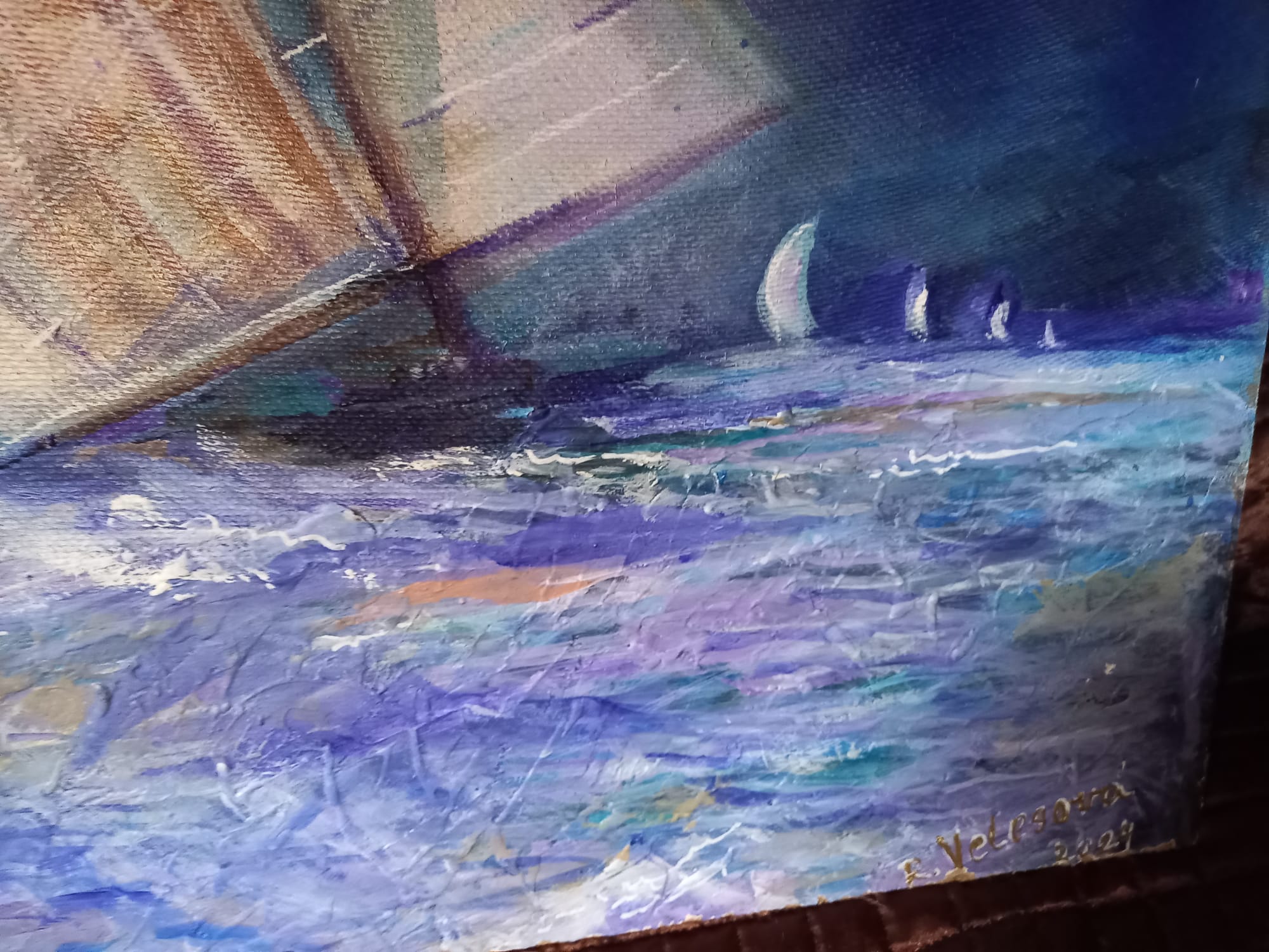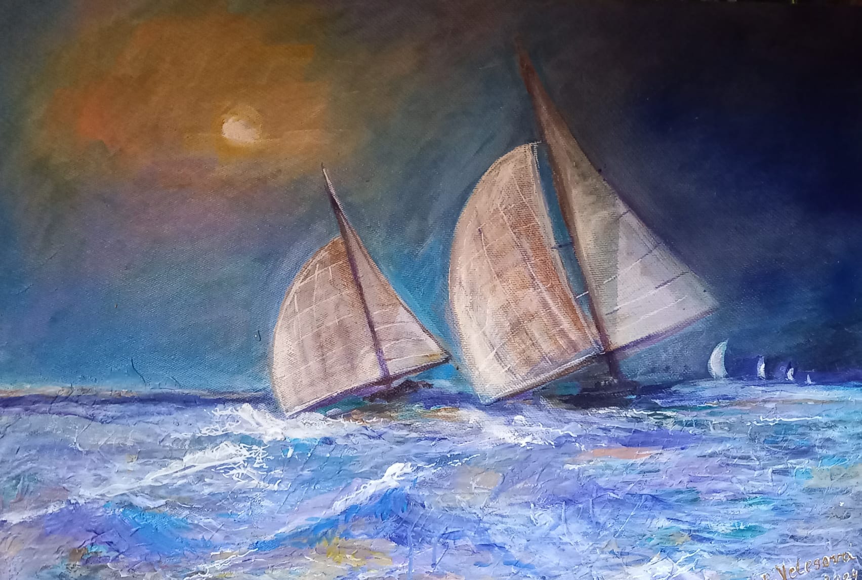Plachetnice tiše kloužou po hladině, jako by nesly sny ukryté v plachtách napnutých větrem. Moře se pod nimi jemně vlní a odráží světlo, které se mění každým okamžikem. V dálce se horizont ztrácí v nekonečnu a otevírá prostor pro představy i touhy.