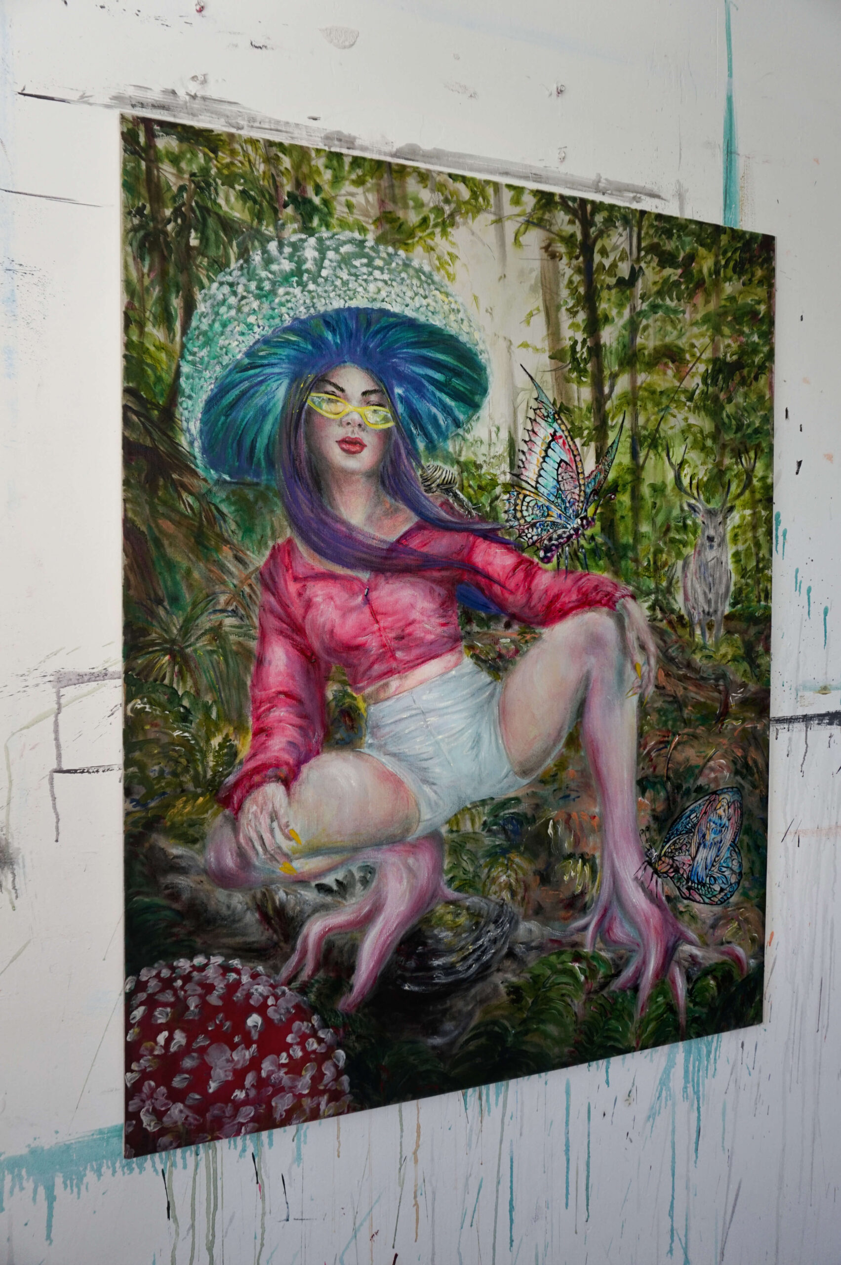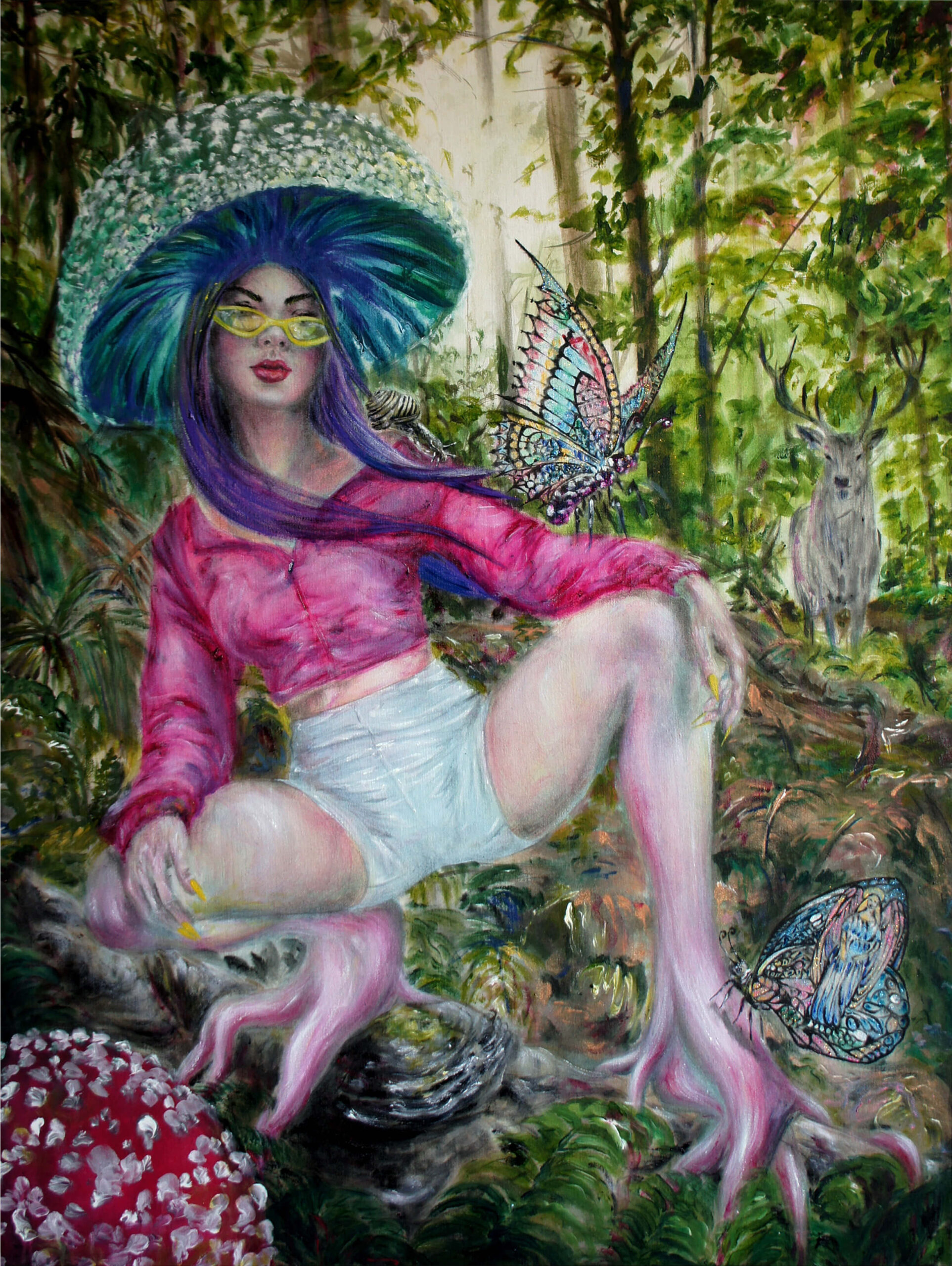 Obraz „Po dešti“ zobrazuje ženu sedící v přírodním prostředí okamžik po přeháňce. Vzduch je svěží a čistý, listy a tráva se lesknou pod kapkami vody, které odrážejí světlo a vytvářejí dojímavou a klidnou atmosféru. Žena má na sobě jemně růžovou bundu, bílé šortky a na hlavě modrý klobouk. Umělkyně klade důraz na každý detail (mokrou trávu, jemné odlesky světla na kapkách, listy a barevné přechody. Každý prvek podporuje pocit očisty, klidu a regenerace po dešti).