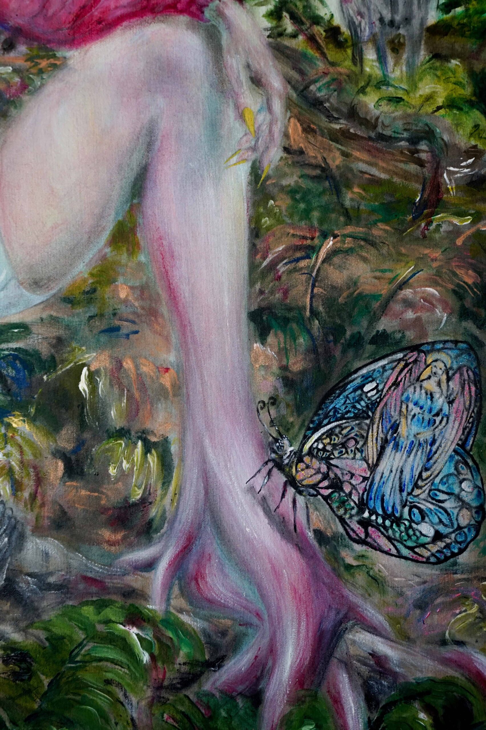 Kompozice spojuje lidskou postavu s přírodou, čímž vzniká dojem harmonie a rovnováhy. Jemné pastelové barvy, přirozené přechody světla a stínu a organické tvary dodávají obrazu meditativní a introspektivní atmosféru. Pohled ženy a její klidný výraz vyvolávají ticho, vnitřní soustředění a pocit bezpečí. Kapky deště symbolizují neustálou obnovu a životní regeneraci.