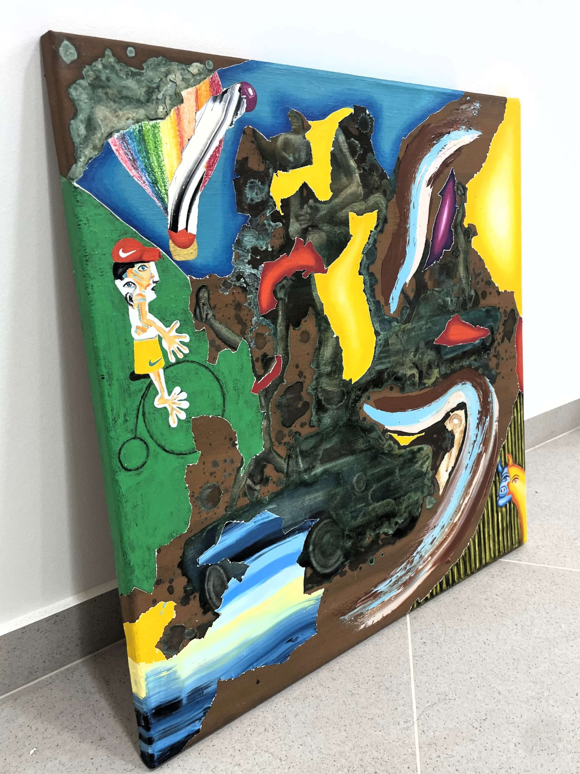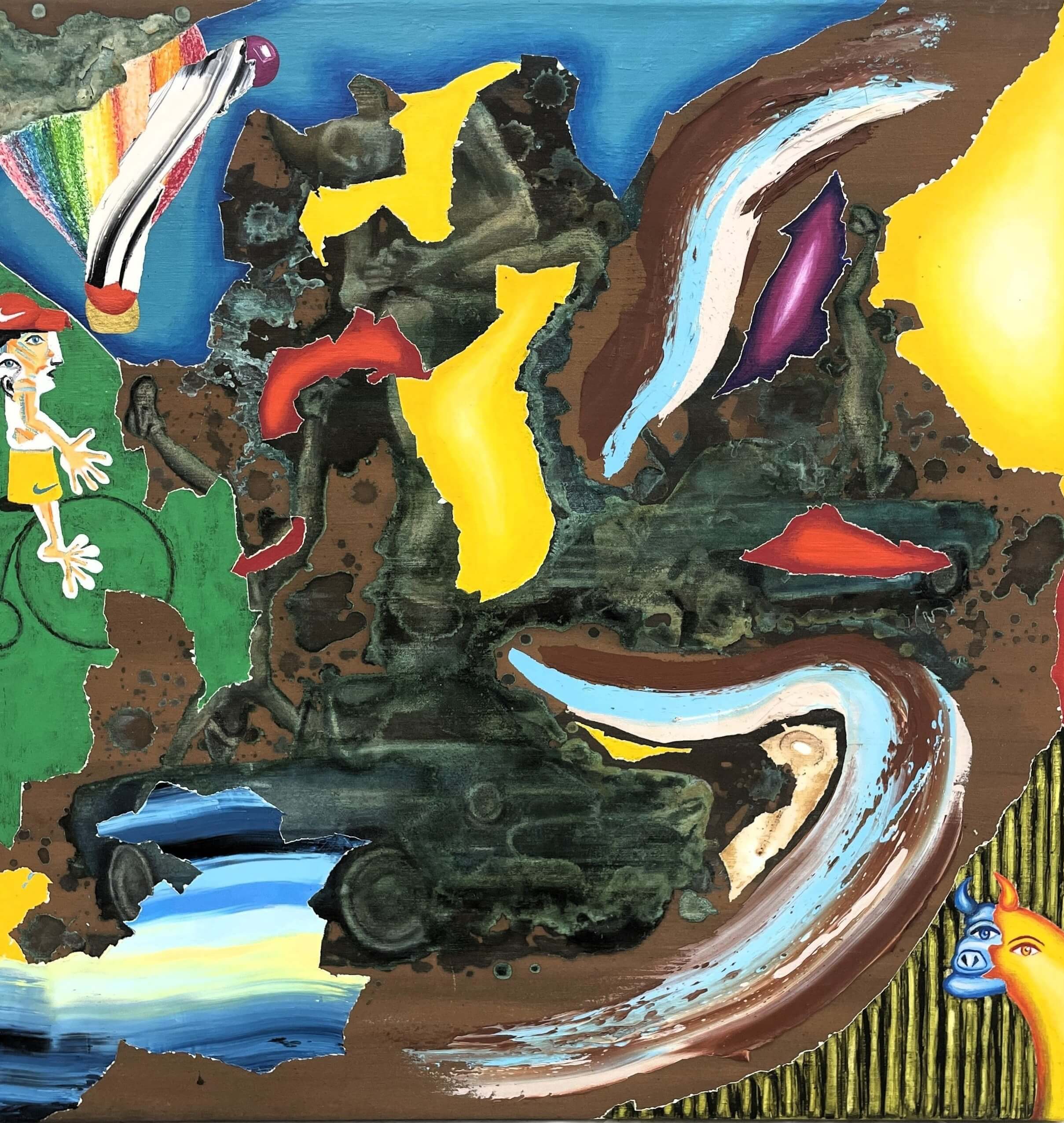 Výrazné surrealistické a abstraktní dílo na první pohled zaujme svou dynamickou kompozicí a pestrou barevností. Malíř zde pracuje s kontrasty mezi živými barvami a tmavšími plochami, čímž vytváří napětí i hloubku celého výjevu. Dominantními odstíny jsou sytě žlutá, hnědá, modrá a zelená, které se prolínají a vzájemně doplňují. Obraz působí jako exploze fantazie, v níž se mísí různé motivy a tvary připomínající přírodní útvary, lidské postavy či zvířecí siluety.
