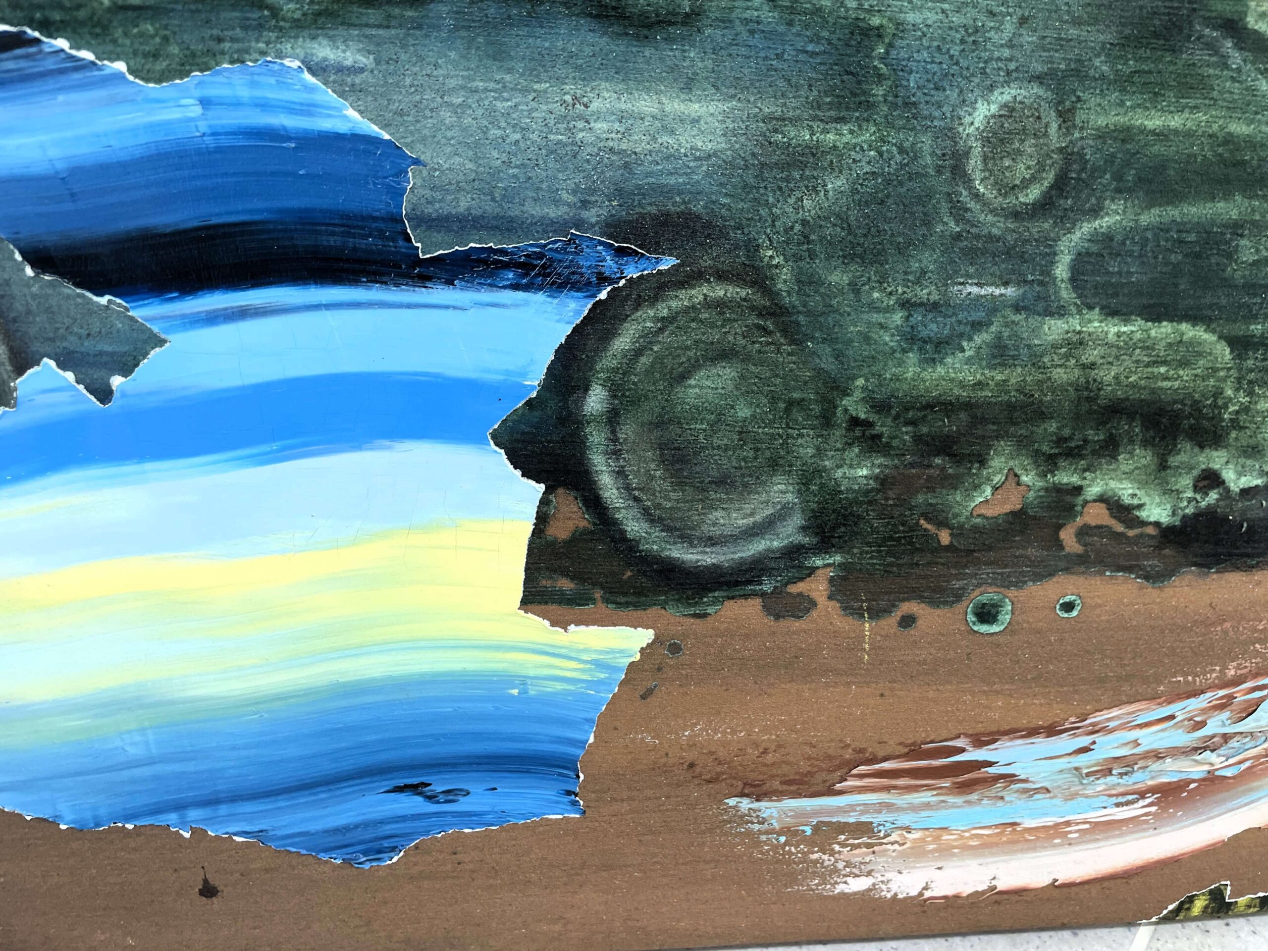 V pravé části obrazu se otevírá prostor pro interpretaci. Objevují se zde křivky připomínající proudy vody nebo větru, směřující k jasně žlutému kruhu evokujícímu slunce. V dolním rohu lze spatřit dvě stylizované hlavy s výraznými barvami, které mohou představovat kontrastní aspekty lidské psychiky nebo symbolické bytosti z autorovy imaginace.