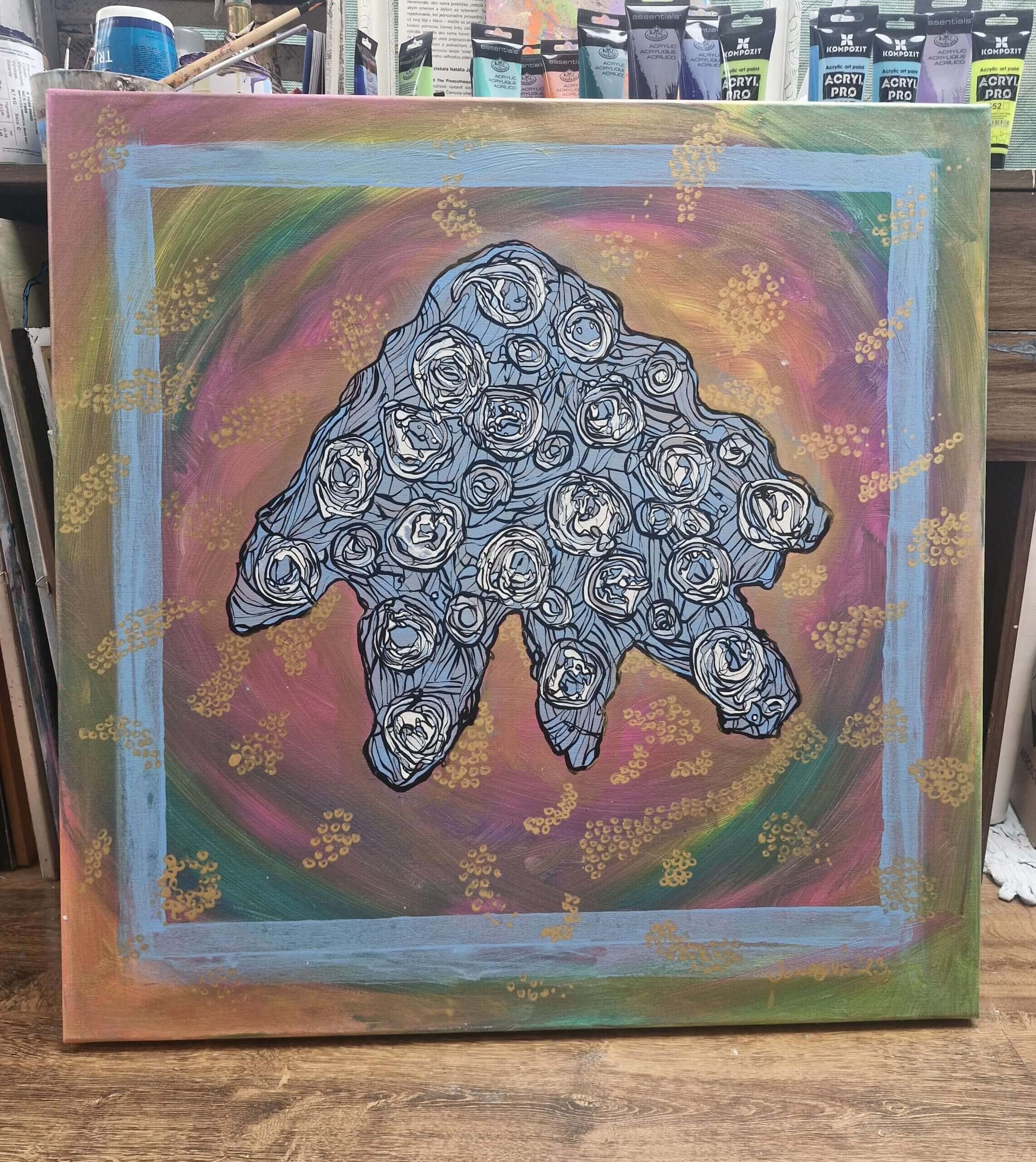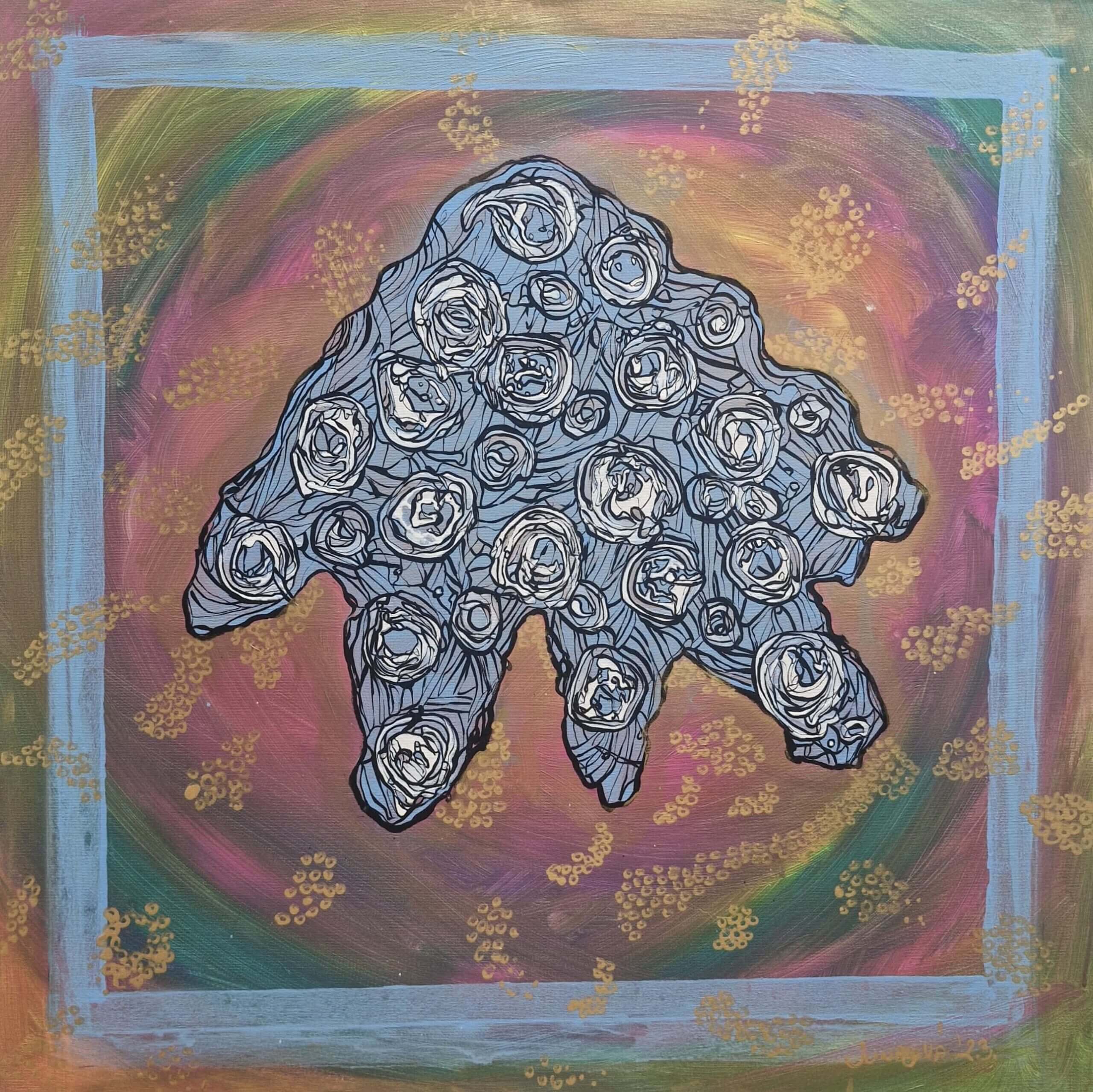 „Štěstí v buňce“ je oslavou radosti, energie a života, zachycenou v kompaktní, barevné kompozici. Každý odstín a tvar se stává částí mikrosvěta plného pohybu a harmonie, připomínající, že štěstí se často skrývá v malých, nenápadných detailech.