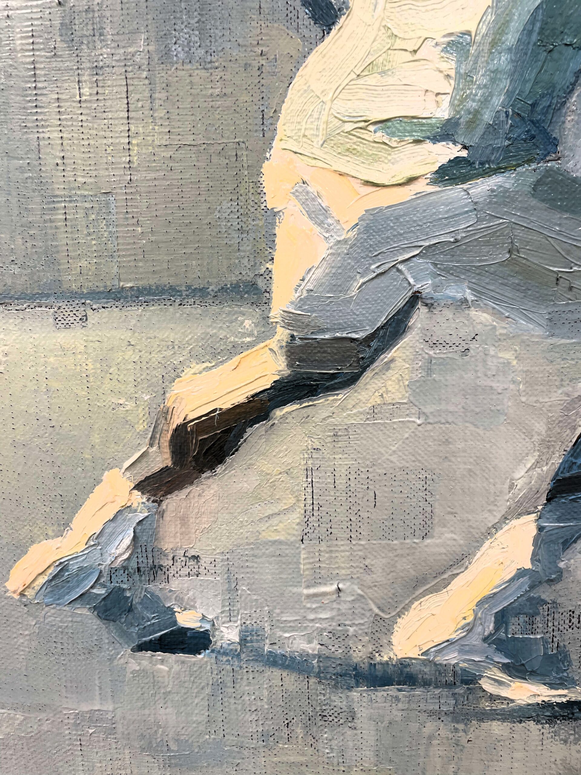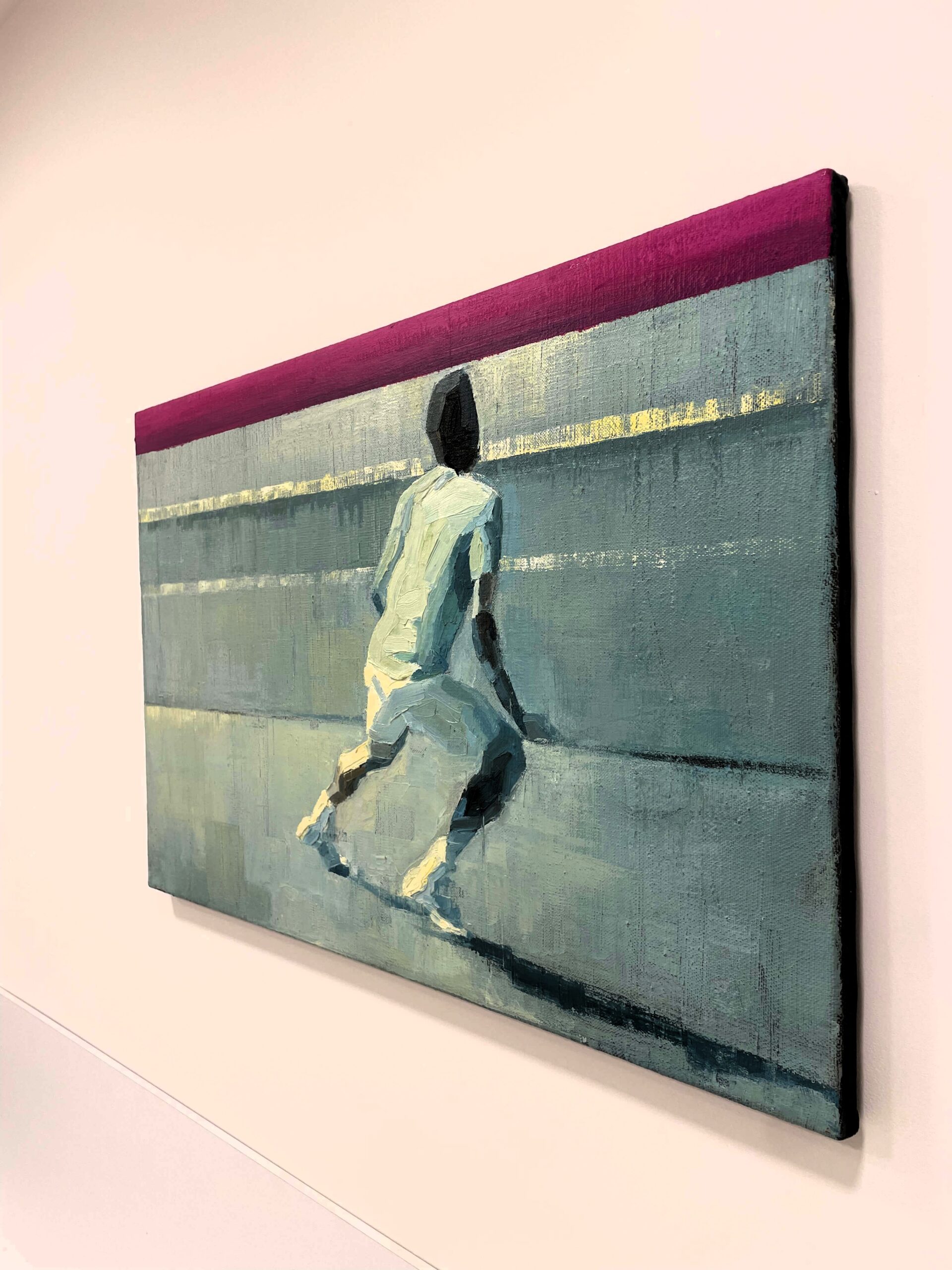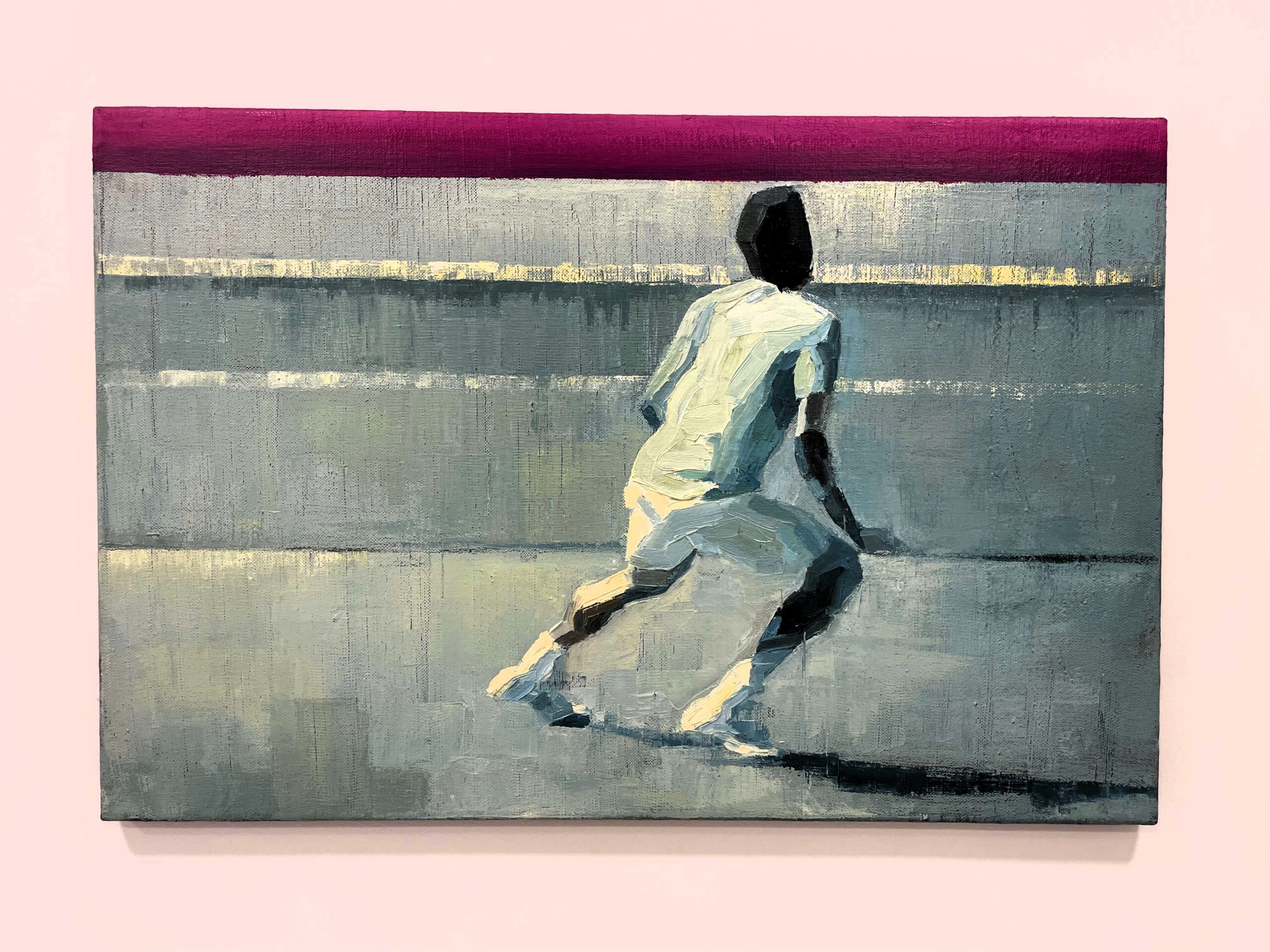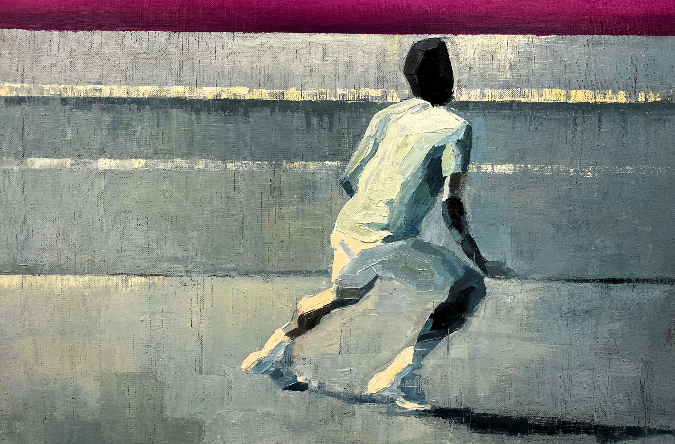 Tenista je zachytený v okamihu pripravenosti na úder loptičky. Je v strehu, sústredený a napätý, pripravený reagovať na každý pohyb loptičky. Jeho postoj a výraz vyjadrujú koncentráciu, energiu a odhodlanie, typické pre vrcholový športový výkon.