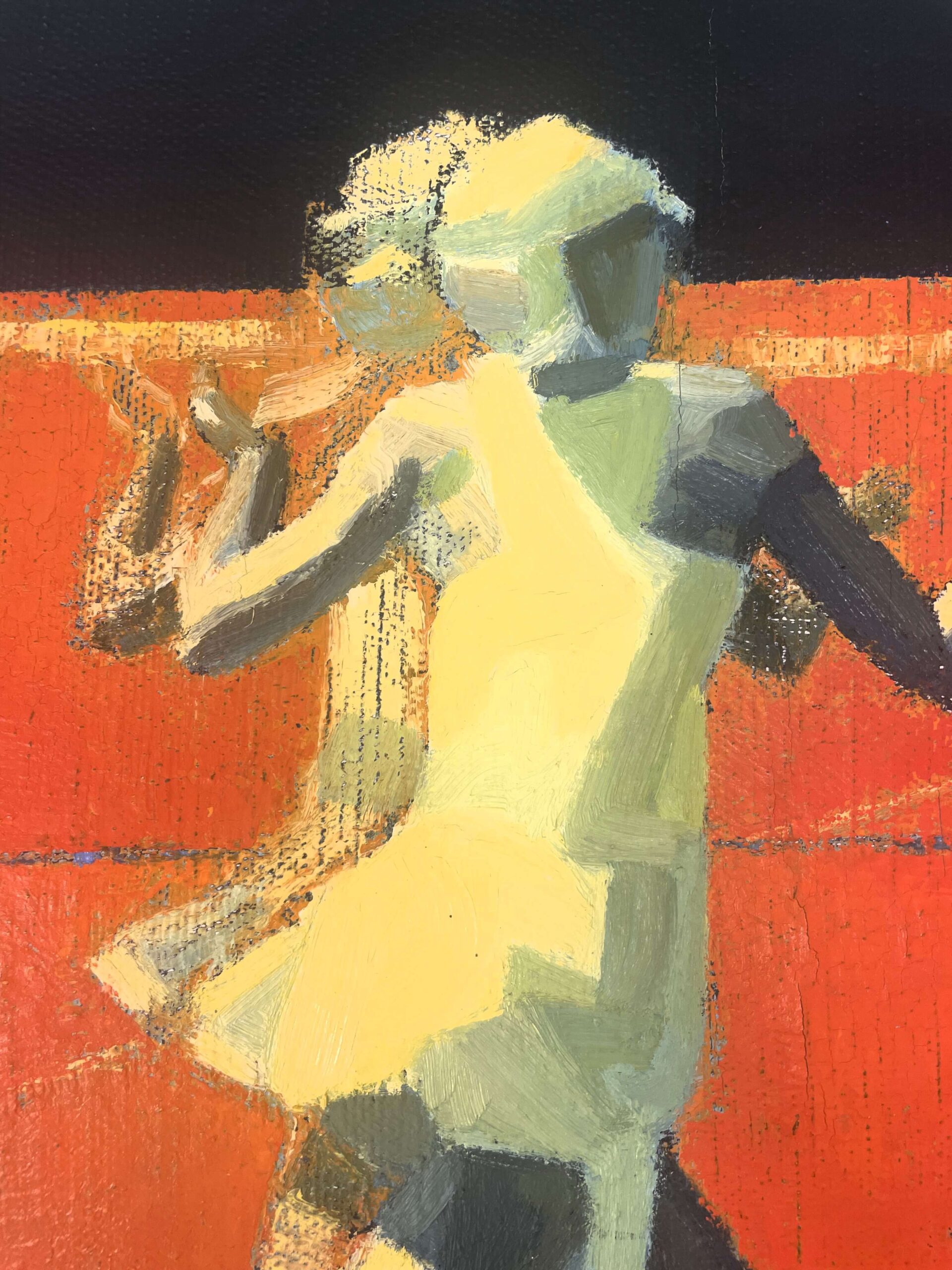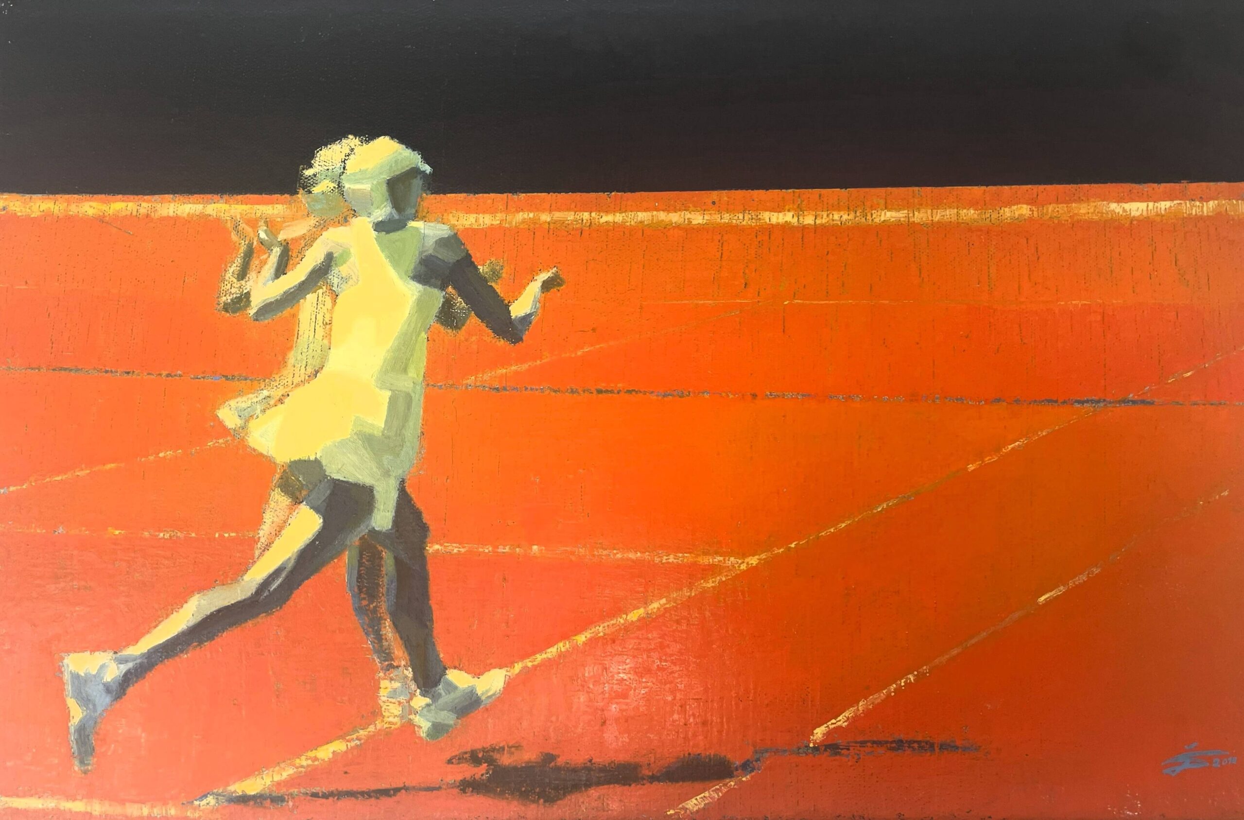 Tento obraz od Romana Ďurčeka zachycuje napjatý okamžik tenisového zápasu. Tenistka se soustředí a připravuje se podat svůj nejlepší výkon. Dynamická kompozice a výrazné pohyby postavy zdůrazňují energii, odhodlání a sportovního ducha.