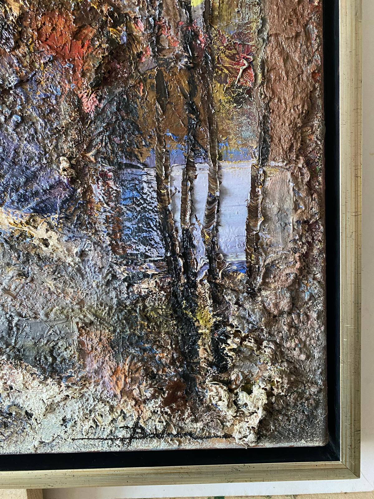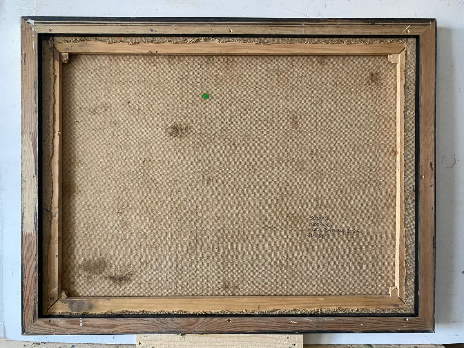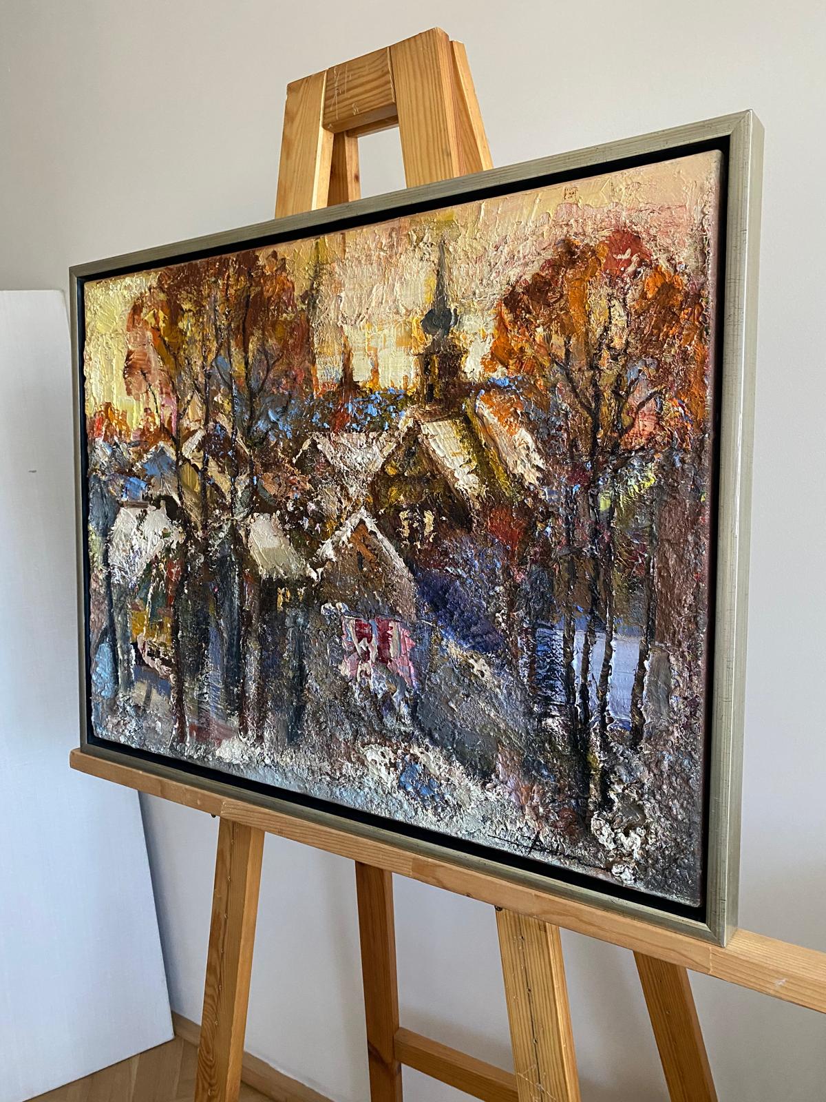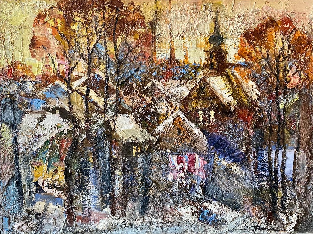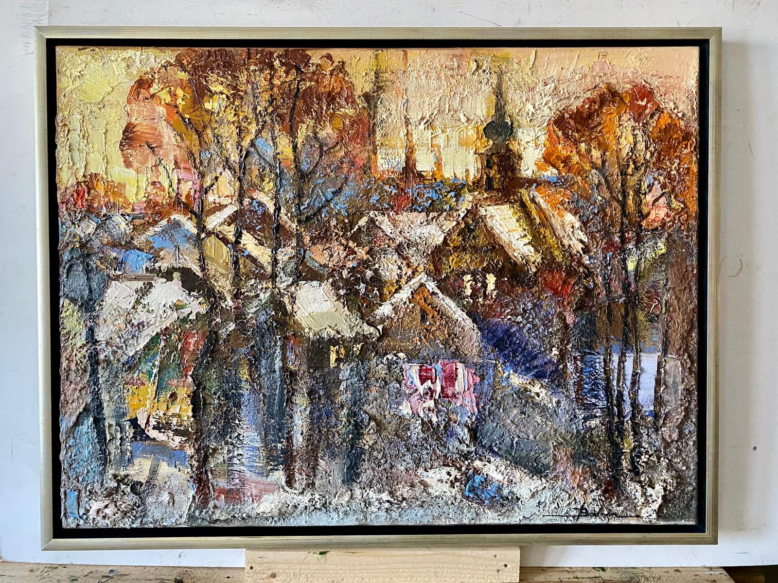 Obraz zobrazuje zimní krajinu s vesnickým motivem. Na plátně umělce vidíme zasněženou krajinu s domečky a stromy. Barevná paleta zahrnuje odstíny hnědé, krémové a bílé, které evokují klid a tichou atmosféru zimního rána. Olejomalba na plátně dodává obrazu texturu a hloubku.