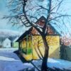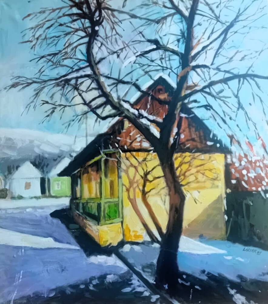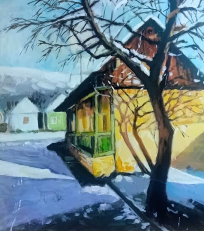 Obraz „Ze dvora II“ zachycuje klidnou zimní scénu vesnického dvora, kde se světlo a stín setkávají v jemné harmonii. Hlavním motivem je dům se žlutou fasádou a zeleným přístřeškem. Ten kontrastuje s chladnými modrými a šedými odstíny sněhu na dvoře. Holé stromy s jemnými větvemi vrhají dlouhé stíny a dodávají kompozici hloubku a dynamiku.