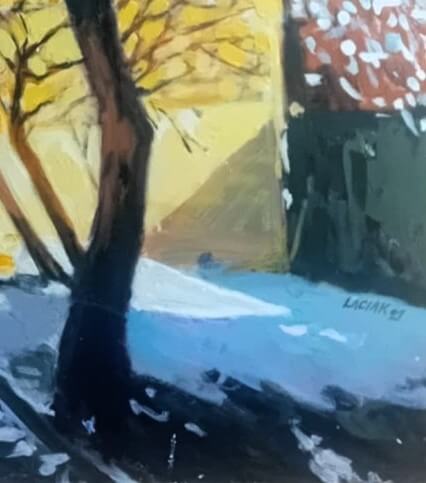 Světlo dopadající na stěnu domu vytváří pocit tepla a bezpečí uprostřed mrazivého zimního prostředí. Obraz působí introspektivně a navozuje atmosféru ticha a klidu. Divák může cítit kontrast mezi lidským, přítomným teplem a chladem zimy. Styl malby kombinuje realistické detaily s volnějším, expresivním tahem štětce, čímž vzniká dojem pohybu a života.