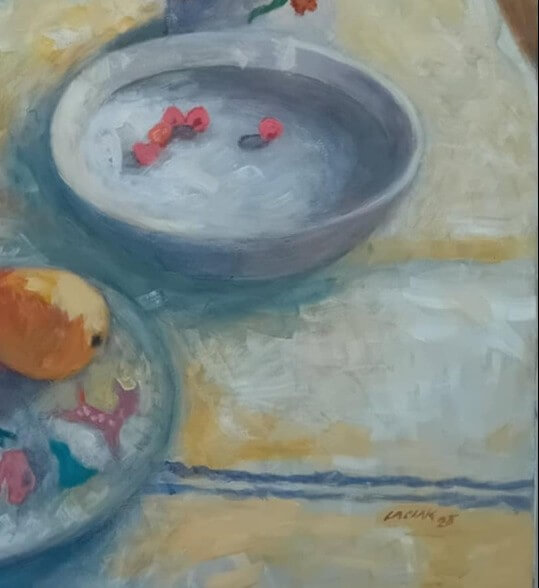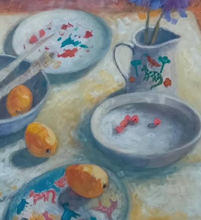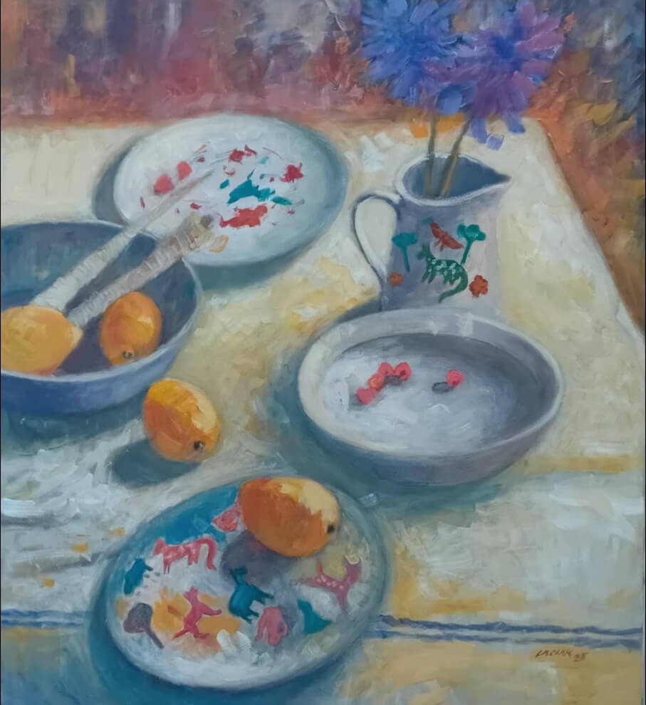 Obraz zachycuje zátiší se třemi až čtyřmi citrony a džbánem plným květin, který dominuje kompozici. Autor se soustředí na realistické zobrazení předmětů, jejich textur a barev. Citrony vyzařují svěžest a světlo odhaluje jejich jemné detaily, zatímco květiny v džbánu vnášejí do obrazu živé tóny a kontrast. Jemné odlesky a stínování dodávají zátiší hloubku a trojrozměrný efekt. Styl kombinuje přesnost s volnějšími tahy štětce, které vytvářejí pocit pohybu a života i v klidné scéně.